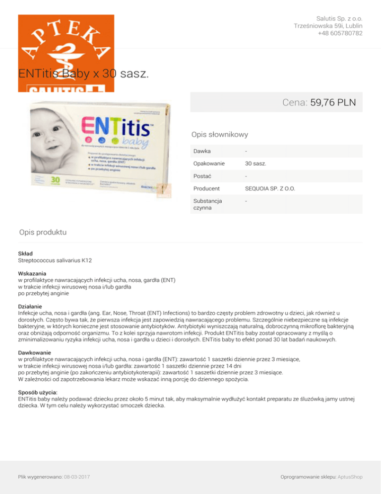 Salutis Sp. z o.o. Trześniowska 59i, Lublin +48 605780782 ENTitis Baby x 30 sasz. Cena: 59,76 PLN Opis słownikowy Dawka - Opakowanie 30 sasz. Postać - Producent SEQUOIA SP. Z O.O. Substancja czynna - Opis produktu Skład Streptococcus salivarius K12 Wskazania w profilaktyce nawracających infekcji ucha, nosa, gardła (ENT) w trakcie infekcji wirusowej nosa i/lub gardła po przebytej anginie Działanie Infekcje ucha, nosa i gardła (ang. Ear, Nose, Throat (ENT) Infections) to bardzo częsty problem zdrowotny u dzieci, jak również u dorosłych. Często bywa tak, że pierwsza infekcja jest zapowiedzią nawracającego problemu. Szczególnie niebezpieczne są infekcje bakteryjne, w których konieczne jest stosowanie antybiotyków. Antybiotyki wyniszczają naturalną, dobroczynną mikroflorę bakteryjną oraz obniżają odporność organizmu. To z kolei sprzyja nawrotom infekcji. Produkt ENTitis baby został opracowany z myślą o zminimalizowaniu ryzyka infekcji ucha, nosa i gardła u dzieci i dorosłych. ENTitis baby to efekt ponad 30 lat badań naukowych. Dawkowanie w profilaktyce nawracających infekcji ucha, nosa i gardła (ENT): zawartość 1 saszetki dziennie przez 3 miesiące, w trakcie infekcji wirusowej nosa i/lub gardła: zawartość 1 saszetki dziennie przez 14 dni po przebytej anginie (po zakończeniu antybiotykoterapii): zawartość 1 saszetki dziennie przez 3 miesiące. W zależności od zapotrzebowania lekarz może wskazać inną porcję do dziennego spożycia. Sposób użycia: ENTitis baby należy podawać dziecku przez około 5 minut tak, aby maksymalnie wydłużyć kontakt preparatu ze śluzówką jamy ustnej dziecka. W tym celu należy wykorzystać smoczek dziecka. Plik wygenerowano: 08-03-2017 Powered by TCPDF (www.tcpdf.org) Oprogramowanie sklepu: AptusShop