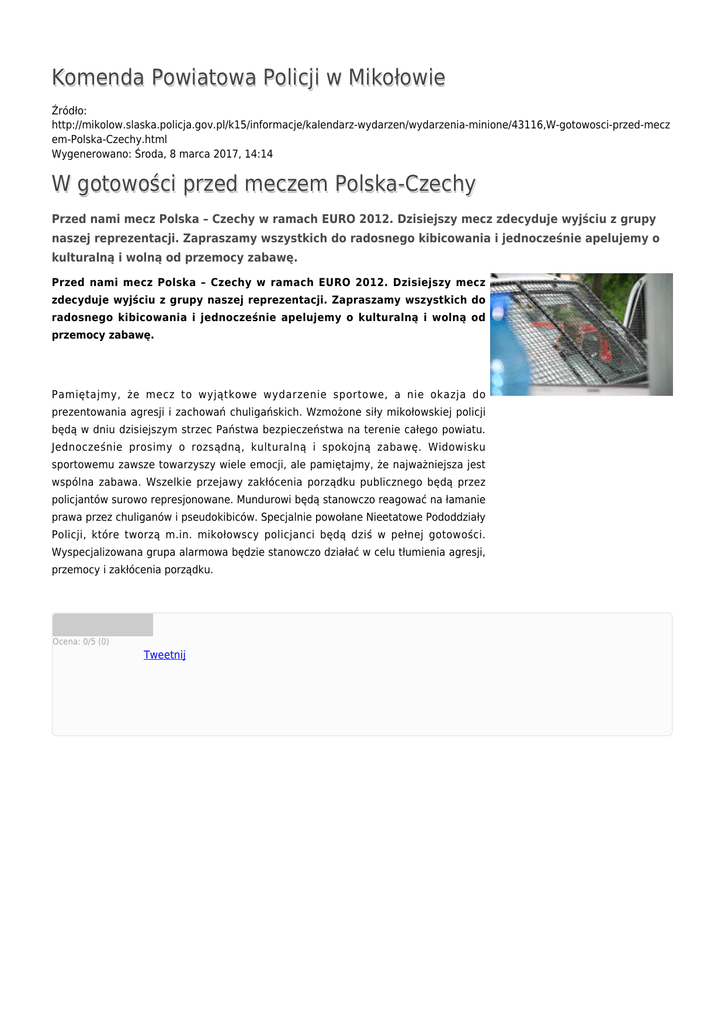 Komenda Powiatowa Policji w Mikołowie Źródło: http://mikolow.slaska.policja.gov.pl/k15/informacje/kalendarz-wydarzen/wydarzenia-minione/43116,W-gotowosci-przed-mecz em-Polska-Czechy.html Wygenerowano: Środa, 8 marca 2017, 14:14 W gotowości przed meczem Polska-Czechy Przed nami mecz Polska – Czechy w ramach EURO 2012. Dzisiejszy mecz zdecyduje wyjściu z grupy naszej reprezentacji. Zapraszamy wszystkich do radosnego kibicowania i jednocześnie apelujemy o kulturalną i wolną od przemocy zabawę. Przed nami mecz Polska – Czechy w ramach EURO 2012. Dzisiejszy mecz zdecyduje wyjściu z grupy naszej reprezentacji. Zapraszamy wszystkich do radosnego kibicowania i jednocześnie apelujemy o kulturalną i wolną od przemocy zabawę. Pamiętajmy, że mecz to wyjątkowe wydarzenie sportowe, a nie okazja do prezentowania agresji i zachowań chuligańskich. Wzmożone siły mikołowskiej policji będą w dniu dzisiejszym strzec Państwa bezpieczeństwa na terenie całego powiatu. Jednocześnie prosimy o rozsądną, kulturalną i spokojną zabawę. Widowisku sportowemu zawsze towarzyszy wiele emocji, ale pamiętajmy, że najważniejsza jest wspólna zabawa. Wszelkie przejawy zakłócenia porządku publicznego będą przez policjantów surowo represjonowane. Mundurowi będą stanowczo reagować na łamanie prawa przez chuliganów i pseudokibiców. Specjalnie powołane Nieetatowe Pododdziały Policji, które tworzą m.in. mikołowscy policjanci będą dziś w pełnej gotowości. Wyspecjalizowana grupa alarmowa będzie stanowczo działać w celu tłumienia agresji, przemocy i zakłócenia porządku. Ocena: 0/5 (0) Tweetnij