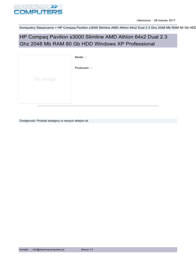 Utworzono : 08 marzec 2017 Komputery Stacjonarne > HP Compaq Pavilion s3000 Slimline AMD Athlon 64x2 Dual 2.3 Ghz 2048 Mb RAM 80 Gb HDD HP Compaq Pavilion s3000 Slimline AMD Athlon 64x2 Dual 2.3 Ghz 2048 Mb RAM 80 Gb HDD Windows XP Professional Model : - s r te Producent : - No image C a Dostępność: Produkt dostępny w naszym sklepie od m ro a M kontakt : - [email protected] Strona 1/1 m o u p