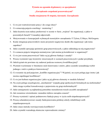 Pytania na egzamin dyplomowy ze specjalności „Zarządzanie