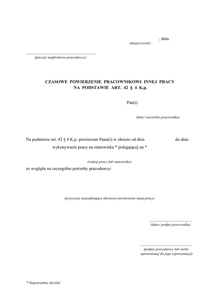 , dnia (miejscowość) ................................................................ (pieczęć nagłówkowa pracodawcy) CZASOWE POWIERZENIE PRACOWNIKOWI INNEJ PRACY NA PODSTAWIE ART.42 § 4 KS Pan(i) (imię i nazwisko pracownika) Na podstawie art. 42 § 4 K.p. powierzam Panu(i) w okresie od dnia do dnia wykonywanie pracy na stanowisku * polegającej na * (rodzaj pracy lub stanowisko) ze względu na szczególne potrzeby pracodawcy: (przyczyny uzasadniające okresowe powierzenie innej pracy) ....................................... (data i podpis pracownika) ............................................... (podpis pracodawcy lub osoby uprawnionej do jego reprezentacji) * Niepotrzebne skreślić.