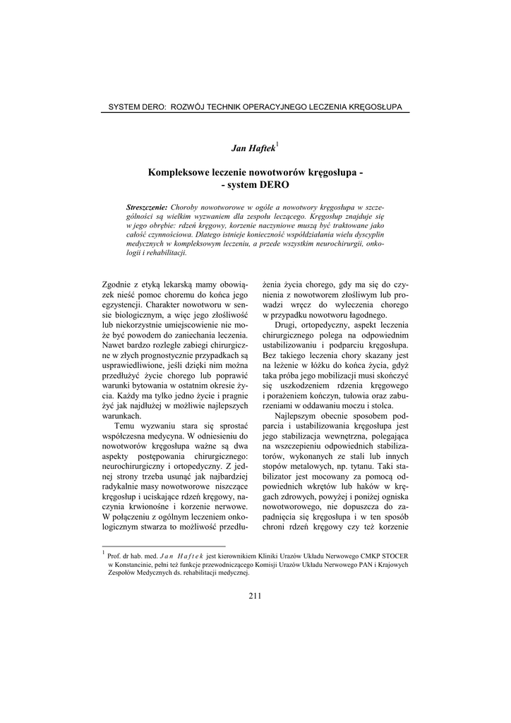 SYSTEM DERO: ROZWÓJ TECHNIK OPERACYJNEGO LECZENIA KRĘGOSŁUPA Jan Haftek1 Kompleksowe leczenie nowotworów kręgosłupa - system DERO Streszczenie: Choroby nowotworowe w ogóle a nowotwory kręgosłupa w szczególności są wielkim wyzwaniem dla zespołu leczącego. Kręgosłup znajduje się w jego obrębie: rdzeń kręgowy, korzenie naczyniowe muszą być traktowane jako całość czynnościowa. Dlatego istnieje konieczność współdziałania wielu dyscyplin medycznych w kompleksowym leczeniu, a przede wszystkim neurochirurgii, onkologii i rehabilitacji. Zgodnie z etyką lekarską mamy obowiązek nieść pomoc choremu do końca jego egzystencji. Charakter nowotworu w sensie biologicznym, a więc jego złośliwość lub niekorzystnie umiejscowienie nie może być powodem do zaniechania leczenia. Nawet bardzo rozległe zabiegi chirurgiczne w złych prognostycznie przypadkach są usprawiedliwione, jeśli dzięki nim można przedłużyć życie chorego lub poprawić warunki bytowania w ostatnim okresie życia. Każdy ma tylko jedno życie i pragnie żyć jak najdłużej w możliwie najlepszych warunkach. Temu wyzwaniu stara się sprostać współczesna medycyna. W odniesieniu do nowotworów kręgosłupa ważne są dwa aspekty postępowania chirurgicznego: neurochirurgiczny i ortopedyczny. Z jednej strony trzeba usunąć jak najbardziej radykalnie masy nowotworowe niszczące kręgosłup i uciskające rdzeń kręgowy, naczynia krwionośne i korzenie nerwowe. W połączeniu z ogólnym leczeniem onkologicznym stwarza to możliwość przedłu1 żenia życia chorego, gdy ma się do czynienia z nowotworem złośliwym lub prowadzi wręcz do wyleczenia chorego w przypadku nowotworu łagodnego. Drugi, ortopedyczny, aspekt leczenia chirurgicznego polega na odpowiednim ustabilizowaniu i podparciu kręgosłupa. Bez takiego leczenia chory skazany jest na leżenie w łóżku do końca życia, gdyż taka próba jego mobilizacji musi skończyć się uszkodzeniem rdzenia kręgowego i porażeniem kończyn, tułowia oraz zaburzeniami w oddawaniu moczu i stolca. Najlepszym obecnie sposobem podparcia i ustabilizowania kręgosłupa jest jego stabilizacja wewnętrzna, polegająca na wszczepieniu odpowiednich stabilizatorów, wykonanych ze stali lub innych stopów metalowych, np. tytanu. Taki stabilizator jest mocowany za pomocą odpowiednich wkrętów lub haków w kręgach zdrowych, powyżej i poniżej ogniska nowotworowego, nie dopuszcza do zapadnięcia się kręgosłupa i w ten sposób chroni rdzeń kręgowy czy też korzenie Prof. dr hab. med. J a n H a f t e k jest kierownikiem Kliniki Urazów Układu Nerwowego CMKP STOCER w Konstancinie, pełni też funkcje przewodniczącego Komisji Urazów Układu Nerwowego PAN i Krajowych Zespołów Medycznych ds. rehabilitacji medycznej. 211 212 nerwowe przed porażeniem. W niektórych przypadkach wszczepianie stabilizatora wewnętrznego kojarzy się z przeszczepami kostnymi, odtwarzającymi ciągłość kręgosłupa. Opracowano wiele typów stabilizatorów wewnętrznych. Wśród nich mamy produkt polskiej myśli technicznej - „uniwersalny system DERO” wytwarzany przez firmę LfC w Zielonej Górze. Stabilizator powstał w ścisłej współpracy inżynierów i ortopedów. Zgodnie z nazwą, jest to rzeczywiście system uniwersalny. Poszczególne jego odmiany mogą być użyte przy stabilizacji kręgosłupa na każdym poziomie: od połączenia czaszkowokręgosłupowego do kości krzyżowej. Przy stabilizacji wewnętrznej z dojścia przedniego można zaopatrzyć kręgosłup szyjny, kręgosłup piersiowy przez klatkę piersiową i kręgosłup lędźwiowy od strony brzusznej. Szczególną zaletą systemu DERO jest możliwość podparcia i ustabilizowania kręgosłupa na bardzo długim odcinku - na przykład od kości krzyżowej aż do górnych kręgów piersiowych. Taka potrzeba pojawia się przy rozległych nowotworach lub licznych ogniskach przerzutowych. (ryc.1. a i b). Wreszcie ostatnią i ważną zaletą systemu DERO jest jego niska cena w porównaniu z produktami importowanymi. Dzięki temu możliwe jest dość powszech- J. Haftek ne zaopatrzenie chorych wymagających zastosowania stabilizacji wewnętrznej kręgosłupa. Ryc.1 Dzięki zastosowaniu stabilizacji wewnętrznej kręgosłupa chorzy, nawet ze złośliwymi nowotworami kręgosłupa, mogą do końca swoich dni poruszać się bez bólu, przebywać w domu wśród najbliższych, samodzielnie wykonywać czynności związane z samoobsługą, normalnie oddawać mocz i stolec. I jeśli jeszcze nie potrafimy zwalczyć do końca choroby nowotworowej, to przynajmniej jesteśmy w stanie skutecznie przeciwstawić się skutkom zniszczenia kręgosłupa.