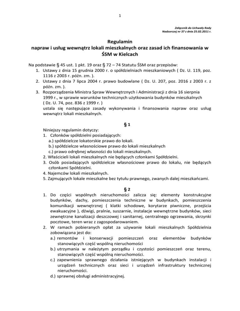 1 Załącznik do Uchwały Rady Nadzorczej nr 37 z dnia 25.02.2011 r. Regulamin napraw i usług wewnątrz lokali mieszkalnych oraz zasad ich finansowania w ŚSM w Kielcach Na podstawie § 45 ust. 1 pkt. 19 oraz § 72 – 74 Statutu ŚSM oraz przepisów: 1. Ustawy z dnia 15 grudnia 2000 r. o spółdzielniach mieszkaniowych ( Dz. U. 119, poz. 1116 z 2003 r. późn. zm. ). 2. Ustawy z dnia 7 lipca 2004 r. prawo budowlane ( Dz. U. 207, poz. 2016 z 2003 r. z późn. zm. ). 3. Rozporządzenia Ministra Spraw Wewnętrznych i Administracji z dnia 16 sierpnia 1999 r., w sprawie warunków technicznych użytkowania budynków mieszkalnych ( Dz. U. 74, poz. 836 z 1999 r. ) ustala się następujące zasady wykonywania i finansowania napraw oraz usług wewnątrz lokali mieszkalnych. §1 Niniejszy regulamin dotyczy: 1. Członków spółdzielni posiadających: a.) spółdzielcze lokatorskie prawo do lokali. b.) spółdzielcze własnościowe prawo do lokali mieszkalnych c.) prawo odrębnej własności do lokali mieszkalnych. 2. Właścicieli lokali mieszkalnych nie będących członkami Spółdzielni. 3. Osób posiadających spółdzielcze własnościowe prawo do lokalu, nie będących członkami Spółdzielni. 4. Najemców lokali mieszkalnych. 5. Zajmujących lokale mieszkalne bez tytułu prawnego, zwanych dalej mieszkaocami. §2 1. Do części wspólnych nieruchomości zalicza się: elementy konstrukcyjne budynków, dachy, pomieszczenia techniczne w budynkach, pomieszczenia komunikacji wewnętrznej ( klatki schodowe, korytarze piwniczne, przejścia ewakuacyjne ), dźwigi, pralnie, suszarnie, instalacje wewnętrzne budynków, sieci zewnętrzne kanalizacji deszczowej i sanitarnej, centralnego ogrzewania, skrzynki pocztowe, teren wraz z zagospodarowaniem. 2. W ramach pobieranych opłat za używanie lokali mieszkalnych Spółdzielnia zobowiązana jest do: a.) remontów i konserwacji pomieszczeo oraz elementów budynków stanowiących częśd wspólną nieruchomości b.) utrzymania w należytym porządku i czystości pomieszczeo oraz terenu, stanowiących częśd wspólną nieruchomości. c.) zapewnienia sprawnego działania istniejących w budynkach instalacji i urządzeo technicznych oraz sieci i urządzeo infrastruktury technicznej nieruchomości. d.) sprawnej obsługi administracyjnej. 2 §3 Mieszkaocy Spółdzielni zobowiązani są: 1. Utrzymywad zajmowany lokal wraz z urządzeniami technicznymi oraz piwnicami w należytej czystości i właściwym stanie technicznym, okresowo je odnawiad na własny koszt oraz usuwad uszkodzenia powstałe z ich winy. 2. Udostępniad zajmowany lokal w celu dokonywania przeglądów, montażu i odczytu urządzeo pomiarowych oraz dokonywania niezbędnych napraw i usuwania awarii. O terminie tych prac Spółdzielnia ma obowiązek powiadomid mieszkaoców ze stosownym wyprzedzeniem. §4 1. Obowiązki Spółdzielni w zakresie napraw i usług wewnątrz lokali mieszkalnych obejmują: 1) Naprawy, konserwacje oraz wymianę: a) wewnętrznej instalacji gazowej bez urządzeo odbiorczych (piecyk, kuchenka), b) instalacji centralnego ogrzewania wraz z grzejnikami żeliwnymi członowymi, c) zbiorczej anteny RTV d) zapewnienie drożności przewodów spalinowych i wentylacyjnych 2) Naprawy, konserwacje oraz zwrot ryczałtowych kosztów wymiany: a) wewnętrznej instalacji elektrycznej, b) wewnętrznej instalacji wodociągowej bez urządzeo odbiorczych, c) wewnętrznej instalacji kanalizacyjnej, w tym przewodów odpływowych, bez urządzeo odbiorczych 3) Zwrot ryczałtowych kosztów wymiany zużytej stolarki okiennej oraz drzwi wejściowych do mieszkania, rozumiany jest jako koszt nakładów robocizny i materiałów dodatkowych. Wymiana rozumiana jest jako demontaż starej stolarki i montaż nowej. Koszt zakupu stolarki obciąża lokatora. Nowe drzwi wejściowe do lokalu mieszkalnego powinny otwierad się do środka mieszkania i mied wymiary zgodne ze starymi drzwiami. Nowa stolarka okienna powinna mied kolorystykę zewnętrzną, wymiary i układ kwater zgodny z rysunkiem otrzymanym ze Spółdzielni przy pobieraniu wniosku o wypłacenie zwrotu kosztów. Stolarka powinna byd zamontowana zgodnie ze sztuką budowlaną oraz warunkami jak wyżej. Niespełnienie opisanych wyżej warunków skutkowad będzie odmową zwrotu kosztów wymiany stolarki. Za wszelkie szkody związane z nieprawidłowym zamontowaniem stolarki odpowiada osoba posiadająca tytuł prawny do lokalu. 4) Przeglądy i pomiary wynikające z prawa budowlanego. 5) Montaż nawiewników okiennych. 6) Dostawę wodomierzy do mieszkao nieopomiarowanych – montaż na koszt lokatora. Legalizację zamontowanych wodomierzy zgodnie z obowiązującymi przepisami 7) Naprawy polegające na usunięciu uszkodzeo wewnątrz lokalu, powstałych w związku z prowadzonymi przez Spółdzielnię pracami remontowymi i eksploatacyjnymi lub w wyniku nie wykonania napraw należących do obowiązku Spółdzielni. Obowiązek naprawy obejmuje zakres w wymiarze faktycznych uszkodzeo powstałych z winy Spółdzielni. 8) Montaż nowych oraz remont i konserwację istniejących domofonów: 3 a) montaż nowych oraz remont istniejących instalacji domofonowych dotychczas nie przejętych przez Spółdzielnię dokonywany jest przez Spółdzielnię na wniosek nie mniej niż 70% mieszkaoców klatki schodowej, b) finansowanie nie obejmuje urządzenia odbiorczego (unifonu) zainstalowanego w mieszkaniu. Koszt unifonu ponosi lokator, c) konserwację i remonty zamontowanych instalacji domofonowych przejmuje Spółdzielnia. 9) Wymiana lub legalizacja ciepłomierzy indywidualnych (dot. ul. Klonowa 42c), 10) Dezynsekcję, deratyzację i dezynfekcję. 11) Montaż podzielników kosztów c.o. 2. Zwrot ryczałtowych kosztów wymian, o których mowa w ust. 1 pkt 2 i 3 przypisany jest do lokalu i przysługuje raz na 30 lat. Wysokośd ryczałtów oraz zasady ubiegania się o ich wypłatę ustala Zarząd Spółdzielni. 3. Wykonanie prac wymienionych w ust. 1 pkt 1÷10 finansowane jest ze ś