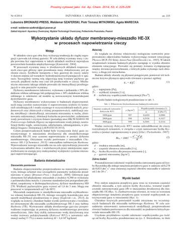 Prosimy cytować jako: Inż. Ap. Chem. 2014, 53, 4, 225-226 INŻYNIERIA I APARATURA CHEMICZNA Nr 4/2014 str. 225 Lubomira BRONIARZ-PRESS, Waldemar SZAFERSKI, Piotr Tomasz MITKOWSKI, Agata MARECKA e-mail: [email protected] Zakład Inżynierii i Aparatury Chemicznej, Wydział Technologii Chemicznej, Politechnika Poznańska, Poznań Wykorzystanie układu dyfuzor membranowy-mieszadło HE-3X w procesach napowietrzania cieczy Wstęp W układzie ciecz-gaz obie fazy wykazują tendencję do ciągłej segregacji z powodu ich różnej gęstości. W celu dobrej wymiany masy i ciepła powinna być zapewniona w takich układach możliwie największa powierzchnia kontaktu międzyfazowego [Kamieński, 2004]. W procesach wymiany masy w dwufazowych układach rozproszonych ciecz-gaz główny opór przenikania masy zlokalizowany jest po stronie cieczy. Szybkość transportu z fazy gazowej do cieczy zależy w dużym stopniu od warunków hydrodynamicznych panujących w aparacie. Szczególnie istotną rolę odgrywają tutaj wymiary pęcherzy gazowych, prędkość ruchu oraz czas ich przebywania w cieczy. Mechaniczne mieszanie takiego układu prowadzi do intensyfikacji przebiegających w nim procesów wymiany. Dyfuzory membranowe talerzowe, wykonane z poliamidu z 30% dodatkiem włókna szklanego lub polipropylenu z 30% dodatkiem włókna szklanego w zależności od modelu są nowoczesnymi konstrukcjami dystrybutorów gazu. Dyfuzory membranowe wykorzystane w badaniach eksperymentalnych mają szerokie zastosowanie w napowietrzaniu ścieków (w komorach uśredniających i osadu czynnego w oczyszczalniach małych, przydomowych oraz zbiorczych o różnej przepustowości), stabilizacji osadu, nitryfikacji i denitryfikacji, utrzymaniu mieszaniny w ruchu, eliminowaniu sedymentacji, eliminacji kożucha na powierzchni, uzdatnianiu wody powietrzem i czystym tlenem (posiadają atest HK/W/0249/01/99 Państwowego Zakładu Higieny na napowietrzanie wody pitnej), neutralizacji tlenku węgla¸ ozonowaniu, odżelazianiu, odmanganianiu, w produkcji biogazu i fermentacji [AKWATECH,2014]. Celem przeprowadzonych badań było wyznaczenie ilości gazu zatrzymywanego w mieszaninie dwufazowej dla zmodyfikowanego mieszadła HE-3X oraz systemu napowietrzania w postaci dyfuzora membranowego. Otrzymane wyniki porównano z mieszadłem Chemineer HE-3 [Chemineer, 2013] i mieszadłem turbinowym Rushtona. Wprowadzenie nowego mieszadła ma na celu optymalizację procesów wytwarzania układów dwu- i wielofazowych przez zmniejszenie zapotrzebowania na energię przy maksymalnej wydajności systemu mieszająco-napowietrzającego. Badania doświadczalne Stanowisko pomiarowe Badania eksperymentalne przeprowadzono na stanowisku pomiarowym, którego schemat oraz szczegółowe parametry techniczne przedstawiono w pracy [Broniarz-Press i Szaferski, 2008]. Głównym jego elementem był płaskodenny mieszalnik o średnicy 0,300 m wykonany z polimetakrylanu metylu z czteroma standardowymi przegrodami płaskimi, zaopatrzony w drobnopęcherzykowy, dyfuzor membranowy HD 270. Wielkość pęcherzyków gazu wynosi od 1,8 do 3 mm. Mogą one pracować w temperaturach od 5 do 80°C. Mieszalnik zaopatrzono w zmodyfikowane mieszadło szybkoobrotowe własnej konstrukcji HE-3X, którego szczegóły konstrukcyjne oraz sposób modyfikacji przedstawiono w pracy [Szaferski i in., 2013]. Ze względu na testowy charakter badań wyniki porównywano z rezultatami otrzymanymi dla mieszadła szybkoobrotowego HE-3 oraz turbiny Rushtona (TR). Wytwarzanie układu dwufazowego gaz-ciez przeprowadzono rozpraszając za pomocą dyfuzora membranowego powietrze atmosferyczne. Jako fazę ciekłą zastosowano wodę destylowaną oraz wodne roztwory poliakryloamidu (Rokrysol WF1) o zawartości sub6 stancji suchej 5÷7%) o masie molowej M = 4,4·10 kg/kmol. Materiały Ze względu na złożone właściwości reologiczne roztworów przeprowadzono odpowiednie badania wykorzystując reometr rotacyjnego Physica MCR-501 firmy Anton Paar [Kembłowski i in., 1985]. W takich urządzeniach ścinanie badanych płynów następuje w wyniku obrotów elementu rotacyjnego. Prowadzi się pomiary ścinania występującego między dwiema powierzchniami, z których jedna wykonuje ruch obrotowy, a druga jest nieruchoma. Badane układy okazały się płynami potęgowymi, ponieważ ich techniczne krzywe płynięcia opisywało równanie o postaci ogólnej: m (1) x w = Kco w gdzie: τw – naprężenie [Pa], co w – szybkość ścinania [1/s], K – techniczny współczynnik konsystencji [Pa⋅sm]. Wyniki badań reologicznych przedstawiono w tab. 1. Tab. 1. Właściwości fizykochemiczne badanych roztworów Stężenie wodnych roztworów Rokrysolu WF1 ρ [kg/m3] 1000 ppm 2000 ppm 3000 ppm Współczynniki równania (1) m m K [Pa⋅s ] 997 0,6494 0,0906 998 0,5936 0,1637 999 0,5491 0,3216 Wodne roztwory Rokrysolu WF1 można zakwalifikować do cieczy rozrzedzanych ścinaniem, w związku z czym zastosowano liczbę Reynoldsa o postaci zaproponowanej w pracy [Gluz i Pavlushenko, 1967]: Rem = (4r) 1-m n2 -m d2 t K (2) gdzie: d – średnica mieszadła [m], n – częstość obrotowa mieszadła [1/s], Rem – liczba Reynoldsa dla procesu mieszania [-], ρ – gęstość mieszaniny [kg/m3]. Zakres badań Przeanalizowano zależność współczynnika zatrzymania gazu od liczby Reynoldsa dla stałego natężenia przepływu gazu w zakresie od 0,278 do 0,833 dm3·s-1 oraz zmiennej częstości obrotów mieszadła w zakresie od 2 do 20 s-1. Wyniki badań Przy stałym natężeniu przepływu gazu wraz ze wzrostem częstości obrotów mieszadła, a tym samym liczby Reynoldsa, wzrastał współczynnik zatrzymywania gazu (Φ) w mieszaninie dwufazowej dla mieszadła HE-3X (Rys. 1). Zaobserwowano również, że wraz ze wzrostem objętościowego natężenia przepływu gazu wzrastał współczynnik zatrzymywania gazu w mieszaninie (Rys. 1). Charakter krzywych potwierdził wyniki otrzymane we wcześniejszych badaniach dla mieszadła turbinowego