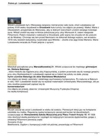 Polmic.pl - Lutoslawski - warszawiak Witold Lutosławski był z Warszawą związany niemal przez całe życie, choć Lutosławscy od połowy XVIII wieku rezydowali w Drozdowie koło Łomży (na zdjęciu po prawej). Matka, Maria z Olszewskich, przyjechała do Warszawy, aby w dobrych warunkach urodzić swojego trzeciego syna. Witold urodził się więc w klinice położniczej przy ulicy Moniuszki 6, zatem nieopodal Filharmonii. Potem mieszkał z rodzicami w Drozdowie, póki wojna nie zmusiła ich do ucieczki aż do Moskwy. Chroniąc się tam przed Niemcami nie dokonali dobrego wyboru, we wrześniu 1918 roku bowiem bolszewicy rozstrzelali ojca Witolda – Józefa oraz jego brata Mariana. Maria Lutosławska wracała do Polski jedynie z synami. Mieszkali początkowo przy Marszałkowskiej 21. Witold uczęszczał do męskiego gimnazjum im. Stefana Batorego , które mieściło się najpierw przy ulicy Kapucyńskiej, a potem przeniosło się do nowego gmachu przy ulicy Myśliwieckiej 6. Lutosławski zapisał się w historii tej szkoły na stałe, pisząc hymn uczniów Batorego do słów Stanisława Młodożeńca (na zdjęciu po lewej), polonisty i ostatniego wychowawcy kompozytora. Po maturze w Batorym w roku 1931 Lutosławski dostał się na wydział matematyki Uniwersytetu Warszawskiego, ale po roku studiów postanowił zapisać się do konserwatorium (na zdjęciu po prawej, obecnie: Uniwersytet Muzyczny Fryderyka Chopina) na naukę kompozycji. Muzyki zaczął się uczyć Lutosławski w wieku lat sześciu. Pierwszych lekcji gry na fortepianie udzielała mu matka. Regularną naukę kompozycji zaczął pod koniec lat dwudziestych, uczęszczając do Warszawskiej Szkoły Muzycznej przy Placu Trzech Krzyży 18. W 1936 roku skończył studia pianistyczne i wystąpił na tradycyjnym koncercie dyplomantów, grając z orkiestrą Filharmonii pierwszą część Koncertu G-dur Beethovena. Dyplom z kompozycji zrobił rok później, prezentując w Filharmonii 1/5 Polmic.pl - Lutoslawski - warszawiak Fugę na orkiestrę . W roku 1935, więc jeszcze w czasie studiów, podjął Lutosławski na krótko pracę w Polskim Radiu. Jako „kontroler” słuchał audycji muzycznych i recenzował je dla kierownictwa redakcji „w celu ulepszania programu” – jak wspominał. Wybuch II wojny światowej zastał Lutosławskiego na stanowisku dowódcy radiostacji przy sztabie Armii Kraków. Był tam rekordzistą w obsługiwaniu telegrafu alfabetem Morse’a, do czego przyczyniła się z pewnością jego sprawność palcowa jako pianisty. Pod Tomaszowem Lubelskim dostał się do niewoli niemieckiej, z której udało mu się zbiec w czasie wyprawy do lasu po drewno na opał. Pod koniec października zdołał wrócić do Warszawy. Razem z matką zamieszkał na czas okupacji przy ulicy Langiewicza. Podczas wojny Lutosławski zarabiał na życie jako pianista w warszawskich kawiarniach. Zaczął od „Ziemiańskiej” przy ulicy Mazowieckiej, gdzie akompaniował znanemu przed wojną Chórowi „Dana”. Potem założył z Andrzejem Panufnikiem duet fortepianowy i występował razem z nim w „Arii”, też na Mazowieckiej, gdzie poznał swoją przyszłą żonę Danutę, siostrę Stanisława Dygata. Grał również „U Aktorek” w Alejach Ujazdowskich i – najdłużej - w SiM („Sztuka i Moda”) przy Królewskiej, gdzie dziś stoi hotel „Victoria”. Występował też w prywatnych mieszkaniach, między innymi w domu Jarosława Iwaszkiewicza w Stawisku. Pod koniec lipca 1944 Lutosławcy musieli opuścić mieszkanie na Langiewicza i przenieśli się do Komorowa, gdzie mieszkała siostra matki. Kompozytor, sądząc że wyjeżdżają z Warszawy na krótko, zabrał ze sobą tylko jedną partyturę. Cała reszta przepadła podczas Powstania Warszawskiego. W grudniu kompozytor znalazł się – jak wielu innych uchodźców ze zniszczonej Warszawy - w Krakowie. Natychmiast po wyzwoleniu Warszawy Lutosławski wrócił do stolicy i zamieszkał wraz z matką w wynajętym pokoju w Alei Waszyngtona na Saskiej Kępie. W kwietniu 1945 roku podjął pracę w Polskim Radiu, mieszczącym się od niedawna w pałacyku Czetwertyńskich przy Alejach Ujazdowskich. Pełnił tam rolę ilustratora muzycznego w programach redakcji literacko-teatralnej. W marcu 1946 roku zrezygnował ze stałej pracy w radiu i odtąd juz nigdy nie zajmował żadnego etatu. Podjął współpracę z filmem, zyskując duże uznanie za muzykę do filmu Tadeusza Makarczyńskiego Suita warszawska, którą określono jako „poetycką panoramę ruin Warszawy”. 2/5 Polmic.pl - Lutoslawski - warszawiak 26 października 1946 roku Lutosławski zawarł małżeństwo z Danutą Bogusławską z domu Dygat i zaadoptował jej syna z pierwszego związku – Marcina. Rodzina zamieszkała przy ul. Zwycięzców 39 m. 10 na Saskiej Kępie , w kwaterunkowym mieszkaniu otrzymanym w zamian za sprzedaż ruin domu Antoniego Dygata, ojca Danuty. Przez rok trwała odbudowa domu uszkodzonego podczas wojennych bombardowań, zanim udało się stworzyć znośne warunki do zamieszkania. Na przełomie sierpnia i września 1946 roku Lutosławski został sekretarzem i skarbnikiem utworzonego rok wcześniej przez ministerstwo kultury i sztuki Związku Kompozytorów Polskich . Związek miał swoją siedzibę najpierw na Chmielnej 25 m. 15, potem otrzymał lokal przy ul. Zgoda 15, ostatecznie znalazł się na Rynku Starego Miasta 27 (na zdjęciu po lewej). Lutosławski związał się z nim na dobre i złe, choć wycofywał się z czynnego udziału, kiedy upolitycznienie związkowego życia stawało się nieznośne, jak w roku 1948. Koncentrował się wówczas na własnej pracy twórczej, za którą uhonorowano go w grudniu 1948 roku nagrodą miasta Warszawy (nie przyznano wówczas Lutosławskiemu nagrody państwowej). W znacznej mierze ze względów finansowych zaangażował się w pisanie muzyki do sztuk wystawianych w teatrach warszawskich. Powstały ilustracje do spektakli w Teatrze Polskim, Rozmait