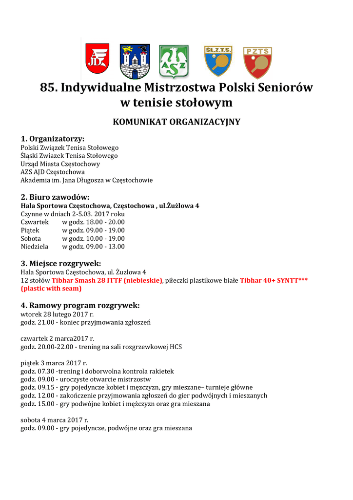 85. Indywidualne Mistrzostwa Polski Seniorów w tenisie stołowym KOMUNIKAT ORGANIZACYJNY 1. Organizatorzy: Polski Związek Tenisa Stołowego Śląski Zwiazek Tenisa Stołowego Urząd Miasta Częstochowy AZS AJD Częstochowa Akademia im. Jana Długosza w Częstochowie 2. Biuro zawodów: Hala Sportowa Częstochowa, Częstochowa , ul.Żużlowa 4 Czynne w dniach 2-5.03. 2017 roku Czwartek w godz. 18.00 - 20.00 Piątek w godz. 09.00 - 19.00 Sobota w godz. 10.00 - 19.00 Niedziela w godz. 09.00 - 13.00 3. Miejsce rozgrywek: Hala Sportowa Częstochowa, ul. Żuzlowa 4 12 stołów Tibhar Smash 28 ITTF (niebieskie), piłeczki plastikowe białe Tibhar 40+ SYNTT*** (plastic with seam) 4. Ramowy program rozgrywek: wtorek 28 lutego 2017 r. godz. 21.00 - koniec przyjmowania zgłoszeń czwartek 2 marca2017 r. godz. 20.00-22.00 - trening na sali rozgrzewkowej HCS piątek 3 marca 2017 r. godz. 07.30 -trening i doborwolna kontrola rakietek godz. 09.00 - uroczyste otwarcie mistrzostw godz. 09.15 - gry pojedyncze kobiet i męzczyzn, gry mieszane– turnieje główne godz. 12.00 - zakończenie przyjmowania zgłoszeń do gier podwójnych i mieszanych godz. 15.00 - gry podwójne kobiet i mężczyzn oraz gra mieszana sobota 4 marca 2017 r. godz. 09.00 - gry pojedyncze, podwójne oraz gra mieszana niedziela 5 marca 2017 r. godz.10.00 - finały gra mieszana, gra podwójna kobiet, gra podwójna mężczyzn, gra pojedyncza kobiet , gra pojedyncza męzczyzn 5. Zgłoszenia i wpisowe: Zgłoszenie do mistrzostw należy dokonać wypełniając kartę zgłoszeniową oraz przesyłając ją w nieprzekraczalnym terminie do 28 lutego 2017 r. do godz. 21.00 na adresy e-mailowe: [email protected] oraz [email protected] wraz z potwierdzeniem dokonania opłaty wpisowego 120 zł od zawodniczki lub zawodnika na konto: nr konta 92 1140 1889 0000 2433 9100 1001 AZS AJD, 42-200 Częstochowa ul. Zbierskiego 6 6. System rozgrywek: Zawody zostana rozegrane zgodnie z pkt. 7.8 Regulaminu Rozgrywek PZTS na sezon 2016/2017 7. Zakwaterowanie i wyżywienie: Proponujemy wyżywienie: obiady w Hali Sportowej Częstochowa ul. Zużlowej 4 w cenie 13 zł ( piątek i sobota) rezerwacja obiadu do 23 lutego na maila [email protected] i wpłata na konto AZS AJD (powyżej). Zakwaterowanie: Uczestnicy zawodów rezerwują noclegi we własnym zakresie Polecamy Hotel*** Scout (2,9 km do hali zawodów) hasło IMP ul. Drogowców 12, 42-200 Częstochowa Tel. 34 361 58 99, 34 361 56 62 / 605 230 773 email: hotel @scout.pl (hasło IMP) pokój 1 os. ze śniadaniem 155 zł pokój 2 os. ze śniadaniem 195 zł pokój 3 os. ze śniadaniem 235 zł pokój 4 os. ze śniadaniem 295 zł Hotel *** Złote Arkady (4,0 km do hali zawodów) hasło IMP ul. Boya –Żeleńskiego 12 , 42-200 Częstochowa Tel. 34 3614403 pokój 1.os. ze śniadaniem 140 zł pokój 2 os. ze śniadaniem 190 zł 8. Ubezpieczenie, badanie lekarskie: Każdy z uczestników mistrzostw powinien posiadać ubezpieczenie i aktualne badanie lekarskie 9. Zasady finansowania: Koszty organizacyjne pokrywają organizatorzy, koszty uczestnictwa pokrywają uczestnicy. 10. Nagrody: Zawodniczki i zawodnicy, którzy zajęli 1,2 i 3-4 miejsca w turnieju głównym otrzymują medale, dyplomy, puchary oraz nagrody finansowe o łacznej wartości 30000 zł. Przewodniczący Komitetu Organizacyjnego dr Wiesław Pięta