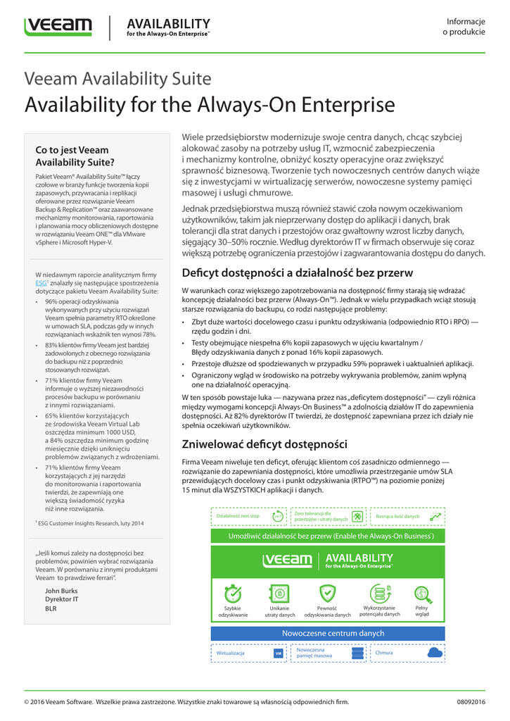 Informacje o produkcie Veeam Availability Suite Availability for the Always-On Enterprise Co to jest Veeam Availability Suite? Pakiet Veeam® Availability Suite™ łączy czołowe w branży funkcje tworzenia kopii zapasowych, przywracania i replikacji oferowane przez rozwiązanie Veeam Backup & Replication™ oraz zaawansowane mechanizmy monitorowania, raportowania i planowania mocy obliczeniowych dostępne w rozwiązaniu Veeam ONE™ dla VMware vSphere i Microsoft Hyper-V. W niedawnym raporcie analitycznym firmy ESG1 znalazły się następujące spostrzeżenia dotyczące pakietu Veeam Availability Suite: • 96% operacji odzyskiwania wykonywanych przy użyciu rozwiązań Veeam spełnia parametry RTO określone w umowach SLA, podczas gdy w innych rozwiązaniach wskaźnik ten wynosi 78%. • 83% klientów firmy Veeam jest bardziej zadowolonych z obecnego rozwiązania do backupu niż z poprzednio stosowanych rozwiązań. • 71% klientów firmy Veeam informuje o wyższej niezawodności procesów backupu w porównaniu z innymi rozwiązaniami. • 65% klientów korzystających ze środowiska Veeam Virtual Lab oszczędza minimum 1000 USD, a 84% oszczędza minimum godzinę miesięcznie dzięki uniknięciu problemów związanych z wdrożeniami. • 71% klientów firmy Veeam korzystających z jej narzędzi do monitorowania i raportowania twierdzi, że zapewniają one większą świadomość ryzyka niż inne rozwiązania. Wiele przedsiębiorstw modernizuje swoje centra danych, chcąc szybciej alokować zasoby na potrzeby usług IT, wzmocnić zabezpieczenia i mechanizmy kontrolne, obniżyć koszty operacyjne oraz zwiększyć sprawność biznesową. Tworzenie tych nowoczesnych centrów danych wiąże się z inwestycjami w wirtualizację serwerów, nowoczesne systemy pamięci masowej i usługi chmurowe. Jednak przedsiębiorstwa muszą również stawić czoła nowym oczekiwaniom użytkowników, takim jak nieprzerwany dostęp do aplikacji i danych, brak tolerancji dla strat danych i przestojów oraz gwałtowny wzrost liczby danych, sięgający 30–50% rocznie. Według dyrektorów IT w firmach obserwuje się coraz większą potrzebę ograniczenia przestojów i zagwarantowania dostępu do danych. Deficyt dostępności a działalność bez przerw W warunkach coraz większego zapotrzebowania na dostępność firmy starają się wdrażać koncepcję działalności bez przerw (Always-On™). Jednak w wielu przypadkach wciąż stosują starsze rozwiązania do backupu, co rodzi następujące problemy: • Zbyt duże wartości docelowego czasu i punktu odzyskiwania (odpowiednio RTO i RPO) — rzędu godzin i dni. • Testy obejmujące niespełna 6% kopii zapasowych w ujęciu kwartalnym / Błędy odzyskiwania danych z ponad 16% kopii zapasowych. • Przestoje dłuższe od spodziewanych w przypadku 59% poprawek i uaktualnień aplikacji. • Ograniczony wgląd w środowisko na potrzeby wykrywania problemów, zanim wpłyną one na działalność operacyjną. W ten sposób powstaje luka — nazywana przez nas „deficytem dostępności” — czyli różnica między wymogami koncepcji Always-On Business™ a zdolnością działów IT do zapewnienia dostępności. Aż 82% dyrektorów IT twierdzi, że dostępność zapewniana przez ich działy nie spełnia oczekiwań użytkowników. Zniwelować deficyt dostępności Firma Veeam niweluje ten deficyt, oferując klientom coś zasadniczo odmiennego — rozwiązanie do zapewniania dostępności, które umożliwia przestrzeganie umów SLA przewidujących docelowy czas i punkt odzyskiwania (RTPO™) na poziomie poniżej 15 minut dla WSZYSTKICH aplikacji i danych. Działalność non stop ¹ ESG Customer Insights Research, luty 2014 24/7 Zero tolerancji dla przestojów i utraty danych Rosnąca ilość danych Umożliwić działalność bez przerw (Enable the Always-On Business ) TM „Jeśli komuś zależy na dostępności bez problemów, powinien wybrać rozwiązania Veeam. W porównaniu z innymi produktami Veeam to prawdziwe ferrari”. John Burks Dyrektor IT BLR Szybkie odzyskiwanie Unikanie utraty danych Pewność odzyskiwania danych Wykorzystanie potencjału danych Pełny wgląd Nowoczesne centrum danych Wirtualizacja Nowoczesna pamięć masowa © 2016 Veeam Software. Wszelkie prawa zastrzeżone. Wszystkie znaki towarowe są własnością odpowiednich firm. Chmura 08092016 Informacje o produkcie Co nowego w wersji 9.5? NOWY pakiet Veeam Availability Suite 9.5 umożliwia prowadzenie działalności bez przerw (Always-On Business) dzięki lepszemu wykorzystaniu inwestycji w nowoczesną pamięć masową i platformy chmurowe oraz dodatkowym ulepszeniom przeznaczonym dla dużych przedsiębiorstw. Veeam Explorer for Storage Snapshots i tworzenie kopii zapasowych z migawek pamięci masowej HPE, NetApp, EMC i NimbleNOWOŚĆ Wykorzystanie macierzy pamięci HPE, NetApp, EMC i Nimble umożliwia ultraszybkie tworzenie kopii zapasowych z migawek pamięci masowej na potrzeby szybkiego, wydajnego odzyskiwania całych maszyn wirtualnych lub poszczególnych elementów. Direct Restore to Microsoft AzureNOWOŚĆ Pięć kluczowych cech umożliwiających prowadzenie działalności bez przerw Pakiet Veeam Availability Suite oferuje pięć kluczowych cech, które umożliwiają prowadzenie działalności bez przerw: Szybkie odzyskiwanie Sprawne odzyskiwanie potrzebnych danych w sposób wybrany przez użytkownika Pakiet Veeam Availability Suite umożliwia szybkie odzyskiwanie potrzebnych danych i skrócenie czasu RTO do mniej niż 15 minut m.in. dzięki funkcji Instant VM Recovery® i narzędziom Veeam Explorer™ dla Microsoft Exchange, Active Directory, SharePoint i SQL Server oraz Veeam Explorer dla Oracle. Unikanie utraty danych Niskie wartości RPO i usprawnione odzyskiwanie po awarii Przywracanie lub migrowanie lokalnych maszyn wirtualnych, serwerów fizycznych i urządzeń końcowych z systemem Windows lub Linux bezpośrednio na platformę Microsoft Azure pozwala zoptymalizować alokację