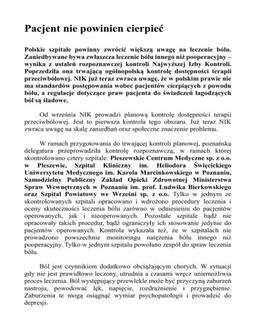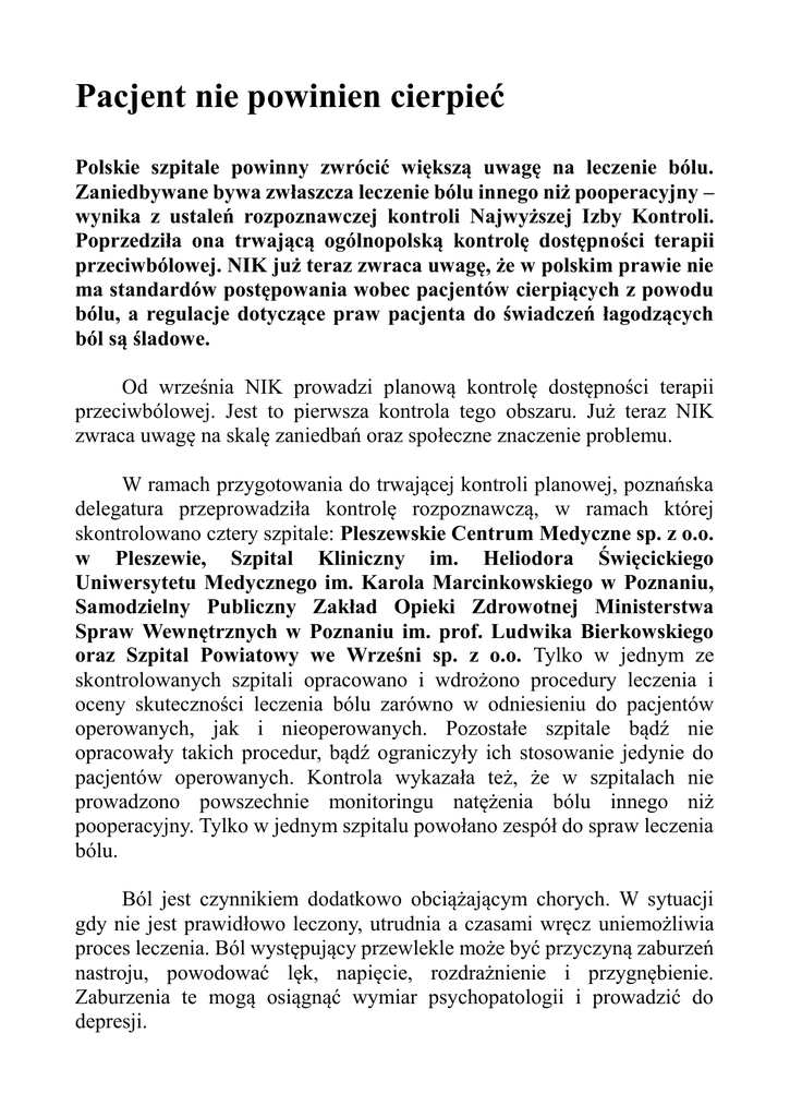 Pacjent nie powinien cierpieć Polskie szpitale powinny zwrócić większą uwagę na leczenie bólu. Zaniedbywane bywa zwłaszcza leczenie bólu innego niż pooperacyjny – wynika z ustaleń rozpoznawczej kontroli Najwyższej Izby Kontroli. Poprzedziła ona trwającą ogólnopolską kontrolę dostępności terapii przeciwbólowej. NIK już teraz zwraca uwagę, że w polskim prawie nie ma standardów postępowania wobec pacjentów cierpiących z powodu bólu, a regulacje dotyczące praw pacjenta do świadczeń łagodzących ból są śladowe. Od września NIK prowadzi planową kontrolę dostępności terapii przeciwbólowej. Jest to pierwsza kontrola tego obszaru. Już teraz NIK zwraca uwagę na skalę zaniedbań oraz społeczne znaczenie problemu. W ramach przygotowania do trwającej kontroli planowej, poznańska delegatura przeprowadziła kontrolę rozpoznawczą, w ramach której skontrolowano cztery szpitale: Pleszewskie Centrum Medyczne sp. z o.o. w Pleszewie, Szpital Kliniczny im. Heliodora Święcickiego Uniwersytetu Medycznego im. Karola Marcinkowskiego w Poznaniu, Samodzielny Publiczny Zakład Opieki Zdrowotnej Ministerstwa Spraw Wewnętrznych w Poznaniu im. prof. Ludwika Bierkowskiego oraz Szpital Powiatowy we Wrześni sp. z o.o. Tylko w jednym ze skontrolowanych szpitali opracowano i wdrożono procedury leczenia i oceny skuteczności leczenia bólu zarówno w odniesieniu do pacjentów operowanych, jak i nieoperowanych. Pozostałe szpitale bądź nie opracowały takich procedur, bądź ograniczyły ich stosowanie jedynie do pacjentów operowanych. Kontrola wykazała też, że w szpitalach nie prowadzono powszechnie monitoringu natężenia bólu innego niż pooperacyjny. Tylko w jednym szpitalu powołano zespół do spraw leczenia bólu. Ból jest czynnikiem dodatkowo obciążającym chorych. W sytuacji gdy nie jest prawidłowo leczony, utrudnia a czasami wręcz uniemożliwia proces leczenia. Ból występujący przewlekle może być przyczyną zaburzeń nastroju, powodować lęk, napięcie, rozdrażnienie i przygnębienie. Zaburzenia te mogą osiągnąć wymiar psychopatologii i prowadzić do depresji. W Polsce jest ponad 200 poradni leczenia bólu, jednak tylko około 20 z nich to poradnie interdyscyplinarne, w których pracują specjaliści różnych dziedzin medycyny i w których stosowane są różne metody leczenia - od farmakoterapii, poprzez techniki inwazyjne, rehabilitację, do psychoterapii. Dolegliwości bólowe mogą być skutecznie leczone przez każdego lekarza. Każdy chory ma prawo domagać się od swojego lekarza prowadzącego: internisty, onkologa reumatologa, ortopedy, itd. - poza leczeniem choroby podstawowej - również leczenia bólu. Ból ostry powinien być prawidłowo oceniany i uśmierzany we wszystkich placówkach leczniczych - w podstawowej opiece zdrowotnej przez lekarza rodzinnego, w karetce pogotowia, w szpitalnych oddziałach ratunkowych, na sali operacyjnej, w oddziałach intensywnej terapii, w salach porodowych, w oddziałach pooperacyjnych i w innych oddziałach szpitalnych. Tymczasem, pomimo poznania mechanizmów i opublikowania szeregu badań oceniających skuteczność i bezpieczeństwo leków i inwazyjnych metod stosowanych w objawowym leczeniu bólu, u wielu chorych nie uzyskuje się całkowitego zniesienia bólu. Zdarza się, że zastosowane metody leczenia zmniejszają dolegliwości bólowe, ale nie przynoszą istotnej poprawy w zakresie funkcjonowania pacjentów. Skuteczność postępowania z pacjentami odczuwającymi dolegliwości bólowe ma zagwarantować stosowanie ustalonych reguł, zasad i wytycznych opartych na dowodach i badaniach klinicznych i naukowych, ujętych w procedurze leczenia i oceny skuteczności leczenia bólu. NIK zwraca uwagę, że obecnie w polskim prawie nie ma systemowych standardów postępowania medycznego względem pacjenta cierpiącego z powodu bólu, a regulacje dotyczące praw pacjenta do świadczeń opieki zdrowotnej w zakresie łagodzenia bólu są śladowe. Przepisy ustawy o prawach pacjenta i Rzeczniku Praw Pacjenta przewidują jedynie prawo do łagodzenie bólu w stanie terminalnym. Nie odnoszą się natomiast do łagodzenia bólu u pozostałych osób, bez względu na wiek pacjenta i źródło pochodzenia bólu. Dostęp do odpowiedniej opieki medycznej, w tym do terapii przeciwbólowej jest istotnym elementem realizacji zobowiązań państwa z zakresu podstawowych praw i wolności. Niezapewnienie skutecznego systemu leczenia bólu oznacza niewywiązanie się państwa z ciążącego na nim obowiązku wynikającego między innymi z Europejskiej Konwencji Praw Człowieka. Uwagę na to, również w odniesieniu do Polski, zwróciła Organizacja Narodów Zjednoczonych. Dlatego NIK sprawdza, czy i w jakim zakresie podmioty lecznicze podejmują działania w celu zapewnienia pacjentom dostępu do skutecznego leczenia przeciwbólowego. Ogólnopolska, planowa kontrola pt. Dostępność terapii przeciwbólowej, koordynowana przez Delegaturę NIK w Poznaniu, prowadzona jest w siedmiu województwach (dolnośląskim, łódzkim, podlaskim, pomorskim, świętokrzyskim, wielkopolskim i zachodniopomorskim), łącznie w 28 szpitalach. Wyniki kontroli będą znane w przyszłym roku.