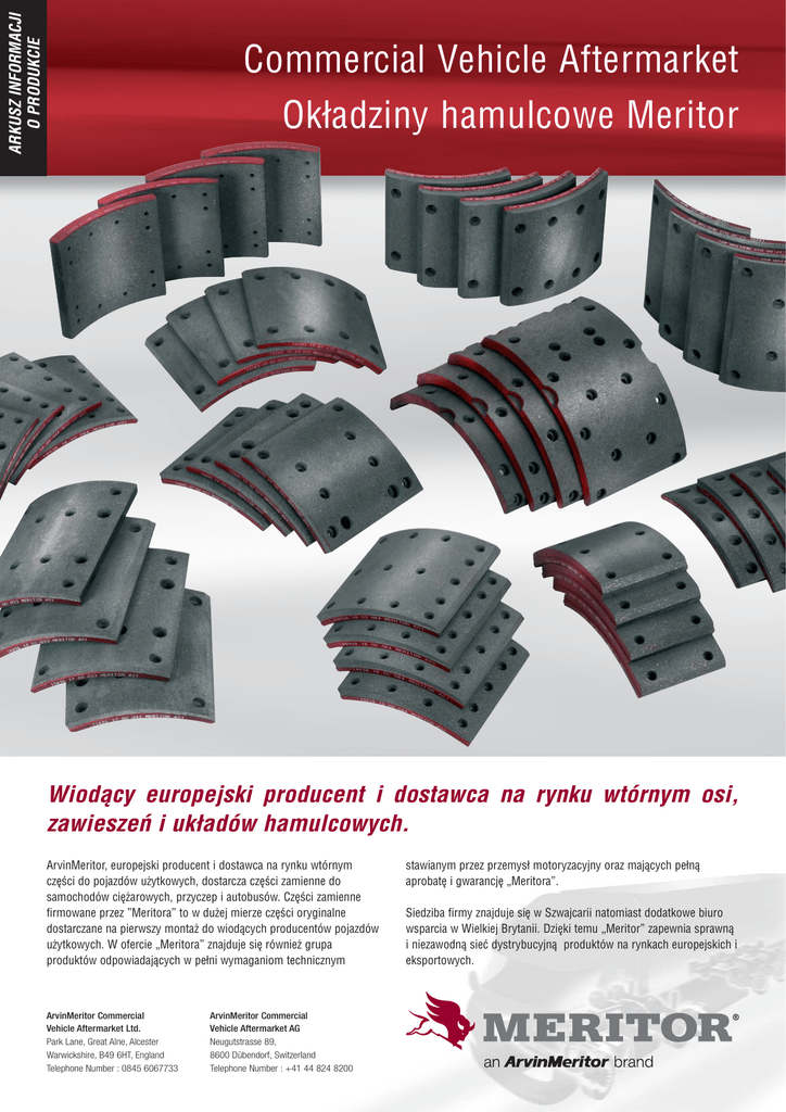 ARKUSZ INFORMACJI O PRODUKCIE Commercial Vehicle Aftermarket Okładziny hamulcowe Meritor Wiodący europejski producent i dostawca na rynku wtórnym osi, zawieszeń i układów hamulcowych. ArvinMeritor, europejski producent i dostawca na rynku wtórnym części do pojazdów użytkowych, dostarcza części zamienne do samochodów ciężarowych, przyczep i autobusów. Części zamienne firmowane przez ”Meritora” to w dużej mierze części oryginalne dostarczane na pierwszy montaż do wiodących producentów pojazdów użytkowych. W ofercie „Meritora” znajduje się również grupa produktów odpowiadających w pełni wymaganiom technicznym ArvinMeritor Commercial Vehicle Aftermarket Ltd. Park Lane, Great Alne, Alcester Warwickshire, B49 6HT, England Telephone Number : 0845 6067733 ArvinMeritor Commercial Vehicle Aftermarket AG Neugutstrasse 89, 8600 Dübendorf, Switzerland Telephone Number : +41 44 824 8200 stawianym przez przemysł motoryzacyjny oraz mających pełną aprobatę i gwarancję „Meritora”. Siedziba firmy znajduje się w Szwajcarii natomiast dodatkowe biuro wsparcia w Wielkiej Brytanii. Dzięki temu „Meritor” zapewnia sprawną i niezawodną sieć dystrybucyjną produktów na rynkach europejskich i eksportowych. Meritor – “eksperci od hamulców” Największa rodzina produktów w Europie o najwyższej jakości “Zatwierdzona jako R90” dla pojazdów użytkowych, pochodząca od wiodącego europejskiego producenta i dostawcy na rynek wtórny osi, zawieszeń i układów hamulcowych. • Rodzina okładzin hamulcowych o najwyższej jakości marki Meritor obejmuje zastosowania dla wszystkich głównych europejskich ciężarówek, naczep i autobusów, co stanowi ponad 90%-owe pokrycie parku samochodowego. • Największa gama produktów wytwarzanych i sprzedawanych w Europie zgodnie z najnowszymi normami UNECE R90, po konkurencyjnych cenach. • Publikacje techniczne i handlowe dostępne są w 6 głównych językach europejskich. – Katalog części zamiennych do układów hamulcowych Meritor (Numer referencyjny katalogu MPN1057) oraz wersja 3 katalogu elektronicznego na płycie CD. – Broszura informacyjna na temat okładzin hamulcowych Meritor zatytułowana “Przyszła generacja okładzin do hamulców bębnowych” (Numer referencyjny MPN1008). – Dwie pomocnicze ulotki informacyjne, jedna zawierająca informacje dla dystrybutorów Meritor i dalsze szczegóły o homologacjach UNECE R90 Meritor (Numer referencyjny katalogu MPN1054) i druga przeznaczona dla użytkowników flotowych i zawierająca informacje o korzyściach wynikających z zastosowania okładzin hamulcowych “Meritor” (Numer referencyjny MPN1009). Pełna oferta produktów “Meritor” dla elementów ciernych układu hamulcowego, jest teraz dostępna w jednej publikacji obejmującej klocki hamulcowe, okładziny hamulcowe, tarcze i bębny hamulcowe (Numer referencyjny katalogu MPN10741074). “Meritor to znak jakości wśród pojazdów użytkowych - części i obsługa serwisowa godne zaufania” Prosimy odwiedzić naszą stronę Internetową, aby zapoznać się z publikacjami “Meritor”: http://www.arvinmeritor.com/products/aftermarket/cvaeurope.asp Distributed by: © Copyright 2007 ArvinMeritor All rights Reserved This publication may be used only to specify and sell products of ArvinMeritor, its subsidiaries and affiliated companies. Use to specify and sell any other products is a copyright violation. Issued: 07/2007 Publication: MPN1088PL