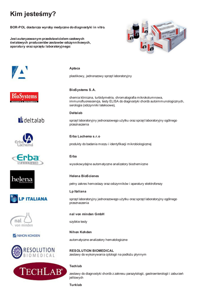 Kim jesteśmy? BOR-POL dostarcza wyroby medyczne do diagnostyki in vitro. Jest autoryzowanym przedstawicielem czołowych światowych producentów zestawów odczynnikowych, aparatury oraz sprzętu laboratoryjnego: Aptaca plastikowy, jednorazowy sprzęt laboratoryjny BioSystems S.A. chemia kliniczna, turbidymetria, chromatografia mikrokolumnowa, immunofluorescencja, testy ELISA do diagnostyki chorób autoimmunologicznych, serologia (odczynniki lateksowe), Deltalab sprzęt laboratoryjny jednorazowego użytku oraz sprzęt laboratoryjny ogólnego przeznaczenia Erba Lachema s.r.o produkty do badania moczu i identyfikacji mikrobiologicznej Erba wysokowydajne automatyczne analizatory biochemiczne Helena BioScienes pełny zakres hemostazy oraz odczynników i aparatury elektroforezy Lp Italiana sprzęt laboratoryjny jednorazowego użytku oraz sprzęt laboratoryjny ogólnego przeznaczenia nal von minden GmbH szybkie testy Nihon Kohden automatyczne analizatory hematologiczne RESOLUTION BIOMEDICAL zestawy do wykonywania cytologii na podłożu płynnym Techlab zestawy do diagnostyki chorób z zakresu parazytologii, gastroenterologii i zaburzeń jelitowych Turklab szybkie testy diagnostyczne Ultimed paski do analizy moczu, testy narkotykowe, szybkie testy BOR-POL jest również współorganizatorem międzynarodowej kontroli zewnątrzlaboratoryjnej