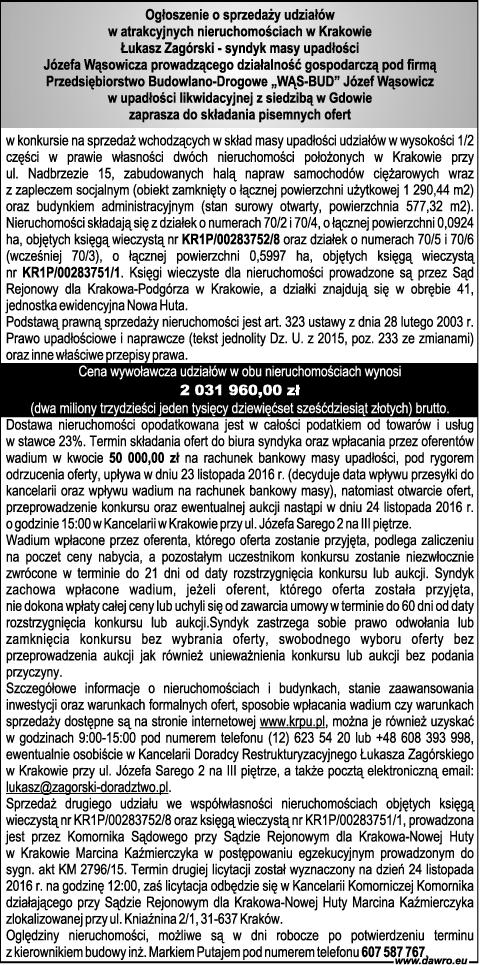 Ogłoszenie o sprzedaży udziałów w atrakcyjnych nieruchomościach w Krakowie Łukasz Zagórski - syndyk masy upadłości Józefa Wąsowicza prowadzącego działalność gospodarczą pod firmą Przedsiębiorstwo Budowlano-Drogowe „WĄS-BUD” Józef Wąsowicz w upadłości likwidacyjnej z siedzibą w Gdowie zaprasza do składania pisemnych ofert w konkursie na sprzedaż wchodzących w skład masy upadłości udziałów w wysokości 1/2 części w prawie własności dwóch nieruchomości położonych w Krakowie przy ul. Nadbrzezie 15, zabudowanych halą napraw samochodów ciężarowych wraz z zapleczem socjalnym (obiekt zamknięty o łącznej powierzchni użytkowej 1 290,44 m2) oraz budynkiem administracyjnym (stan surowy otwarty, powierzchnia 577,32 m2). Nieruchomości składają się z działek o numerach 70/2 i 70/4, o łącznej powierzchni 0,0924 ha, objętych księgą wieczystą nr KR1P/00283752/8 oraz działek o numerach 70/5 i 70/6 (wcześniej 70/3), o łącznej powierzchni 0,5997 ha, objętych księgą wieczystą nr KR1P/00283751/1. Księgi wieczyste dla nieruchomości prowadzone są przez Sąd Rejonowy dla Krakowa-Podgórza w Krakowie, a działki znajdują się w obrębie 41, jednostka ewidencyjna Nowa Huta. Podstawą prawną sprzedaży nieruchomości jest art. 323 ustawy z dnia 28 lutego 2003 r. Prawo upadłościowe i naprawcze (tekst jednolity Dz. U. z 2015, poz. 233 ze zmianami) oraz inne właściwe przepisy prawa. Cena wywoławcza udziałów w obu nieruchomościach wynosi 2 031 960,00 zł (dwa miliony trzydzieści jeden tysięcy dziewięćset sześćdziesiąt złotych) brutto. Dostawa nieruchomości opodatkowana jest w całości podatkiem od towarów i usług w stawce 23%. Termin składania ofert do biura syndyka oraz wpłacania przez oferentów wadium w kwocie 50 000,00 zł na rachunek bankowy masy upadłości, pod rygorem odrzucenia oferty, upływa w dniu 23 listopada 2016 r. (decyduje data wpływu przesyłki do kancelarii oraz wpływu wadium na rachunek bankowy masy), natomiast otwarcie ofert, przeprowadzenie konkursu oraz ewentualnej aukcji nastąpi w dniu 24 listopada 2016 r. o godzinie 15:00 w Kancelarii w Krakowie przy ul. Józefa Sarego 2 na III piętrze. Wadium wpłacone przez oferenta, którego oferta zostanie przyjęta, podlega zaliczeniu na poczet ceny nabycia, a pozostałym uczestnikom konkursu zostanie niezwłocznie zwrócone w terminie do 21 dni od daty rozstrzygnięcia konkursu lub aukcji. Syndyk zachowa wpłacone wadium, jeżeli oferent, którego oferta została przyjęta, nie dokona wpłaty całej ceny lub uchyli się od zawarcia umowy w terminie do 60 dni od daty rozstrzygnięcia konkursu lub aukcji. Syndyk zastrzega sobie prawo odwołania lub zamknięcia konkursu bez wybrania oferty, swobodnego wyboru oferty bez przeprowadzenia aukcji jak również unieważnienia konkursu lub aukcji bez podania przyczyny. Szczegółowe informacje o nieruchomościach i budynkach, stanie zaawansowania inwestycji oraz warunkach formalnych ofert, sposobie wpłacania wadium czy warunkach sprzedaży dostępne są na stronie internetowej www.krpu.pl, można je również uzyskać w godzinach 9:00-15:00 pod numerem telefonu (12) 623 54 20 lub +48 608 393 998, ewentualnie osobiście w Kancelarii Doradcy Restrukturyzacyjnego Łukasza Zagórskiego w Krakowie przy ul. Józefa Sarego 2 na III piętrze, a także pocztą elektroniczną email: [email protected]. Sprzedaż drugiego udziału we współwłasności nieruchomościach objętych księgą wieczystą nr KR1P/00283752/8 oraz księgą wieczystą nr KR1P/00283751/1, prowadzona jest przez Komornika Sądowego przy Sądzie Rejonowym dla KrakowaNowej Huty w Krakowie Marcina Kaźmierczyka w postępowaniu egzekucyjnym prowadzonym do sygn. akt KM 2796/15. Termin drugiej licytacji został wyznaczony na dzień 24 listopada 2016 r. na godzinę 12:00, zaś licytacja odbędzie się w Kancelarii Komorniczej Komornika działającego przy Sądzie Rejonowym dla Krakowa-Nowej Huty Marcina Kaźmierczyka zlokalizowanej przy ul. Kniaźnina 2/1, 31-637 Kraków. Oględziny nieruchomości, możliwe są w dni robocze po potwierdzeniu terminu z kierownikiem budowy inż. Markiem Putajem pod numerem telefonu 607 587 767.