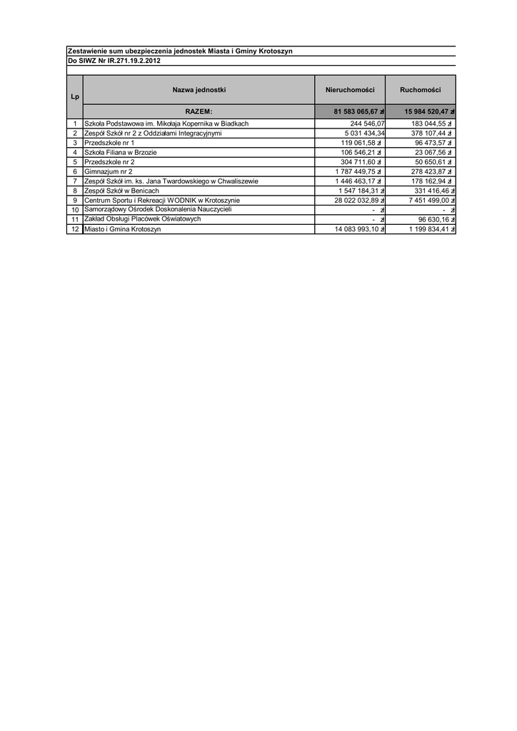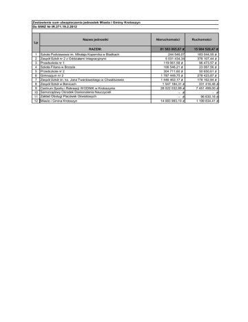 Zestawienie sum ubezpieczenia jednostek Miasta i Gminy Krotoszyn Do SIWZ Nr IR.271.19.2.2012 Nazwa jednostki Nieruchomości Ruchomości Lp RAZEM: 1 2 3 4 5 6 7 8 9 10 11 12 Szkoła Podstawowa im. Mikołaja Kopernika w Biadkach Zespół Szkół nr 2 z Oddziałami Integracyjnymi Przedszkole nr 1 Szkoła Filiana w Brzozie Przedszkole nr 2 Gimnazjum nr 2 Zespół Szkół im. ks. Jana Twardowskiego w Chwaliszewie Zespół Szkół w Benicach Centrum Sportu i Rekreacji WODNIK w Krotoszynie Samorządowy Ośrodek Doskonalenia Nauczycieli Zakład Obsługi Placówek Oświatowych Miasto i Gmina Krotoszyn 81 583 065,67 zł 15 984 520,47 zł 244 546,07 5 031 434,34 119 061,58 zł 106 546,21 zł 304 711,60 zł 1 787 449,75 zł 1 446 463,17 zł 1 547 184,31 zł 28 022 032,89 zł - zł - zł 14 083 993,10 zł 183 044,55 zł 378 107,44 zł 96 473,57 zł 23 067,56 zł 50 650,61 zł 278 423,87 zł 178 162,94 zł 331 416,46 zł 7 451 499,00 zł - zł 96 630,16 zł 1 199 834,41 zł Sprzęt elektroniczny Sprzęt elektroniczny stacjonarny przenośny 1 671 059,98 zł 240 753,44 zł 8 136,68 87 226,69 zł - zł - zł - zł 35 444,00 zł 33 791,55 zł - zł 67 925,69 zł 22 597,46 zł 32 379,66 zł 602 650,00 zł 3 996,00 16 830,68 - zł - zł - zł 10 125,32 zł 10 183,61 zł - zł 22 564,14 zł 5 883,93 zł 8 700,00 zł 23 800,00 zł
