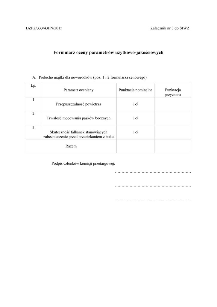 DZPZ/333/43PN/2015 Załącznik nr 3 do SIWZ Formularz oceny parametrów użytkowo-jakościowych A. Pielucho majtki dla noworodków (poz. 1 i 2 formularza cenowego) Lp. Parametr oceniany Punktacja nominalna Przepuszczalność powietrza 1-5 Trwałość mocowania pasków bocznych 1-5 Skuteczność falbanek stanowiących zabezpieczenie przed przeciekaniem z boku 1-5 Punktacja przyznana 1 2 3 Razem Podpis członków komisji przetargowej: ………………………………………………… ………………………………………………… ………………………………………………… B. Pielucho majtki dla dorosłych (poz. 3, 4 i 5 formularza cenowego) Lp. Parametr oceniany Punktacja nominalna Wytrzymałość zewnętrznej folii 1-5 Trwałość mocowania pasków bocznych 1-5 Punktacja przyznana 1 2 3 4 5 Skuteczność falbanek stanowiących zabezpieczenie przed przeciekaniem z boku Skuteczność absorbentu neutralizującego nieprzyjemny zapach Wykonanie: Laminat Folia 1-5 1-5 Laminat – 10 pkt. Folia – 0 pkt. Razem Podpis członków komisji przetargowej: ………………………………………………… ………………………………………………… ………………………………………………… Łączna maksymalna ilość punktów możliwa do uzyskania (tabela A+B): 45 pkt.