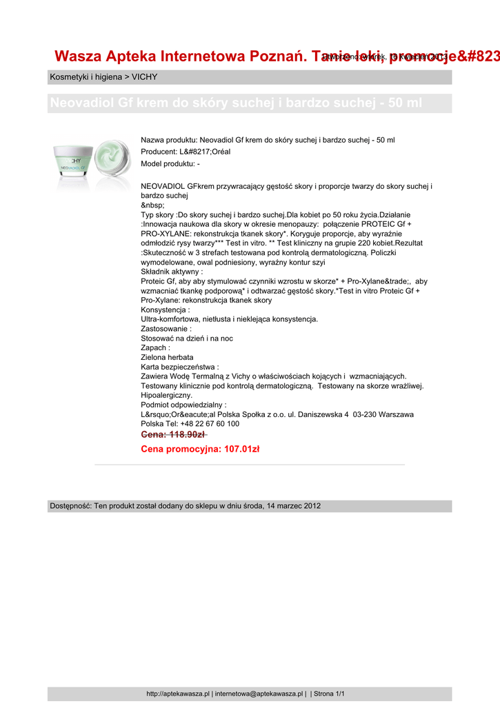 Utworzono: wtorek, promocje̷ 16 kwiecień 2013 Wasza Apteka Internetowa Poznań. Tanie leki, Kosmetyki i higiena > VICHY Neovadiol Gf krem do skóry suchej i bardzo suchej - 50 ml Nazwa produktu: Neovadiol Gf krem do skóry suchej i bardzo suchej - 50 ml Producent: L’Oréal Model produktu: NEOVADIOL GFkrem przywracający gęstość skory i proporcje twarzy do skory suchej i bardzo suchej Typ skory :Do skory suchej i bardzo suchej.Dla kobiet po 50 roku życia.Działanie :Innowacja naukowa dla skory w okresie menopauzy: połączenie PROTEIC Gf + PRO-XYLANE: rekonstrukcja tkanek skory*. Koryguje proporcje, aby wyraźnie odmłodzić rysy twarzy*** Test in vitro. ** Test kliniczny na grupie 220 kobiet.Rezultat :Skuteczność w 3 strefach testowana pod kontrolą dermatologiczną. Policzki wymodelowane, owal podniesiony, wyraźny kontur szyi Składnik aktywny : Proteic Gf, aby aby stymulować czynniki wzrostu w skorze* + Pro-Xylane™, aby wzmacniać tkankę podporową* i odtwarzać gęstość skory.*Test in vitro Proteic Gf + Pro-Xylane: rekonstrukcja tkanek skory Konsystencja : Ultra-komfortowa, nietłusta i nieklejąca konsystencja. Zastosowanie : Stosować na dzień i na noc Zapach : Zielona herbata Karta bezpieczeństwa : Zawiera Wodę Termalną z Vichy o właściwościach kojących i wzmacniających. Testowany klinicznie pod kontrolą dermatologiczną. Testowany na skorze wrażliwej. Hipoalergiczny. Podmiot odpowiedzialny : L’Oréal Polska Społka z o.o. ul. Daniszewska 4 03-230 Warszawa Polska Tel: +48 22 67 60 100 Cena: 118.90zł Cena promocyjna: 107.01zł Dostępność: Ten produkt został dodany do sklepu w dniu środa, 14 marzec 2012 http://aptekawasza.pl | [email protected] | | Strona 1/1