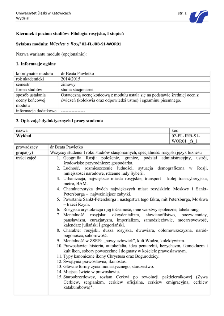 Uniwersytet Śląski w Katowicach Wydział str. 1 Kierunek i poziom studiów: Filologia rosyjska, I stopień Sylabus modułu: Wiedza o Rosji 02-FL-JRB-S1-WOR01 Nazwa wariantu modułu (opcjonalnie): 1. Informacje ogólne koordynator modułu rok akademicki semestr forma studiów sposób ustalania oceny końcowej modułu informacje dodatkowe dr Beata Pawletko 2014/2015 zimowy studia stacjonarne Ostateczną ocenę końcową z modułu ustala się na podstawie średniej ocen z ćwiczeń (kolokwia oraz odpowiedzi ustne) i egzaminu pisemnego. ---------------- 2. Opis zajęć dydaktycznych i pracy studenta nazwa Wykład prowadzący grupa(-y) treści zajęć kod 02-FL-JRB-S1WOR01 _fs_1 dr Beata Pawletko Wszyscy studenci I roku studiów stacjonarnych, specjalność: rosyjski język biznesu 1. Geografia Rosji: położenie, granice, podział administracyjny, ustrój, środowisko przyrodnicze; gospodarka. 2. Ludność, rozmieszczenie ludności, sytuacja demograficzna w Rosji, mniejszości narodowe, rdzenne ludy Syberii. 3. Urbanizacja, największe miasta rosyjskie, transport - kolej transsyberyjska, metro, BAM. 4. Charakterystyka dwóch największych miast rosyjskich: Moskwy i SanktPetersburga – najważniejsze zabytki. 5. Powstanie Sankt-Petersburga i następstwa tego faktu, mit Petersburga, Moskwa – trzeci Rzym. 6. Rosyjska arystokracja i jej tożsamość, inne warstwy społeczne, tabela rang. 7. Mentalność rosyjska: okcydentalizm, słowianofilstwo, poczwiennicy, panslawizm, eurazjatyzm, imperializm, samodzierżawie, mocarstwowość, kalendarz juliański i gregoriański. 8. Charakter rosyjski, dusza rosyjska, dwuwiara, obłomowszczyzna, naródbogonośca, soborowość. 9. Mentalność w ZSRR: „nowy człowiek”, kult Wodza, kolektywizm. 10. Prawosławie: historia, autokefalia, idea pentarchii, hezychazm, ikonoklazm i kult ikon, sobory powszechne i dogmaty w kościele prawosławnym. 11. Typy kanoniczne ikony Chrystusa oraz Bogurodzicy. 12. Świątynia prawosławna, ikonostas. 13. Główne formy życia monastycznego, starczestwo. 14. Miejsca święte w prawosławiu. 15. Staroobrzędowcy, rozłam Cerkwi po rewolucji październikowej (Żywa Cerkiew, sergianizm, cerkiew oficjalna, cerkiew emigracyjna, cerkiew katakumbowa)*. Uniwersytet Śląski w Katowicach Wydział metody prowadzenia zajęć liczba godzin dydaktycznych (kontaktowych) liczba godzin pracy własnej studenta opis pracy własnej studenta organizacja zajęć literatura obowiązkowa literatura uzupełniająca adres strony www zajęć informacje dodatkowe str. 2 Jak w opisie modułu. 30 10 Praca własna studenta obejmuje przygotowanie do egzaminu pisemnego. Wielkość jednostki zajęć: 90 minut Jednostki kontaktowe zgodnie z harmonogramem zajęć Instytutu Filologii Wschodniosłowiańskiej Uniwersytetu Śląskiego. 1. O. Figes: Taniec Nataszy. Z dziejów kultury rosyjskiej. Przeł. W. Jeżewski. Warszawa 2010. 2. B. Jegorow: Oblicza Rosji. Szkice z historii kultury rosyjskiej XIX wieku. Przeł. D. i B. Żyłkowie. Gdańsk 2002. 3. E. Małek, J. Wawrzyńczyk: Kultura rosyjska. Postacie. Wydarzenia. Symbole. Daty. Warszawa 2001. 4. Mentalność rosyjska. Słownik. Oprac. A. Lazari, J. Faryno i in. Katowice 1995. 5. E. Przybył: Prawosławie. Kraków 2006. 6. Rosjoznawstwo. Wprowadzenie do studiów nad Rosją. Red. L. Suchanek. Kraków 2004. 1. J. H. Billington: Ikona i topór. Historia kultury rosyjskiej. Przeł. J. Hunia. Kraków 2008. 2. T. Cyrol: Transsibem nad Bajkał. Łomianki 2008. 3. W. Grzelak: Szamani, mumie, ałmysy. Tajemnice serca Azji. Katowice 2006. 4. J. Hugo-Bader: Biała gorączka. Wołowiec 2009. 5. J. Hugo-Bader: W rajskiej dolinie wśród zielska. Wołowiec 2010. 6. J. Hugo-Bader: Dzienniki kołymskie. Wołowiec 2011. 7. R. Kapuściński: Imperium. Warszawa 2001. 8. R. Koperski: Pojedynek z Syberią. Gdańsk 2008. 9. K. Kurczab-Redlich: Głową o mur Kremla. Warszawa 2007. 10. K. Kurczab-Redlich: Pandrioszka. Poznań 2008. 11. Leksykon PWN Historia świata. Rosja. Red. W. Sienkiewicz. Warszawa 2001. 12. E. Małek, J. Wawrzyńczyk: Kultura rosyjska. Postacie. Wydarzenia. Symbole. Daty. Warszawa 2001. 13. J. Morawiecki: Łuskanie światła. Reportaże rosyjskie. Warszawa 2010. 14. J. Pałkiewicz: Syberia. Wyprawa na biegun zimna. Poznań 2006. 15. J. Smaga: Rosja w 20 stuleciu. Kraków 2001. 16. H. Urbanowski, Z. Żyburtowicz: Syberia pełna tajemnic. Warszawa 2005. 17. K. Wrubel: Planeta Rosja. Warszawa 2005. 18. H. Żygadło: Drzemiąca tajga. Wrocław 2006. 19. H. Żygadło: Syberyjska spiekota. Wrocław 2007. ---------- Uniwersytet Śląski w Katowicach Wydział nazwa Ćwiczenia prowadzący grupa(-y) treści zajęć str. 3 kod 02-FL-JRB-S1WOR01 _fs_2 dr Monika Karwacka Wszyscy studenci I roku studiów stacjonarnych, specjalność: rosyjski język biznesu 1. Ogólne informacje na temat położenia, geografii i ustroju Rosji 2. Charakterystyka gospodarki Rosji. Uzależnienie kraju od eksportu i cen na gaz ziemny i ropę naftową 3. Sytuacja demograficzna w Federacji Rosyjskiej, mniejszości narodowe, republiki autonomiczne 4. Rosja na Kaukazie. Konflikt czeczeński 5. Charakterystyka największych miast Rosji 6. Polsko-rosyjskie stereotypy. Wzajemne postrzeganie Rosjan i Polaków 7. Mentalność rosyjska a mentalność radziecka. Pojęcie „dusza rosyjska”. Tendencje imperialne i neoimperialne 8. Radzieckie próby stworzenia „nowego człowieka”. Homo sovieticus. Kult Wodza 9. Świątynia prawosławna, ikona, ikonostas. Miejsca święte prawosławia. Znaczenie Ławry Troicko-Siergijewskiej 10. Świeckie malarstwo rosyjskie. Początki. XVIII wiek 11. Malarstwo rosyjskie XIX wieku. Znaczenie pieriedwiżników 12. Malarstwo rosyjskie w XX wieku. „Świat sztuki”, „ BubnowyjWalet”, „Ośli ogon”, abstrakcjonizm, suprematyzm, prymitywizm, konstruktywizm. 13. Architektura w Rosji. Architektura staroruska do czasów Piotra Wielkiego. 14. Architektura wieku XVIII i XIX (barok, klasycyzm, historyzm) 15. Nowe zja
