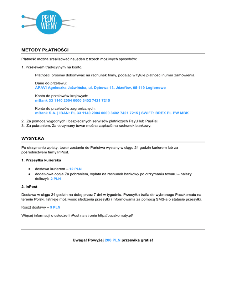 METODY PŁATNOŚCI WYSYŁKA