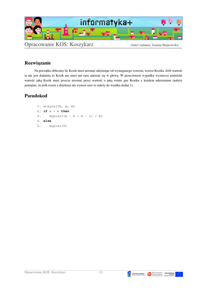 Opracowanie KOS: Koszykarz Autor zadania: Joanna Bujnowska. Rozwiązanie Na początku obliczmy ile Kozik musi urosnąć odejmując od wymaganego wzrostu, wzrost Kozika. Jeśli wartość ta nie jest dodatnia to Kozik nie musi ani razu uderzać się w głowę. W przeciwnym wypadku wystarczy podzielić wartość jaką Kozik musi jeszcze urosnąć przez wartość o jaką rośnie guz Kozika z każdym uderzeniem (należy pamiętać, że jeśli reszta z dzielenia nie wynosi zero to należy do wyniku dodać 1). Pseudokod 1. wczytaj(k, w, m) 2. if w > k then 3. wypisz((w - k + m - 1) / m) 4. else 5. wypisz(0) Opracowanie KOS: Koszykarz 1/1