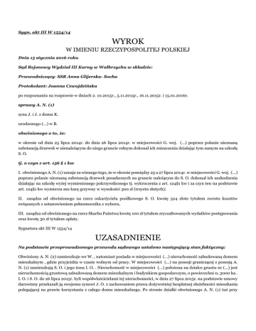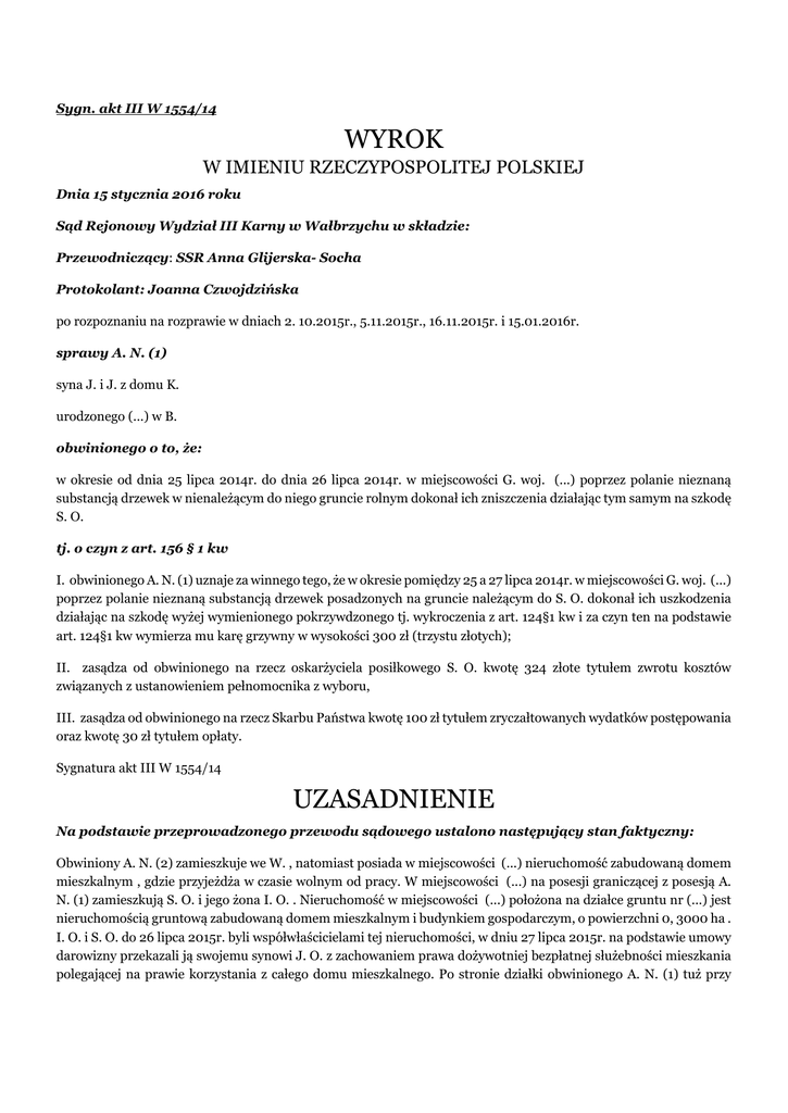 Sygn. akt III W 1554/14 WYROK W IMIENIU RZECZYPOSPOLITEJ POLSKIEJ Dnia 15 stycznia 2016 roku Sąd Rejonowy Wydział III Karny w Wałbrzychu w składzie: Przewodniczący: SSR Anna Glijerska- Socha Protokolant: Joanna Czwojdzińska po rozpoznaniu na rozprawie w dniach 2. 10.2015r., 5.11.2015r., 16.11.2015r. i 15.01.2016r. sprawy A. N. (1) syna J. i J. z domu K. urodzonego (...) w B. obwinionego o to, że: w okresie od dnia 25 lipca 2014r. do dnia 26 lipca 2014r. w miejscowości G. woj. (...) poprzez polanie nieznaną substancją drzewek w nienależącym do niego gruncie rolnym dokonał ich zniszczenia działając tym samym na szkodę S. O. tj. o czyn z art. 156 § 1 kw I. obwinionego A. N. (1) uznaje za winnego tego, że w okresie pomiędzy 25 a 27 lipca 2014r. w miejscowości G. woj. (...) poprzez polanie nieznaną substancją drzewek posadzonych na gruncie należącym do S. O. dokonał ich uszkodzenia działając na szkodę wyżej wymienionego pokrzywdzonego tj. wykroczenia z art. 124§1 kw i za czyn ten na podstawie art. 124§1 kw wymierza mu karę grzywny w wysokości 300 zł (trzystu złotych); II. zasądza od obwinionego na rzecz oskarżyciela posiłkowego S. O. kwotę 324 złote tytułem zwrotu kosztów związanych z ustanowieniem pełnomocnika z wyboru, III. zasądza od obwinionego na rzecz Skarbu Państwa kwotę 100 zł tytułem zryczałtowanych wydatków postępowania oraz kwotę 30 zł tytułem opłaty. Sygnatura akt III W 1554/14 UZASADNIENIE Na podstawie przeprowadzonego przewodu sądowego ustalono następujący stan faktyczny: Obwiniony A. N. (2) zamieszkuje we W. , natomiast posiada w miejscowości (...) nieruchomość zabudowaną domem mieszkalnym , gdzie przyjeżdża w czasie wolnym od pracy. W miejscowości (...) na posesji graniczącej z posesją A. N. (1) zamieszkują S. O. i jego żona I. O. . Nieruchomość w miejscowości (...) położona na działce gruntu nr (...) jest nieruchomością gruntową zabudowaną domem mieszkalnym i budynkiem gospodarczym, o powierzchni 0, 3000 ha . I. O. i S. O. do 26 lipca 2015r. byli współwłaścicielami tej nieruchomości, w dniu 27 lipca 2015r. na podstawie umowy darowizny przekazali ją swojemu synowi J. O. z zachowaniem prawa dożywotniej bezpłatnej służebności mieszkania polegającej na prawie korzystania z całego domu mieszkalnego. Po stronie działki obwinionego A. N. (1) tuż przy ogrodzeniu znajduje się garaż, na którym usytuowany jest taras. Na nieruchomości zamieszkałej przez S. O. i I. O. wzdłuż ściany garażu obwinionego posadzone są drzewa bzu , śliwy oraz byliny. Dowód: odpis z KW /k-99-102 odpis z aktu notarialnego /k-103-104/ zeznania świadka S. O./ adnotacja 00:08:02, k- 107/ zeznania świadka S. O. /k-8-9, adnotacja 00:26:46, 00:30:40, 00:40:04 k-59/ wyjaśnienia obwinionego A. N. (1) /k- 21/ fotografie /k- 76/ S. O. i I. O. od dłuższego czasu pozostają w konflikcie z A. N. (1). Dowód: zeznania świadka S. O. /k-8-9, adnotacja 00:26:46, 00:30:40, 00:40:04 k-59/ wyjaśnienia obwinionego A. N. (1)/k- 21/ Drzewa i krzewy na posesji państwa O. posadzone przy ogrodzeniu z posesją obwinionego zasłaniają widok obwinionemu, a ich gałęzie częściowo zwieszają się na teren jego posesji. Z tego powodu w czerwcu 2014r. obwiniony A. N. (1) podczas nieobecności państwa O. obciął częściowo ich korony oraz gałęzie zwieszające się na jego posesję. W 2013r. obwiniony nieznaną substancją polał około 4 drzew znajdujących się na posesji państwa O. tuż przy granicy z jego działką . Dowód: zeznania świadka S. O. /k-8-9, adnotacja 00:26:46, 00:30:40, 00:40:04 k- 59/ zeznania świadka I. O. / adnotacja k- 01:14:15 k- 60/ W dniu 26 lipca 2014r. S. O. na części swoich drzew posadzonych tuż przy granice z działką obwinionego ujawnił uschłe liście . Dowód: zeznania świadka S. O. /k-8-9, adnotacja 00:26:46, 00:30:40, 00:40:04 Wieczorem z dnia 26 na 27 lipca 2014r. około godz. 22.00 obwiniony A. N. (1) przebywający wówczas na swojej posesji w G. z tarasu umieszczonym na dachu garażu wylał na drzewka znajdujące się na posesji S. O. i I. O. posadzone przy ścianie garażu tuż przy ogrodzeniu graniczącym z jego nieruchomością nieustaloną substancję. Pokrzywdzony S. O. wraz z żoną I. i kolegą W. W. spędzali ten wieczór na dworze na werandzie przy swoim domu i słysząc odgłosy lania płynu z okolicy tarasu obwinionego, udali się w tą stronę gdzie zauważyli sylwetkę obwinionego, który trzymał w ręku duże naczynie z którego wylewał płyn. Następnego dnia liście drzew na śliwie i czarnym bzie w górnych koronach były wypalone i częściowo pożółkłe. Dowód: zeznania świadka S. O. /k- 8-9, adnotacja 00:26:46, 00:30:40, 00:40:04 k- 59, adnotacja 00:14:41 k- 107/ zeznania świadka W. W. /k- 13, adnotacja 01:17:50, 01:21:21, 01:24:39, 01:26:17 /k- 61/ zeznania świadka I. O./k- 17, adnotacja : 01:04:33, 01:06:14, 01:09:24, 01:11:11, 01:14:14/k- 60/ częściowe zeznania świadka J. K./adnotacja 00:32:23, 00:39::44, 00:40:18, k- 79/ fotografie /k- 4-5, 52/ W dniu 27 lipca 2014r. w godzinach południowych I. O. zatelefonowała do swojej sąsiadki J. K. wskazując na szkody w drzewkach dokonane przez sąsiada. J. K. po przybyciu do sąsiadów została poinformowana przez I. O. o wylaniu nieustalonej substancji przez A. N. (1) na krzewy i drzewa posadzone w pobliżu granicy z posesją obwinionego tuż przy ścianie jego garażu . I. O. pokazywała sąsiadce drzewa i krzewy , które zostały polane. Podczas pobytu J. K. na posesji państwa O. w dniu 27 lipca 2014r. obwiniony A. N. (1) przebywał na terenie swojej działki. Dowód: zeznania świadka J. K./ adnotacja 00:32:23, 00:40:18: 00:41:55 k- 79/ W dniu 30 lipca 2014r. za pośrednictwem faksu S. O. wysłał do KP G. pisemne zawiadomienie o zdarzeniu załączając doń wykonane przez siebie zdjęcia obrazujące stan drzew po działaniu nieustalonego płynu . Dowód: pisemne zawiadomienie /k- 3/ Pismem z dnia