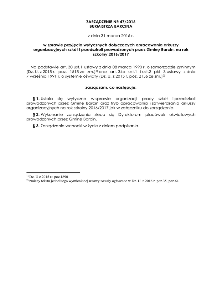 ZARZĄDZENIE NR 47/2016 BURMISTRZA BARCINA z dnia 31 marca 2016 r. w sprawie przyjęcia wytycznych dotyczących opracowania arkuszy organizacyjnych szkół i przedszkoli prowadzonych przez Gminę Barcin, na rok szkolny 2016/2017 Na podstawie art. 30 ust.1 ustawy z dnia 08 marca 1990 r. o samorządzie gminnym (Dz. U. z 2015 r. poz. 1515 ze zm.)1) oraz art. 34a ust.1 i ust.2 pkt 3 ustawy z dnia 7 września 1991 r. o systemie oświaty (Dz. U. z 2015 r. poz. 2156 ze zm.)2) zarządzam, co następuje: § 1. Ustala się wytyczne w sprawie organizacji pracy szkół i przedszkoli prowadzonych przez Gminę Barcin oraz tryb opracowania i zatwierdzania arkuszy organizacyjnych na rok szkolny 2016/2017 jak w załączniku do zarządzenia. § 2. Wykonanie zarządzenia zleca się Dyrektorom placówek oświatowych prowadzonych przez Gminę Barcin. § 3. Zarządzenie wchodzi w życie z dniem podpisania. 1) Dz. U z 2015 r.: poz.1890 tekstu jednolitego wymienionej ustawy zostały ogłoszone w Dz. U. z 2016 r. poz.35, poz.64 2) zmiany Uzasadnienie Zgodnie z art.34a ust.2 pkt 3 ustawy o systemie oświaty (Dz. U. z 2015 r. poz.2156 ze zm.) organ prowadzący szkołę lub placówkę sprawuje nadzór nad jej działalnością w zakresie przestrzegania przepisów dotyczących organizacji pracy szkoły i placówki. W związku z powyższym podjęcie niniejszego Zarządzenia jest konieczne i uzasadnione. Załącznik do Zarządzenia Nr 47/2016 Burmistrza Barcina z dnia 31 marca 2016 r. WYTYCZNE BURMISTRZA BARCINA dotyczące opracowania arkuszy organizacyjnych szkół i przedszkoli prowadzonych przez Gminę Barcin, na rok szkolny 2016/2017 I. PODSTAWA PRAWNA 1. Rozporządzenie Ministra Edukacji Narodowej z dnia 7 lutego 2012 r. w sprawie ramowych planów nauczania w szkołach publicznych (Dz. U. poz.204 ze zm.). 2. Rozporządzenie Ministra Edukacji Narodowej z dnia 21 maja 2001 r. w sprawie ramowych statutów publicznego przedszkola oraz publicznych szkół (Dz. U. Nr 61 poz.624, ze zm.). 3. Rozporządzenie Ministra Edukacji Narodowej z dnia 27 sierpnia 2012 r. w sprawie podstawy programowej wychowania przedszkolnego oraz kształcenia ogólnego w poszczególnych typach szkół (Dz. U. poz.977 ze zm.). 4. Rozporządzenie Ministra Edukacji Narodowej z dnia 12 sierpnia 1999 r. w sprawie sposobu nauczania szkolnego oraz zakresu treści dotyczących wiedzy o życiu seksualnym człowieka, o zasadach świadomego i odpowiedzialnego rodzicielstwa, o wartości rodziny, życia w fazie prenatalnej oraz metodach i środkach świadomej prokreacji zawartych w podstawie programowej kształcenia ogólnego (Dz. U. z 2014 r. poz. 395). 5. Rozporządzenie Ministra Edukacji Narodowej i Sportu z dnia 19 grudnia 2001 r. w sprawie warunków i trybu udzielania zezwoleń na indywidualny program lub tok nauki oraz organizacji indywidualnego programu lub toku nauki (Dz. U. z 2002 r. Nr 3 poz.28). 6. Rozporządzenie Ministra Edukacji Narodowej z dnia 30 kwietnia 2013 r. w sprawie zasad udzielania i organizacji pomocy psychologiczno-pedagogicznej w publicznych przedszkolach, szkołach i placówkach (Dz. U. poz.532). 7. Rozporządzenie Ministra Edukacji Narodowej z dnia 28 września 2014 r. w sprawie indywidualnego obowiązkowego rocznego przygotowania przedszkolnego dzieci i indywidualnego nauczania dzieci i młodzieży (Dz. U. z 2014 r. poz.1157). 8. Rozporządzenie Ministra Edukacji Narodowej i Sportu z dnia 9 kwietnia 2002 r. w sprawie warunków prowadzenia działalności innowacyjnej i eksperymentalnej przez publiczne szkoły i placówki (Dz. U. Nr 56 poz.506 ze zm.). 9. Rozporządzenie Ministra Edukacji Narodowej z dnia 14 kwietnia 1992 r. w sprawie warunków i sposobu organizowania religii w publicznych przedszkolach i szkołach (Dz. U. Nr 36 poz. 155 ze zm.). 10. Rozporządzenie Ministra Edukacji Narodowej z dnia 11 października 2013 r. w sprawie organizowania wczesnego wspomagania rozwoju dzieci (Dz. U. poz.1257). 11. Rozporządzenie Ministra Edukacji Narodowej z dnia 31 sierpnia 2010 r. w sprawie rodzajów innych form wychowania przedszkolnego, warunków tworzenia i organizowania tych form oraz sposobu ich działania (Dz. U. Nr 161, poz.1080 ze zm.). 12. Rozporządzenie Ministra Edukacji Narodowej z dnia 9 sierpnia 2011 r. w sprawie dopuszczalnych form realizacji obowiązkowych zajęć wychowania fizycznego (Dz. U. Nr 175, poz.1042). 13. Rozporządzenie Ministra Edukacji Narodowej z dnia 15 października 2012 r. w sprawie warunków tworzenia, organizacji oraz działania oddziałów sportowych, szkół sportowych oraz szkół mistrzostwa sportowego (Dz. U. poz. 1129). 14. Rozporządzenie Ministra Edukacji Narodowej z dnia 24 lipca 2015 r. w sprawie warunków organizowania kształcenia, wychowania i opieki dla dzieci i młodzieży niepełnosprawnych, niedostosowanych społecznie i zagrożonych niedostosowaniem społecznym (Dz. U. z 2015 r. poz.1113 ze zm.). 15. Rozporządzenie Ministra Edukacji Narodowej z dnia 23 kwietnia 2013 r. w sprawie warunków i sposobu organizowania zajęć rewalidacyjno wychowawczych dla dzieci i młodzieży z upośledzeniem umysłowym w stopniu głębokim (Dz. U. z 2013 r. poz.529) 16. Ustawa z dnia 7 września 1991 r. o systemie oświaty (Dz. U. z 2015 r. poz.2156 ze zm.). 17. Ustawa z dnia 26 stycznia 1982 r. – Karta Nauczyciela (Dz. U. z 2014 r. poz.191 ze zm.). II. POSTANOWIENIA OGÓLNE 1. Organizację nauczania, wychowania i opieki w roku szkolnym 2016/2017 określa arkusz organizacyjny szkoły sporządzony w dwóch egzemplarzach przez dyrektora szkoły najpóźniej do 29 kwietnia 2016 r. na podstawie ramowego planu nauczania oraz planu finansowego szkoły. Dyrektor placówki zobowiązany jest do przestrzegania dyscypliny budżetowej. 2. Arkusz organizacyjny przedszkola sporządzony jest w dwóch egzemplarzach przez dyrektora najpóźniej do 16 maja 2016 r. na podstawie planu finansowego. 3. Arkusz organizacji winien zostać podpisany przez dyrektora szkoły/przedszkola oraz zawierać adnotację o zaopiniowan