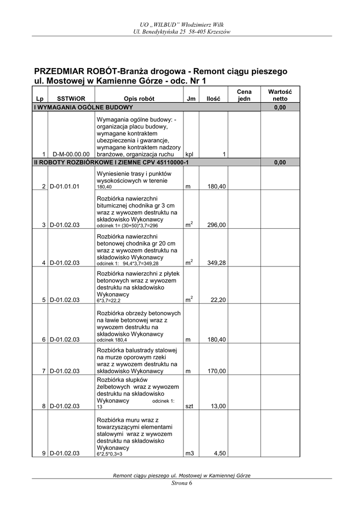 UO „WILBUD” Włodzimierz Wilk Ul. Benedyktyńska 25 58-405 Krzeszów PRZEDMIAR ROBÓT-BranŜa drogowa - Remont ciągu pieszego ul. Mostowej w Kamienne Górze - odc. Nr 1 Lp SSTWiOR Opis robót I WYMAGANIA OGÓLNE BUDOWY Jm Wymagania ogólne budowy: organizacja placu budowy, wymagane kontraktem ubezpieczenia i gwarancje, wymagane kontraktem nadzory 1 D-M-00.00.00 branŜowe, organizacja ruchu kpl II ROBOTY ROZBIÓRKOWE I ZIEMNE CPV 45110000-1 Cena jedn Ilość 1 0,00 Wyniesienie trasy i punktów wysokościowych w terenie 2 D-01.01.01 m 180,40 Rozbiórka nawierzchni bitumicznej chodnika gr 3 cm wraz z wywozem destruktu na składowisko Wykonawcy 3 D-01.02.03 odcinek 1= (30+50)*3,7=296 4 D-01.02.03 5 D-01.02.03 6 D-01.02.03 7 D-01.02.03 8 D-01.02.03 9 D-01.02.03 odcinek 1: 94,4*3,7=349,28 Rozbiórka nawierzchni z płytek betonowych wraz z wywozem destruktu na składowisko Wykonawcy 6*3,7=22,2 Rozbiórka obrzeŜy betonowych na ławie betonowej wraz z wywozem destruktu na składowisko Wykonawcy odcinek 180,4 Rozbiórka balustrady stalowej na murze oporowym rzeki wraz z wywozem destruktu na składowisko Wykonawcy Rozbiórka słupków Ŝelbetowych wraz z wywozem destruktu na składowisko Wykonawcy odcinek 1: 13 Rozbiórka muru wraz z towarzyszącymi elementami stalowymi wraz z wywozem destruktu na składowisko Wykonawcy 6*2,5*0,3=3 180,40 m 2 296,00 m 2 349,28 m 2 22,20 Rozbiórka nawierzchni betonowej chodnika gr 20 cm wraz z wywozem destruktu na składowisko Wykonawcy m 180,40 m 170,00 szt 13,00 m3 4,50 Remont ciągu pieszego ul. Mostowej w Kamiennej Górze Strona 6 Wartość netto 0,00 UO „WILBUD” Włodzimierz Wilk Ul. Benedyktyńska 25 58-405 Krzeszów Rozbiórka podmurówki wraz z wywozem destruktu na składowisko Wykonawcy 10 D-01.02.03 0,25*0,25*7=0,44 m3 0,44 11 D-01.02.01 Usuwanie krzewów w pasie projektowanego chodnika m 2 10,00 12 D - 09.01.01 Zabezpieczenie drzew na czas budowy szt 15,00 m2 845,00 mb 183,00 m2 773,00 mb 80,00 Wykonanie koryta pod warstwy konstrukcyjne gł 31 cm wraz z jego profilowaniem + wywóz urobku na składowisko Wykonawcy 13 D-04.01.00 845,00 III ROBOTY DROGOWE CPV 45233140-2 Wykonanie barieroporęczy przy zwieńczeniu muru oporowego rzeki na własnym fundamencie 14 D - 07.05.01 odc1 - 183m Podbudowa z mieszanki 0/31,5 20 cm 15 D-04.04.02 ścieŜka rowerowa - 442 chodnik-271 zatoczki z ławkami : 60 RAZEM 773 Zabezpieczenie kabli energetycznych rurą ochronną: fi 110 mm, dwudzielną dla linii kablowych 0,4 kV oraz fi 160 mm, dwudzielną dla linii kablowej 20 kV 16 fi 160 mm - 15,0m fi 110 mm - 65,0 m Zabezpieczenie kanalizacji telefonicznej ławą bet. 50x20 cm bet. B15 17 180,4 m+160 m =340,40 m mb 340,40 18 D - 08.03.01 Wykonanie obrzeŜy betonowych chodnikowych na ławie bet. z oporem mb 424,50 m2 713,00 Wykonanie nawierzchni z kostki betonowej Holland grub. 8 cm na podsypce piask 19 D - 08.02.02 ścieŜka rowerowa - 442 chodnik- 271 RAZEM 713 Remont ciągu pieszego ul. Mostowej w Kamiennej Górze Strona 7 UO „WILBUD” Włodzimierz Wilk Ul. Benedyktyńska 25 58-405 Krzeszów Wykonanie nawierzchni z kostki kamiennej gr 8/11 na podsypce piask z oporem z dwóch rzędów kostki na ławie bet. Zatoczki 20 D - 08.02.07 z ławkami 60 uzupełnienia przy bud. 20 Razem : 80 m2 80,00 21 MontaŜ ławek szt 6,00 22 MontaŜ koszy na śmieci szt 3,00 23 D - 09.01.01 Nasadzenia Ŝywopłotu Roboty murowe - wykonanie muru 25 cm z formaka granitowego na zaprawie cempiask ze spoinowaniem w rejonie mostu przy ul. Fornalskiej z rozbiórką murku uszkodzonego m2 15,00 24 D - 10.01.01 12,0*1,1*0,25 m3 3,30 3 3,40 2 Humusowanie i obsianie skarp m 2 m 270,00 270,00 MontaŜ pomnika Św.Jana Nepomucena przy moście ul. PapieŜa Jana Pawła II szt 1,00 Regulacja urządzeń obcych studnie deszczowe, telekomunikacyjne, zawory itp. 25 D -03.02.01 26 D - 06.03.01 27 D - 09.01.01 28 RAZEM NETTO PODATEK VAT 22% RAZEM BRUTTO zawory wodne i gazowe 1 szt x 0,1 m3/szt = 0,1 m3 studnie kanalizacyjne - 8 szt x 0,3 m3/szt = 2,4 m3 studnie telekomunikacyjne - 3szt x 0.3m3/szt=0,9m3 RAZEM 3,4 m Obrobienie skarp na czysto 180x1,5=270 m2 Remont ciągu pieszego ul. Mostowej w Kamiennej Górze Strona 8 UO „WILBUD” Włodzimierz Wilk Ul. Benedyktyńska 25 58-405 Krzeszów PRZEDMIAR ROBÓT-BranŜa Sanitarna - Remont ciągu pieszego ul. Mostowej w Kamienne Górze - odc. Nr 1 Lp SSTWiOR Opis robót I WYMAGANIA OGÓLNE BUDOWY Jm Wymagania ogólne budowy: organizacja placu budowy, wymagane kontraktem ubezpieczenia i gwarancje, wymagane kontraktem nadzory 1 D-M-00.00.00 branŜowe, organizacja ruchu kpl II ROBOTY ROZBIÓRKOWE I ZIEMNE CPV 45110000-1 Cena jedn Ilość 1 0,00 Roboty pomiarowe przy liniowych robotach ziemnych, trasa dróg w terenie równinnym 2 SST-1S odcinek W1-D1 0,005 = 0,005 odcinek D1-Di 0,009 = 0,009 odcinek W2-Di 0,0045 = 0,0045 odcinek W3-Di 0,0095 = 0,0095 Razem: 0,028 km 0,028 m 3 21,97 m 3 9,42 Wykopy oraz przekopy wykonywane koparkami podsiębiernymi na odkład, koparka 0,25·m3, grunt kategorii III (przyjęto 70% wykopów) studzienka D1 3 SST-1S 5,68 4,31 W2 - 5,99 Wpust W3 - 5,99 Razem: 21,97 Wpust W1 Wpust Wykopy liniowe o ścianach pionowych pod fundamenty, rurociągi i kolektory w gruntach suchych z wydobyciem urobku łopatą lub wyciągiem ręcznym, głębokość do 3.0·m, kategoria gruntu III-IV, szerokość wykopu 0.8-1.5·m(przyjęto 30% wykop) 4 SST-1S Studzienka D1 - 2,43 Wpust W1 - 1,85 Wpust W2 - 2,57 Wpust W3 - 2,57 Razem - 9,42 Remont ciągu pieszego ul. Mostowej w Kamiennej Górze Strona 9 Wartość netto 0,00 UO „WILBUD” Włodzimierz Wilk Ul. Benedyktyńska 25 58-405 Krzeszów Wykopy oraz przekopy wykonywane koparkami podsiębiernymi na odkład, koparka 0,25·m3, grunt kategorii III (przyjęto 70% wykopów) Odcinek W1-D1 5 SST-1S 3,31 D1-Di 6,8 Odcinek W2-Di Odcinek W3-Di Razem 26,29 Odcinek 5,1 11,07 3 26,29 m3 11,27 m2 55,11 m2 72,95 m Wykopy liniowe o ścianach pionowych pod fundamenty, rurociągi i kolektory w gruntach suchych z wydobyciem urobku 