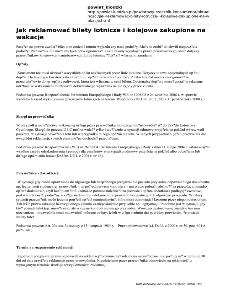 powiat_klodzki http://powiat.klodzko.pl/powiatowy-rzecznik-konsumenta/aktual nosci/jak-reklamowac-bilety-lotnicze-i-kolejowe-zakupione-na-w akacje.html Jak reklamować bilety lotnicze i kolejowe zakupione na wakacje Pasa?er ma prawo zwróci? bilet oraz zmieni? termin wyjazdu czy tras? podró?y. Mo?e to zrobi? do chwili rozpocz?cia podró?y. Przewo?nik nie mo?e mu tych praw ogranicza?. Takie zasady wynikaj? z prawa przewozowego, które dotyczy przewo?ników kolejowych i autobusowych. Linie lotnicze ??dz? si? w?asnymi zasadami. Op?aty Konsument nie musi uiszcza? wszystkich op?at nak?adanych przez linie lotnicze. Dotyczy to tzw. opcjonalnych op?at i dop?at. Do tego typu kosztów zalicza si? m.in. op?at? za komfort podró?y. Z takich op?at mo?na zrezygnowa? w przeciwie?stwie do np. op?aty paliwowej, która jest wliczana w cen? biletu. Opcjonalne dop?aty musz? zosta? przekazane odr?bnie ze wskazaniem mo?liwo?ci dobrowolnego wyra?enia na nie zgody przez klienta. Podstawa prawna: Rozporz?dzenie Parlamentu Europejskiego i Rady WE nr 1008/08 z 24 wrze?nia 2008 r. w sprawie wspólnych zasad wykonywania przewozów lotniczych na terenie Wspólnoty (Dz.Urz. UE L 293 z 31 pa?dziernika 2008 r.). Skargi na przewo?nika W przypadku niew?a?ciwe wykonanej us?ugi przez przewo?nika lotniczego mo?na zwróci? si? do Urz?du Lotnictwa Cywilnego. Skarg? do prezesa U LC mo?na wnie?? tylko i wy??cznie w sytuacji odmowy przyj?cia na pok?ad wbrew woli pasa?era, w sytuacji odwo?ania lotu lub w przypadku du?ego opó?nienia lotu. W innych przypadkach, je?eli przewo?nik nie uwzgl?dni reklamacji, swoich praw mo?na dochodzi? przed s?dem. Podstawa prawna: Rozporz?dzenie (WE) nr 261/2004 Parlamentu Europejskiego i Rady z dnia 11 lutego 2004 r. ustanawiaj?ce wspólne zasady odszkodowania i pomocy dla pasa?erów w przypadku odmowy przyj?cia na pok?ad albo odwo?ania lub du?ego opó?nienia lotów (Dz.Urz. UE L z 2004 r. nr 46). Przewo?nicy - Zwrot kary W sytuacji gdy osoba uprawniona do ulgowego lub bezp?atnego przejazdu nie posiada przy sobie odpowiedniego dokumentu, np. legitymacji studenckiej, przewo?nik – za po?rednictwem kontrolera – ma prawo pobra? nale?no?? za przewóz, a ponadto op?at? dodatkow?, czyli kar? pieni??n?. Jednak?e pobrana nale?no?? za przewóz i op?ata dodatkowa podlegaj? zwrotowi, pod warunkiem ?e podró?ny w ci?gu siedmiu dni udokumentuje prawo do bezp?atnego lub ulgowego przejazdu. W takiej sytuacji przewo?nik mo?e jedynie potr?ci? op?at? manipulacyjn?, która musi odpowiada? kosztom przez niego poniesionym. Tak wi?c prawo zakazuje bezwzgl?dnego karania za nieposiadanie przy sobie np. legitymacji. Podobnie jest w sytuacji, gdy kto? posiada bilet (np. miesi?czny), ale w czasie kontroli nie ma go przy sobie. Wówczas zastosowanie znajdzie ten sam mechanizm – przewo?nik musi mu zwróci? pobrane op?aty, je?eli w ci?gu siedmiu dni podró?ny potwierdzi, ?e posiada wa?ny bilet. Podstawa prawna: Art. 33a ust. 3a ustawy z 15 listopada 1984 r. – Prawo przewozowe (t.j. Dz.U. z 2000 r. nr 50, poz. 601 z pó?n. zm.). Termin na rozpatrzenie reklamacji Zgodnie z przepisami prawa odpowied? na reklamacj? powinna by? udzielona niezw?ocznie, nie pó?niej ni? w terminie 30 dni od dnia przyj?cia reklamacji przez przewo?nika. Nieudzielenie przez przewo?nika odpowiedzi na reklamacj? w wymaganym terminie skutkuje uwzgl?dnieniem reklamacji. Data publikacji 2017-03-08 14:15:52, Strona: 1/3 powiat_klodzki http://powiat.klodzko.pl/powiatowy-rzecznik-konsumenta/aktual nosci/jak-reklamowac-bilety-lotnicze-i-kolejowe-zakupione-na-w akacje.html Podstawa prawna: Par. 6 ust. 1 rozporz?dzenia ministra transportu i budownictwa z 24 lutego 2006 r. w sprawie ustalania stanu przesy?ek oraz post?powania reklamacyjnego (Dz.U. z 2006 nr 38, poz. 266). Zwrot kosztów podró?y Linie lotnicze maj? obowi?zek dostarczy? pasa?era do miejsca wskazanego na bilecie jako miejsce docelowe podró?y. Tak bowiem stanowi umowa, któr? pasa?er zawiera z przewo?nikiem, wykupuj?c bilet. Je?eli przewo?nik nie wywi??e si? z umowy, a pasa?er zosta? zmuszony do kontynuowania podró?y na w?asny koszt, przewo?nik powinien, co do zasady, zwróci? koszty poniesione przez pasa?era. W tym celu podró?ny powinien przedstawi? przewo?nikowi odpowiednie dokumenty, np. rachunki za bilety kolejowe. Podstawa prawna: Rozporz?dzenie (WE) nr 261/2004 Parlamentu Europejskiego i Rady z 11 lutego 2004 r. ustanawiaj?ce wspólne zasady odszkodowania i pomocy dla pasa?erów w przypadku odmowy przyj?cia na pok?ad albo odwo?ania lub du?ego opó?nienia lotów (Dz.Urz. UE L z 2004 r. nr 46). Zwrot kwoty za bilet Zgodnie z prawem podró?nemu, który odst?pi? od umowy przewozu, przys?uguje zwrot nale?no?ci stosowny do niewykorzystanego ?wiadczenia przewozowego po potr?ceniu cz??ci nale?no?ci (odst?pnego). Oznacza to, ?e pasa?er, który ju? po wykupieniu biletu na przejazd postanowi? zrezygnowa? z podró?y, mo?e odda? bilet i otrzyma zwrot pieni?dzy, jednak nie mo?e domaga? si? ca?ej kwoty. PKP mo?e potr?ci? odst?pne w wysoko?ci kilkunastu procent ceny biletu. Nale?y jednak pami?ta?, ?e potr?cenia przewo?nik nie mo?e dokona?, je?eli podró?ny odst?pi od umowy przewozu z przyczyn wyst?puj?cych po stronie przewo?nika. Tak b?dzie w sytuacji, gdy np. przewo?nik zlikwiduje po??czenie na trasie, na któr? pasa?er wykupi? bilet. Podstawa prawna: Art. 17 ust. 4 ustawy z 15 listopada 1984 r. – Prawo przewozowe (t.j. Dz.U. z 2000 r. nr 50, poz. 601 z pó?n. zm.). Zwroty biletów lotniczych W przypadku rezygnacji z przelotu, linie lotnicze nie maja obowi?zku ustawowego zwrotu ceny biletu. Wiele zale?y tu od polityki obs?ugi klienta danego przewo?nika oraz jego Regulaminu ?wiadczenia us?ug przewozu pasa?erów i baga?u. Je?eli w jego tre?ci znalaz?o si? postanowienie, zgodnie z którym klient nie ma prawa zwróci? biletu, a jedynie wymieni? go na inny, mo?emy mie? problem. Zawieraj?c umow? z przewo?nikiem, pasa?er akceptuje bowiem postanowienia tego regulaminu. Dlatego te? przy ustalaniu ewentualnych