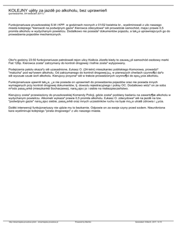 KOLEJNY ujêty za jazdê po alkoholu, bez uprawnieñ (poniedzia³ek, 04 kwiecieñ 2011) - Funkcjonariusze pruszkowskiej S.M i KPP. w godzinach nocnych z 01/02 kwietnia br., wyeliminowali z ulic naszego miasta kolejnego "kierowcê na podwójnym gazie".Kierowca zdecydowa³ siê prowadziæ samochód, maj±c prawie 0,5 promila alkoholu w wydychanym powietrzu. Dodatkowo nie posiada³ dokumentów pojazdu, a tak¿e uprawniaj±cych go do prowadzenia pojazdów mechanicznych. Oko³o godziny 23:50 funkcjonariusze patrolowali rejon ulicy Ksiêcia Józefa kiedy to zauwa¿yli samochód osobowy marki Fiat 126p. Kierowca zosta³ zatrzymany do kontroli drogowej i trafnie zosta³ wytypowany. Podejrzenia patolu okaza³y siê uzasadnione, £ukasz O. (24-letni) mieszkaniec pobliskiego Komorowa, prowadzi³ "malucha" pod wp³ywem alkoholu. Od zatrzymanego do kontroli drogowej ju¿ w pierwszych chwilach czynno¶ci da³o siê wyczuæ czuæ woñ alkoholu. Kieruj±cy przyzna³ siê w trakcie prowadzonych czynno¶ci do spo¿ycia alkoholu. Funkcjonariusze ujawnili tak¿e, ¿e nie posiada on uprawnieñ do prowadzenia pojazdów oraz nie posiada innych wymaganych przy kontroli drogowej dokumentów, tj. dowodu rejestracyjnego i polisy OC. Dodatkowo wióz³ on ze sob± m³od± pasa¿erkê (mieszkankê Sochaczewa), nara¿aj±c j± i siebie na niebezpieczeñstwo. Kieruj±cy zosta³ przewieziony do pruszkowskiej Komendy Policji, gdzie zosta³ poddany badaniu na zawarto¶æ alkoholu w wydychanym powietrzu. Alkometr wykaza³ prawie 0,5 promila alkoholu. £ukasz O. zdecydowa³ siê na jazdê na tzw. "podwójnym gazie" nara¿aj±c siebie, pasa¿erkê oraz innych uczestników ruchu na byæ mo¿e utratê zdrowia i ¿ycia. Dziêki interwencji funkcjonariuszy nie ujdzie mu to bezkarnie. Odpowie on za swoje czyny przed s±dem. Nieunikniona kara wyeliminuje kolejnego "pirata drogowego" z ulic naszego miasta. http://strazmiejska.pruszkow.pl/sm - strazmiejska.pruszkow.pl Powered by Mambo Generated: 8 March, 2017, 14:15