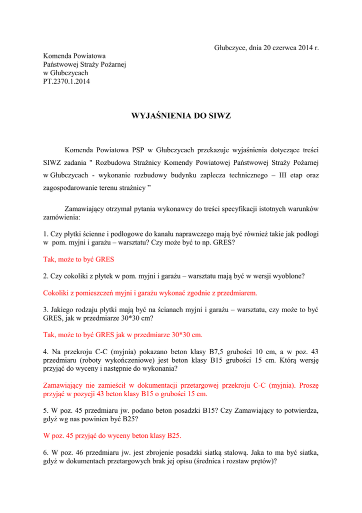 Głubczyce, dnia 20 czerwca 2014 r. Komenda Powiatowa Państwowej Straży Pożarnej w Głubczycach PT.2370.1.2014 WYJAŚNIENIA DO SIWZ Komenda Powiatowa PSP w Głubczycach przekazuje wyjaśnienia dotyczące treści SIWZ zadania " Rozbudowa Strażnicy Komendy Powiatowej Państwowej Straży Pożarnej w Głubczycach - wykonanie rozbudowy budynku zaplecza technicznego – III etap oraz zagospodarowanie terenu strażnicy ” Zamawiający otrzymał pytania wykonawcy do treści specyfikacji istotnych warunków zamówienia: 1. Czy płytki ścienne i podłogowe do kanału naprawczego mają być również takie jak podłogi w pom. myjni i garażu – warsztatu? Czy może być to np. GRES? Tak, może to być GRES 2. Czy cokoliki z płytek w pom. myjni i garażu – warsztatu mają być w wersji wyoblone? Cokoliki z pomieszczeń myjni i garażu wykonać zgodnie z przedmiarem. 3. Jakiego rodzaju płytki mają być na ścianach myjni i garażu – warsztatu, czy może to być GRES, jak w przedmiarze 30*30 cm? Tak, może to być GRES jak w przedmiarze 30*30 cm. 4. Na przekroju C-C (myjnia) pokazano beton klasy B7,5 grubości 10 cm, a w poz. 43 przedmiaru (roboty wykończeniowe) jest beton klasy B15 grubości 15 cm. Którą wersję przyjąć do wyceny i następnie do wykonania? Zamawiający nie zamieścił w dokumentacji przetargowej przekroju C-C (myjnia). Proszę przyjąć w pozycji 43 beton klasy B15 o grubości 15 cm. 5. W poz. 45 przedmiaru jw. podano beton posadzki B15? Czy Zamawiający to potwierdza, gdyż wg nas powinien być B25? W poz. 45 przyjąć do wyceny beton klasy B25. 6. W poz. 46 przedmiaru jw. jest zbrojenie posadzki siatką stalową. Jaka to ma być siatka, gdyż w dokumentach przetargowych brak jej opisu (średnica i rozstaw prętów)? Czy ma być to siatka dolna i górna? Zbrojenie należy wykonać z siatki o średnicy fi 6 mm o oczku 150x150 mm górą i dołem. 7. Czy w pozycji 105 przedmiaru jw. zastosować styropian ekstrudowany (twardy, wodoodporny), jako że jest on poniżej powierzchni terenu? Tak zastosować styropian ekstrudowany (twardy, wodoodporny). 8. Jaka ma być kolorystyka elewacji? Nawiązująca do istniejącej już elewacji w budynku administracyjnym tutejszej komendy – zdjęcia pomocnicze zostały zamieszczone w dokumentacji. 9. W przedmiarze robót „Nawierzchnie i ogrodzenie” w poz. 7 i 8 jest rozebranie nawierzchni betonowej grubości 12 cm. Czy jest to podbudowa pod nawierzchnię asfaltową, która jest na tym terenie? Jeżeli tak to brak pozycji na rozebranie nawierzchni asfaltowej i jej utylizacja. Prosimy to wyjaśnić? Nawierzchnia betonowa jest podbudową pod nawierzchnię asfaltową. Powierzchnia nawierzchni asfaltowej, którą należy rozebrać i zutylizować wynosi 242 m² 10. W nawiązaniu zapisów projektu umowy i SIWZ prosimy o jednoznaczne stanowisko, czy wykonawca będzie mógł wystawiać faktury częściowe i w jakiej ilości? Zamawiający nie dopuszcza wystawiania faktur częściowych przez Wykonawcę. 11. Beton posadzki zbrojony w pom. myjni i garażu – warsztatu ma 15 cm grubości. Najlepiej w tych pomieszczeniach wykonać posadzkę z płytek przemysłowych metodą wibroprasowania na betonie półsuchym grubości 5 cm. Jest wtedy najlepsza jakość i trwałość, a płytki ściśle przylegają do podłoża, zabezpieczając je przed pękaniem. Czy wobec takiego sposobu ich układania można zmniejszyć warstwę posadzki betonowej zbrojonej do 10 cm? Nie można zmniejszyć warstwy posadzki betonowej do 10 cm. 12. W przedmiarze na „Roboty rozbiórkowe” pozycje od 11 do 17 ujęto roboty likwidacji stacji paliw składającej się z dwóch zainstalowanych w gruncie stalowych zbiorników o pojemności V=10m³ i dwóch zainstalowanych w gruncie stalowych zbiorników o pojemności V=5,0 m³, zabudowanych na powierzchni betonowymi włazami przykrytymi klapami stalowymi, systemem rurarzu, układu załadunku, dystrybucji i pomiaru (odmierzaczy paliw) oraz systemu oddechowego. Dokładnie zakres tych robót opisany jest w SIWZ w pkt. III.1 na stronie 5 oraz w par. 1 pkt. 20 projektu umowy. W związku z tym w celu jednoznacznego określenia zakresu robót prosimy o podanie: a) jaka jest ilość zanieczyszczonego gruntu substancjami ropopochodnymi? b) dlaczego to wykonawca ma wykonać badania gruntów dla określonej ilości w/w substancji i wykonania robót utylizacyjnych co do ilości których obecnie nie ma wiedzy i nie może ich dobrze wycenić? Uważamy, że projektant łącznie z kosztorysantem powinni to określić w sposób jednoznaczny. Wynika to z zapisów ustawy Prawo Zamówień Publicznych (rozdz. 2) oraz przepisów wykonawczych odnośnie sporządzenia projektu. Przerzucanie tego na wykonawcę, aby on poniósł ryzyko jest delikatnie mówiąc nieprawidłowe. Ponadto nie obejmują tego w/w pozycje przedmiarowe, jak i zasypanie wykopów po demontażu stacji paliw. Prosimy to jednoznacznie wyjaśnić. Wszystkie elementy likwidacji stacji paliw, w tym badanie gruntu oraz ewentualna utylizacja zanieczyszczonego gruntu, a także zasypanie wykopów po demontażu stacji paliw są zadaniami zapisanymi w SIWZ oraz w projekcie umowy. Wykonawca winien przewidzieć samodzielnie ten zakres robót i dokonać kalkulacji jego wyceny. 13. Czyją własnością są rozbierane elementy prefabrykowane żelbetowe (trylinka i krawężniki)? Rozbierane elementy prefabrykowane żelbetowe (trylinka i krawężniki) są własnością wykonawcy.