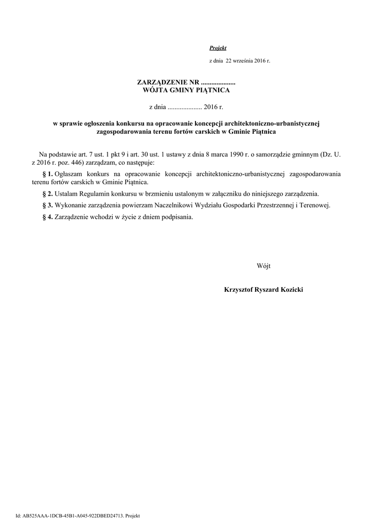 Projekt z dnia 22 września 2016 r. ZARZĄDZENIE NR .................... WÓJTA GMINY PIĄTNICA z dnia .................... 2016 r. w sprawie ogłoszenia konkursu na opracowanie koncepcji architektoniczno-urbanistycznej zagospodarowania terenu fortów carskich w Gminie Piątnica Na podstawie art. 7 ust. 1 pkt 9 i art. 30 ust. 1 ustawy z dnia 8 marca 1990 r. o samorządzie gminnym (Dz. U. z 2016 r. poz. 446) zarządzam, co następuje: § 1. Ogłaszam konkurs na opracowanie koncepcji architektoniczno-urbanistycznej zagospodarowania terenu fortów carskich w Gminie Piątnica. § 2. Ustalam Regulamin konkursu w brzmieniu ustalonym w załączniku do niniejszego zarządzenia. § 3. Wykonanie zarządzenia powierzam Naczelnikowi Wydziału Gospodarki Przestrzennej i Terenowej. § 4. Zarządzenie wchodzi w życie z dniem podpisania. Wójt Krzysztof Ryszard Kozicki Id: AB525AAA-1DCB-45B1-A045-922DBED24713. Projekt Załącznik do Zarządzenia Nr .................... Wójta Gminy Piątnica z dnia .................... 2016 r. Regulamin konkursu na koncepcję architektoniczno-urbanistyczną zagospodarowania terenu fortów carskich w Gminie Piątnica Niniejszy regulamin określa zasady, zakres i warunki uczestnictwa w otwartym, jednoetapowym konkursie architektoniczno-urbanistycznym na koncepcję zagospodarowania zabytkowego, gminnego terenu fortów carskich w Piątnicy (zwany dalej Konkursem). I. Postanowienia ogólne 1. Organizatorem konkursu jest Urząd Gminy Piątnica, a jego Koordynatorem Wydział Gospodarki Przestrzennej i Terenowej. 2. Konkurs ma na celu wyłonienie koncepcji zagospodarowania terenu będącego własnością Gminy Piątnica – obszaru dawnych fortów carskich. 3. Regulamin określa zasady udziału w organizowanym Konkursie i zawiera warunki uczestnictwa. Konkurs dotyczy tej części fortów dla której właścicielem jest Gmina Piątnica. 4. Konkurs prowadzony i rozstrzygany jest w języku polskim. Dokumenty oraz część graficzna i opisowa konkursu muszą być sporządzone w języku polskim. 5. Konkurs trwa od 23 września do 28 października 2016 r. Składanie pytań i udzielanie odpowiedzi dla zainteresowanych uczestnictwem w konkursie – do 14 października 2016 roku. Nadsyłanie (zgłaszanie) prac konkursowych – do 28 października 2016 roku, do godz. 1500 (liczy się data faktycznego wpływu a nie nadania w placówce pocztowej). Wskazane terminy mogą ulec zmianie. O ewentualnej zmianie terminów Organizator Konkursu niezwłocznie poinformuje Uczestników Konkursu na stronie internetowej http://www.gminapiatnica.pl. II. Zasady uczestnictwa 1. Uczestnictwo w konkursie oznacza akceptację postanowień niniejszego regulaminu oraz zgodę uczestnika na przetwarzanie i prezentację jego danych osobowych dla celów związanych z przeprowadzeniem Konkursu (zgodnie z ustawą z dnia 29 sierpnia 1997 r. o ochronie danych osobowych Dz. U. 2016.922 z dnia 28.06.2016 r.). 2. Konkurs ma charakter otwarty, adresowany jest do wszystkich osób pełnoletnich, które uważają, że posiadają odpowiednią wiedzę i umiejętności do wykonania pracy konkursowej. Uczestnikiem Konkursu (dalej zwana Uczestnikiem Konkursu lub Uczestnikiem) nie może być osoba, będąca pracownikiem Urzędu Gminy Piątnica oraz jednostek organizacyjnych Gminy Piątnica. 3. Udział w Konkursie jest bezpłatny. 4. Do Konkursu należy zgłaszać projekty własnego autorstwa, załączając stosowne oświadczenie na karcie zgłoszenia, stanowiącej załącznik do niniejszego Regulaminu. 5. Opracowanie konkursowe powinno być dostarczone na planszach (kartach) w wybranym formacie. Do opracowania należy dołączyć płytę CD z wygenerowanymi planszami (kartami) w formacie .pdf lub .jpg w rozdzielczości min. 200 dpi, lub jej skanami w rozdzielczości min. 200 dpi. 6. Skala opracowania: plan zagospodarowania terenu 1:5000, rzuty i elewacje obiektów 1:1000. 7. Technika opracowania: dowolna, lecz dająca się reprodukować. Opracowanie powinno zawierać wizualizację z uwzględnieniem rzeźby terenu oraz planowanych urządzeń i obiektów (min. 10 ujęć). 8. Do projektu należy dołączyć opis o objętości do 4 kart formatu A4. 9. Opracowanie należy przesłać pocztą lub dostarczyć osobiście do Kancelarii Urzędu Gminy Piątnica do dnia 28 października 2016 r. do godz. 1500 w nieprzezroczystym 1 Id: AB525AAA-1DCB-45B1-A045-922DBED24713. Projekt opakowaniu z następującym oznaczeniem: „Przywrócenie stanu pierwotnego carskich fortów z XIX wieku w Piątnicy Poduchownej”, wraz z pismem przewodnim umożliwiającym identyfikację jednostki przygotowującej koncepcję. Koperta powinna uniemożliwiać odczytanie zawartości. 10. Koncepcje złożone do Konkursu oceni powołana Komisja Konkursowa, która wyłoni zwycięską koncepcję. 11. W skład Komisji Konkursowej wejdą, powołani przez Wójta Gminy Piątnica, przedstawiciele Urzędu Gminy Piątnica, przedstawiciele urzędów Konserwatora Zabytków oraz Ochrony Środowiska, przedstawiciel Rady Gminy Piątnica oraz zaproszeni projektanci. 12. Komisja Konkursowa wyłoni spośród siebie Przewodniczącego. 13. Komisja Konkursowa podejmie decyzję w sprawie wyłonienia zwycięzcy i pozostałych laureatów większością głosów. W razie równego rozkładu głosów zadecyduje głos Przewodniczącego Komisji Konkursowej. 14. Nagrody mogą zostać przyznane pracom, które spełniają warunki konkursu, zgodnie z Regulaminem Konkursu. 15. Komisja Konkursowa preferować będzie rozwiązania funkcjonalno-przestrzenne w pełni wykorzystujące potencjał terenu i obiektów fortecznych, w których harmonijne rozwiązania przestrzenne będą szły w parze z zachowaniem wysokich standardów historycznych, użytkowych i estetycznych. Premiowane będą: a) oryginalność rozwiązań i atrakcyjność dla mieszkańców i turystów, b) twórcze nawiązanie do lokalnej tradycji, c) funkcjonalność oraz bezpieczeństwo użytkowania, d) łatwość utrzymania obiektów, niskie kos