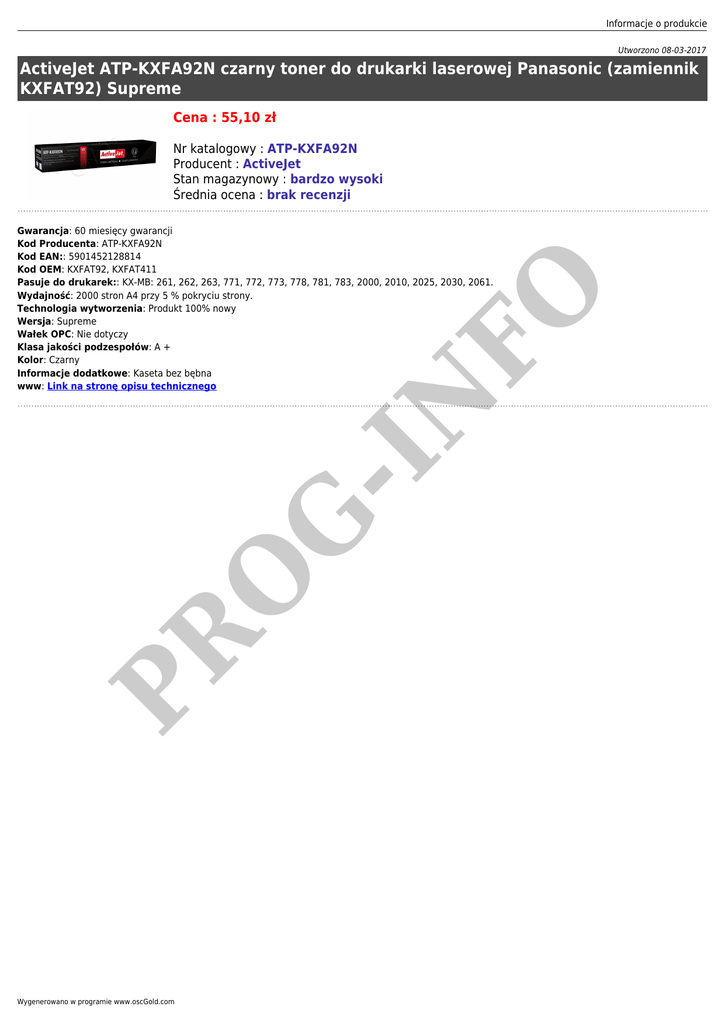 Informacje o produkcie Utworzono 08-03-2017 ActiveJet ATP-KXFA92N czarny toner do drukarki laserowej Panasonic (zamiennik KXFAT92) Supreme Cena : 55,10 zł Nr katalogowy : ATP-KXFA92N Producent : ActiveJet Stan magazynowy : bardzo wysoki Średnia ocena : brak recenzji PR O G -I N FO Gwarancja: 60 miesięcy gwarancji Kod Producenta: ATP-KXFA92N Kod EAN:: 5901452128814 Kod OEM: KXFAT92, KXFAT411 Pasuje do drukarek:: KX-MB: 261, 262, 263, 771, 772, 773, 778, 781, 783, 2000, 2010, 2025, 2030, 2061. Wydajność: 2000 stron A4 przy 5 % pokryciu strony. Technologia wytworzenia: Produkt 100% nowy Wersja: Supreme Wałek OPC: Nie dotyczy Klasa jakości podzespołów: A + Kolor: Czarny Informacje dodatkowe: Kaseta bez bębna www: Link na stronę opisu technicznego Wygenerowano w programie www.oscGold.com