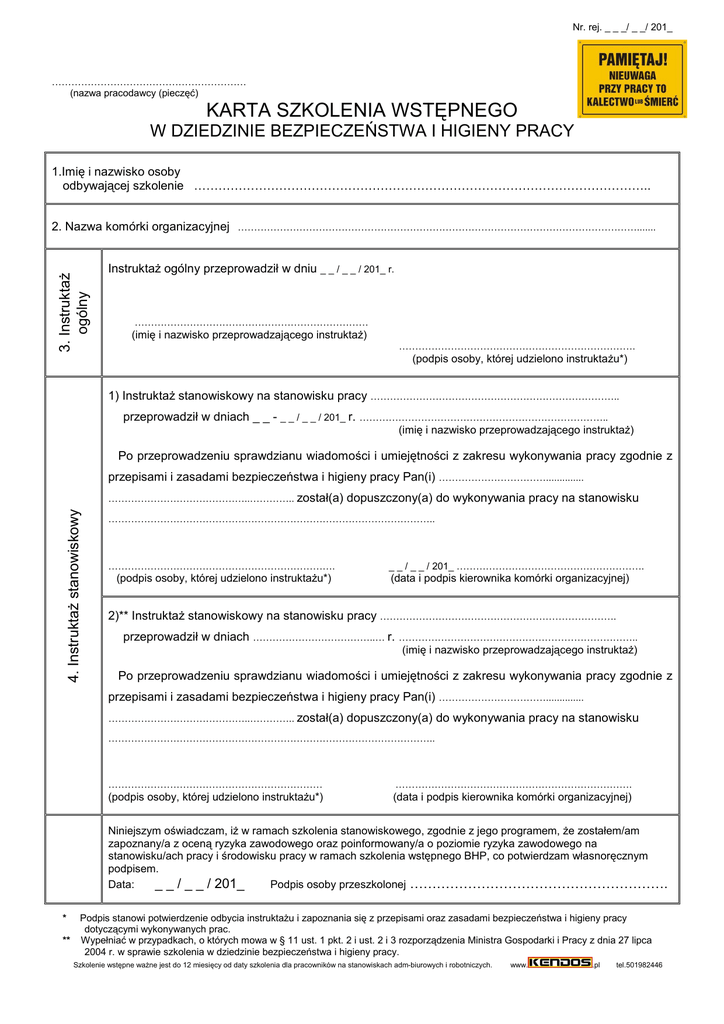 Nr. rej. _ _ _/ _ _/ 201_ …………………………………………………… (nazwa pracodawcy (pieczęć) KARTA SZKOLENIA WSTĘPNEGO W DZIEDZINIE BEZPIECZEŃSTWA I HIGIENY PRACY 1.Imię i nazwisko osoby odbywającej szkolenie ………………………………………………………………………………………………….. 3. InstruktaŜ ogólny 2. Nazwa komórki organizacyjnej ……………………………………………………………………………………………………………....... InstruktaŜ ogólny przeprowadził w dniu _ _ / _ _ / 201_ r. ……………………………………………………………… (imię i nazwisko przeprowadzającego instruktaŜ) ………………………………………………………………. (podpis osoby, której udzielono instruktaŜu*) 1) InstruktaŜ stanowiskowy na stanowisku pracy ………………………………………………………………….. przeprowadził w dniach _ _ - _ _ / _ _ / 201_ r. ………………………………………………………………….. (imię i nazwisko przeprowadzającego instruktaŜ) Po przeprowadzeniu sprawdzianu wiadomości i umiejętności z zakresu wykonywania pracy zgodnie z przepisami i zasadami bezpieczeństwa i higieny pracy Pan(i) …………………………….............. 4. InstruktaŜ stanowiskowy ……………………………………..………….. został(a) dopuszczony(a) do wykonywania pracy na stanowisku ……………………………………………………………………………………….. ……………………………………………………………. (podpis osoby, której udzielono instruktaŜu*) _ _ / _ _ / 201_ …………………………………………………. (data i podpis kierownika komórki organizacyjnej) 2)** InstruktaŜ stanowiskowy na stanowisku pracy ………………………………………………………………. przeprowadził w dniach ………………………………..… r. ……………………………………………………………….. (imię i nazwisko przeprowadzającego instruktaŜ) Po przeprowadzeniu sprawdzianu wiadomości i umiejętności z zakresu wykonywania pracy zgodnie z przepisami i zasadami bezpieczeństwa i higieny pracy Pan(i) …………………………….............. ……………………………………..………….. został(a) dopuszczony(a) do wykonywania pracy na stanowisku ……………………………………………………………………………………….. ………………………………………………………… ………………………………………………………………. (podpis osoby, której udzielono instruktaŜu*) (data i podpis kierownika komórki organizacyjnej) Niniejszym oświadczam, iŜ w ramach szkolenia stanowiskowego, zgodnie z jego programem, Ŝe zostałem/am zapoznany/a z oceną ryzyka zawodowego oraz poinformowany/a o poziomie ryzyka zawodowego na stanowisku/ach pracy i środowisku pracy w ramach szkolenia wstępnego BHP, co potwierdzam własnoręcznym podpisem. Data: _ _ / _ _ / 201_ Podpis osoby przeszkolonej …………………………………………………. * Podpis stanowi potwierdzenie odbycia instruktaŜu i zapoznania się z przepisami oraz zasadami bezpieczeństwa i higieny pracy dotyczącymi wykonywanych prac. ** Wypełniać w przypadkach, o których mowa w § 11 ust. 1 pkt. 2 i ust. 2 i 3 rozporządzenia Ministra Gospodarki i Pracy z dnia 27 lipca 2004 r. w sprawie szkolenia w dziedzinie bezpieczeństwa i higieny pracy. Szkolenie wstępne waŜne jest do 12 miesięcy od daty szkolenia dla pracowników na stanowiskach adm-biurowych i robotniczych. www. .pl tel.501982446 PROGRAM INSTRUKTAśU OGÓLNEGO Temat szkolenia*) Lp. 1 3 Istota bezpieczeństwa i higieny pracy. Zakres obowiązków i uprawnień pracodawcy, pracowników oraz poszczególnych komórek organizacyjnych zakładu pracy i organizacji społecznych w zakresie bezpieczeństwa i higieny pracy. Odpowiedzialność za naruszenie przepisów lub zasad bezpieczeństwa i higieny pracy. 4 Zasady poruszania się na terenie zakładu pracy. 2 Liczba godzin**) 0,6 0,5 ZagroŜenia wypadkowe i zagroŜenia dla zdrowia występujące w zakładzie oraz podstawowe środki zapobiegawcze. Ryzyko zawodowe oraz zasady ochrony przed zagroŜeniami. Podstawowe zasady bezpieczeństwa i higieny pracy związane z obsługą urządzeń technicznych oraz transportem wewnątrzzakładowym. Zasady przydziału odzieŜy roboczej i obuwia roboczego oraz środków ochrony indywidualnej, w tym w odniesieniu do stanowiska pracy instruowanego. Postępowanie powypadkowe - obowiązki pracownika i pracodawcy. Porządek i czystość w miejscu pracy oraz higiena osobista pracownika - ich wpływ na zdrowie i bezpieczeństwo pracownika. Profilaktyczna opieka lekarska - zasady jej sprawowania w odniesieniu do stanowiska pracy instruowanego Podstawowe zasady ochrony przeciwpoŜarowej oraz postępowania w razie poŜaru. Organizacja i zasady udzielania pomocy przedlekarskiej w razie wypadku. RAZEM 5 6 7 8 9 10 11 12 0,4 0,5 1,0 3,0 *)program szkolenia podejmujących po raz pierwszy prace związaną z kierowaniem pracownikami powinien być poszerzony i dostosowany do obowiązków i odpowiedzialności tych osób w zakresie bezpieczeństwa i higieny pracy. ) ** w godzinach lekcyjnych trwających 45 minut. PROGRAM INSTRUKTAśU STANOWISKOWEGO Temat szkolenia Lp. 1. Liczba godzin*) InstruktaŜu osób wymienionych w §11 ust.1 rozporządzenia (nie dotyczy pracowników wymienionych w kolumnie 4) InstruktaŜu pracowników administracyjnobiurowych naraŜonych na działanie czynników uciąŜliwych 2,0 2,0 Przygotowanie pracownika do wykonywania określonej pracy, w tym w szczególności: a). omówienie warunków pracy z uwzględnieniem: • elementów pomieszczenia pracy, w którym ma pracować pracownik, mający wpływ na warunki pracy p