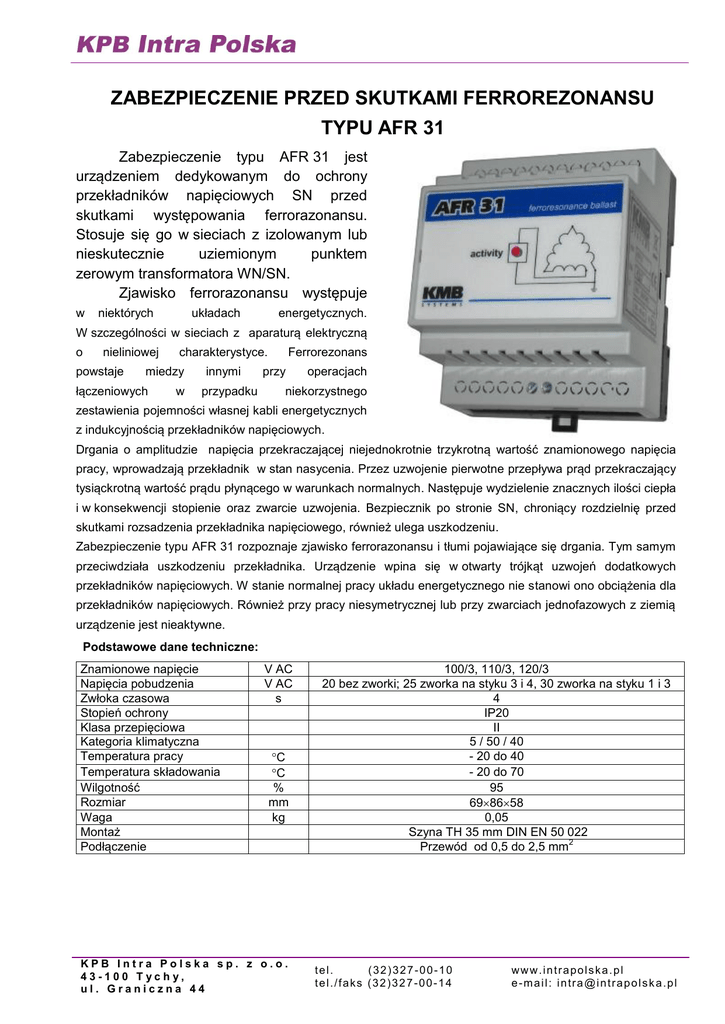 ZABEZPIECZENIE PRZED SKUTKAMI FERROREZONANSU TYPU AFR 31 Zabezpieczenie typu AFR 31 jest urządzeniem dedykowanym do ochrony przekładników napięciowych SN przed skutkami występowania ferrorazonansu. Stosuje się go w sieciach z izolowanym lub nieskutecznie uziemionym punktem zerowym transformatora WN/SN. Zjawisko ferrorazonansu występuje w niektórych układach energetycznych. W szczególności w sieciach z aparaturą elektryczną o nieliniowej powstaje charakterystyce. miedzy łączeniowych w innymi przypadku Ferrorezonans przy operacjach niekorzystnego zestawienia pojemności własnej kabli energetycznych z indukcyjnością przekładników napięciowych. Drgania o amplitudzie napięcia przekraczającej niejednokrotnie trzykrotną wartość znamionowego napięcia pracy, wprowadzają przekładnik w stan nasycenia. Przez uzwojenie pierwotne przepływa prąd przekraczający tysiąckrotną wartość prądu płynącego w warunkach normalnych. Następuje wydzielenie znacznych ilości ciepła i w konsekwencji stopienie oraz zwarcie uzwojenia. Bezpiecznik po stronie SN, chroniący rozdzielnię przed skutkami rozsadzenia przekładnika napięciowego, również ulega uszkodzeniu. Zabezpieczenie typu AFR 31 rozpoznaje zjawisko ferrorazonansu i tłumi pojawiające się drgania. Tym samym przeciwdziała uszkodzeniu przekładnika. Urządzenie wpina się w otwarty trójkąt uzwojeń dodatkowych przekładników napięciowych. W stanie normalnej pracy układu energetycznego nie stanowi ono obciążenia dla przekładników napięciowych. Również przy pracy niesymetrycznej lub przy zwarciach jednofazowych z ziemią urządzenie jest nieaktywne. Podstawowe dane techniczne: Znamionowe napięcie Napięcia pobudzenia Zwłoka czasowa Stopień ochrony Klasa przepięciowa Kategoria klimatyczna Temperatura pracy Temperatura składowania Wilgotność Rozmiar Waga Montaż Podłączenie V AC V AC s C C % mm kg KPB Intra Polska sp. z o.o. 43-100 T ych y, ul. Graniczna 44 100/3, 110/3, 120/3 20 bez zworki; 25 zworka na styku 3 i 4, 30 zworka na styku 1 i 3 4 IP20 II 5 / 50 / 40 - 20 do 40 - 20 do 70 95 698658 0,05 Szyna TH 35 mm DIN EN 50 022 2 Przewód od 0,5 do 2,5 mm tel. (32)327-00-10 tel./faks (32)327-00-14 www.intrapolska.pl e-mail: [email protected] Schematy elektryczne Sposób podłączenia zworki na płytce Szkic wymiarowy AFR 31 KPB Intra Polska sp. z o.o. 43-100 T ych y, ul. Graniczna 44 tel. (32)327-00-10 tel./faks (32)327-00-14 www.intrapolska.pl e-mail: [email protected]