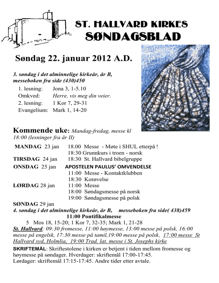 ST. Hallvard kirkes søndagsblad Søndag 22. januar 2012 A.D. 3. søndag i det alminnelige kirkeår, år B, messeboken fra side (430)450 1. lesning: Omkved: 2. lesning: Evangelium: Jona 3, 1-5.10 Herre, vis meg din veier. 1 Kor 7, 29-31 Mark 1, 14-20 Kommende uke: Mandag-fredag, messe kl 18:00 (lesninger fra år II) MANDAG 23 jan TIRSDAG 24 jan ONSDAG 25 jan LØRDAG 28 jan 18.00 Messe - Møte i SHUL etterpå ! 18:30 Grunnkurs i troen - norsk 18:30 St. Hallvard bibelgruppe APOSTELEN PAULUS’ OMVENDELSE 11:00 Messe - Kontaktklubben 18:30 Korøvelse 11:00 Messe 18:00 Søndagsmesse på norsk 19:00 Søndagsmesse på polsk SØNDAG 29 jan 4. søndag i det alminnelige kirkeår, år B, messeboken fra side( 438)459 11:00 Pontifikalmesse 5 Mos 18, 15-20; 1 Kor 7, 32-35; Mark 1, 21-28 St. Hallvard: 09:30 fromesse, 11:00 høymesse, 13:00 messe på polsk, 16:00 messe på engelsk, 17:30 messe på tamil,19:00 messe på polsk, 17:00 messe St Hallvard syd, Holmlia, 19:00 Trad. lat. messe i St. Josephs kirke SKRIFTEMÅL: Skriftestolene i kirken er betjent i tiden mellom fromesse og høymesse på søndager. Hverdager: skriftemål 17:00-17:45. Lørdager: skriftemål 17:15-17:45. Andre tider etter avtale. Tilbud til familier, barn, ungdommer KATEKESE/ KONFIRMANTUNDERVISNING Katekesen/ konfirmantundervisningen har startet opp igjen. I fremtiden skal 8. og 9. klasse ha konfirmantundervisningen. De som går i 8. klasse nå, bes derfor å melde seg på konfirmantkurs ved å fylle ut påmeldingsskjema. Ta gjerne kontakt med menigheten. Det blir en overgangsgruppe for de som allerede har begynt med vanlig katekese i 8. klasse i dette skoleåret. FAMILIEKORET Annenhver mandag er det FAMILIEKOR i menigheten. De som ønsker, møter fra 16:45 og får servert middag, kr 20 pr person eller 80 kr pr. familie. Kl. 17:30 starter korøvelsen! Vi avslutter kl. 18:30! Neste øvelse er mandag 30. januar. Velkommen! SHUL St. Hallvard Ungdoms Lag møtes hver mandag. Vi starter med messe kl. 18:00 og fortsetter i den nye menighetsalen etterpå. Ungdomslaget er for ungdom fra 13 år og oppover. Neste gang vi treffes er 23. januar. Velkommen! SØNDAGSKOLEN I St. Hallvard tilbyr vi ordets liturgi for barn hver høymesse (ikke når det er familiemesse). Barna går ut til menighetsalen under tekstlesing og preken, og der vil de få formidlet det samme budskapet, men på en barnevennlig måte. NB! Barn under 4 år, må være i følge med VOKSEN. Velkommen! THERESE SKAAR er barne- og ungdomsarbeider i St. Hallvard menighet. Therese har ansvar for familiekor, SHUL- St. Hallvard UngdomsLag, familietreff og søndagsskolen. Hun har fast kontordag på tirsdag. Du kan treffe henne på tlf. 23303200/40436427 eller e-post [email protected] ANGELIKA WIMMER er menighetens katekesekoordinator. Alle henvendelser som angår katekesen tar hun seg av. Angelika treffer du på kontoret onsdag-fredag på tlf 2330300eller på e-post: [email protected] Oppslagstavle FREDNING AV ST. HALLVARD KIRKE OG KLOSTER Høsten 2011 ble kirkebygget og det gamle klosteret fredet av riksantikvaren. Dette markeres i høymessen søndag 29. januar kl 11:00 ved en pontifikalmesse. Messen feires ved biskop Bernt Eidsvig og menighetens prester. Arkitekt Kjell Lund, riksantikvar og byantikvar vil være tilstede. I DEN ANLEDNING VIL BOKSKAPET TILBY: Praktboken ST HALLVARD KIRKE OG KLOSTER (kr 200) er til salgs ved Bokskapet. Boken forteller på norsk og engelsk om kirkens historie og om symbolikken i byggverket, og viser med vakre fotografier lysets sentral betydning. Boken FRA URTEGATEN TIL ENERHAUGEN ... av Johannes Bruce (kr 25) anbefales også. Hvordan begynte menigheten St Hallvard? Hvordan var det før denne kirken ble bygg? Middag til inntekt for St. Martin kirke! Lørdag 11. februar 2012 kl 18:30 arrangerer noen av menighetens ildsjeler, damer fra den filippinske gruppen, middag i St. Hallvards menighetslokaler. Middagen koster 300 kr og består av seks retter og alkoholfri drikke. Det blir også underholdning. Hele beløpet går uavkortet til St. Martin kirke. Frist for kjøp av billetter er 31. januar 2012. Billetter kan kjøpes på menighetskontoret, under kirkekaffen eller hos prestene. Beløpet kan betales via terminal i kirken eller overføres St. Hallvards bankkonto 3000.22.49134 merket «Middag» Benytt denne fenomenale sjansen til å støtte byggingen av St. Martin kirke. BØNNEUKEN FOR KRISTEN ENHET 2012 Onsdag, 25.januar kl 19.00 feirer vi i klosterets kapell årets økumeniske gudstjeneste i samarbeid med Tonsen menighet. Preken ved Revd. Canon Janet Heil, St. Edmund's kirke i Oslo. Etter gudstjenesten er det kirkekaffe og underholdning. For 40 år siden: 24. janauar 1972 ble det holdt den 1. økumeniske gudstjeneste under Bønneuken for Kristen Enhet i klosterets kapell på Lunden. Denne gangen var det biskop Alex Johnson, bror til vår søster Ida Sunniva Johnson, som holdt preken. ALLE ER HJERTELIG VELKOMMEN! Relaterte lenker: www.katolsk.no www.vatican.va ”Vi skal alle bli forvandlet ved seieren i Jesus Kristus, vår Herre” (1.Kor 15:51-58) Takk til alle som har bidratt til ukens kollekter: kr kr kr kr kr kr 1 307,00 246,50 609,00 2 035,50 5 910,50 3 722,00 katekesemesse messe lørdag kveld, norsk messe lørdag kveld, polsk fromesse, norsk høymesse, norsk messe på polsk kr kr kr kr kr. kr 1 951,00 1 655,50 1 104,00 1 215,00 1 215,00 1 041,50 messe,engelsk messe på tamil messe,polsk søndag kveld messe Nesodden messe på Holmlia kirkekaffe Resultatet av årets adventsaksjon ble kr 70 000! Today: Third Sunday in Ordinary Time (Year B) First reading: Jonah 3:1-5,10 Response: Teach me your ways, O Lord Second reading: Corinthians 7:29-31 Gospel: Mark 1:14-20 Next week: Monday - Friday - Mass at 6pm (Norwegian) (readings from year II) Mon 23 Jan 6.00pm Youth mass followed by St Hallvard Youth Group (SHUL) meeting 6.30pm Course in the Catholic Faith (Norwegian) Tues 24 Jan Wed 25 Jan Sat 28 Jan Sun 29 Jan 6.30pm St Hallvard’s Bible Group The Conversion