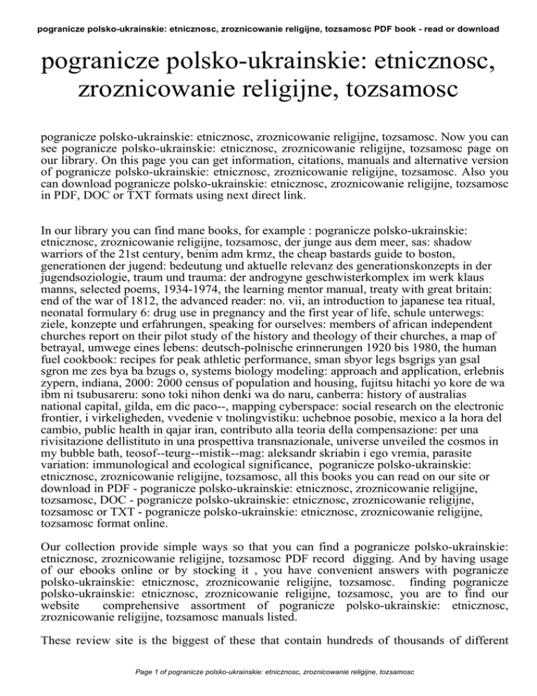 pogranicze polsko-ukrainskie: etnicznosc, zroznicowanie religijne, tozsamosc PDF book - read or download pogranicze polsko-ukrainskie: etnicznosc, zroznicowanie religijne, tozsamosc pogranicze polsko-ukrainskie: etnicznosc, zroznicowanie religijne, tozsamosc. Now you can see pogranicze polsko-ukrainskie: etnicznosc, zroznicowanie religijne, tozsamosc page on our library. On this page you can get information, citations, manuals and alternative version of pogranicze polsko-ukrainskie: etnicznosc, zroznicowanie religijne, tozsamosc. Also you can download pogranicze polsko-ukrainskie: etnicznosc, zroznicowanie religijne, tozsamosc in PDF, DOC or TXT formats using next direct link. In our library you can find mane books, for example : pogranicze polsko-ukrainskie: etnicznosc, zroznicowanie religijne, tozsamosc, der junge aus dem meer, sas: shadow warriors of the 21st century, benim adm krmz, the cheap bastards guide to boston, generationen der jugend: bedeutung und aktuelle relevanz des generationskonzepts in der jugendsoziologie, traum und trauma: der androgyne geschwisterkomplex im werk klaus manns, selected poems, 1934-1974, the learning mentor manual, treaty with great britain: end of the war of 1812, the advanced reader: no. vii, an introduction to japanese tea ritual, neonatal formulary 6: drug use in pregnancy and the first year of life, schule unterwegs: ziele, konzepte und erfahrungen, speaking for ourselves: members of african independent churches report on their pilot study of the history and theology of their churches, a map of betrayal, umwege eines lebens: deutsch-polnische erinnerungen 1920 bis 1980, the human fuel cookbook: recipes for peak athletic performance, sman sbyor legs bsgrigs yan gsal sgron me zes bya ba bzugs o, systems biology modeling: approach and application, erlebnis zypern, indiana, 2000: 2000 census of population and housing, fujitsu hitachi yo kore de wa ibm ni tsubusareru: sono toki nihon denki wa do naru, canberra: history of australias national capital, gilda, em dic paco--, mapping cyberspace: social research on the electronic frontier, i virkeligheden, vvedenie v tnolingvistiku: uchebnoe posobie, mexico a la hora del cambio, public health in qajar iran, contributo alla teoria della compensazione: per una rivisitazione dellistituto in una prospettiva transnazionale, universe unveiled the cosmos in my bubble bath, teosof--teurg--mistik--mag: aleksandr skriabin i ego vremia, parasite variation: immunological and ecological significance, pogranicze polsko-ukrainskie: etnicznosc, zroznicowanie religijne, tozsamosc, all this books you can read on our site or download in PDF - pogranicze polsko-ukrainskie: etnicznosc, zroznicowanie religijne, tozsamosc, DOC - pogranicze polsko-ukrainskie: etnicznosc, zroznicowanie religijne, tozsamosc or TXT - pogranicze polsko-ukrainskie: etnicznosc, zroznicowanie religijne, tozsamosc format online. Our collection provide simple ways so that you can find a pogranicze polsko-ukrainskie: etnicznosc, zroznicowanie religijne, tozsamosc PDF record digging. And by having usage of our ebooks online or by stocking it , you have convenient answers with pogranicze polsko-ukrainskie: etnicznosc, zroznicowanie religijne, tozsamosc. finding pogranicze polsko-ukrainskie: etnicznosc, zroznicowanie religijne, tozsamosc, you are to find our website comprehensive assortment of pogranicze polsko-ukrainskie: etnicznosc, zroznicowanie religijne, tozsamosc manuals listed. These review site is the biggest of these that contain hundreds of thousands of different Page 1 of pogranicze polsko-ukrainskie: etnicznosc, zroznicowanie religijne, tozsamosc pogranicze polsko-ukrainskie: etnicznosc, zroznicowanie religijne, tozsamosc PDF book - read or download literally products represented. So as to there are specific sites catered to different product also categories or types, brands or niches related with pogranicze polsko-ukrainskie: etnicznosc, zroznicowanie religijne, tozsamosc. So depending on what exactly you are searching, you'll be able to choose ebooks pogranicze polsko-ukrainskie: etnicznosc, zroznicowanie religijne, tozsamosc to suit your own needs, pogranicze polsko-ukrainskie: etnicznosc, zroznicowanie religijne, tozsamosc. Page 2 of pogranicze polsko-ukrainskie: etnicznosc, zroznicowanie religijne, tozsamosc