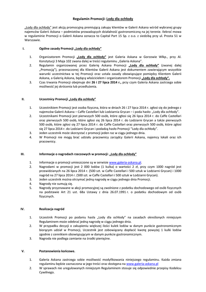 Regulamin Promocji: Lody dla ochłody „Lody dla ochłody” jest akcją promocyjną premiującą zakupy klientów w Galerii Askana wśród wybranej grupy najemców Galerii Askana – podmiotów prowadzących działalność gastronomiczną na jej terenie. Ilekroć mowa w regulaminie Promocji o Galerii Askana oznacza to Capital Part 15 Sp. z o.o. z siedzibą przy ul. Prosta 51 w Warszawie. I. Ogólne zasady Promocji „Lody dla ochłody” 1. 2. 3. II. Organizatorem Promocji „Lody dla ochłody” jest Galeria Askana w Gorzowie Wlkp., przy Al. Konstytucji 3 Maja 102 zwana dalej w treści regulaminu „Galeria Askana”. Regulamin organizowanej przez Galerię Askana Promocji „Lody dla ochłody” (zwanej dalej „Promocją”), przeznaczonej dla Klientów Galerii Askana jest dokumentem zawierającym wszystkie warunki uczestnictwa w tej Promocji oraz ustala zasady obowiązujące pomiędzy Klientem Galerii Askana, a Galerią Askana, będącą właścicielem i organizatorem Promocji „Lody dla ochłody”. Czas trwania Promocji obejmuje dni 26 i 27 lipca 2014 r., przy czym Galeria Askana zastrzega sobie możliwość jej skrócenia lub przedłużenia. Uczestnicy Promocji „Lody dla ochłody” 1. 2. 3. 4. III. Uczestnikiem Promocji jest osoba fizyczna, która w dniach 26 i 27 lipca 2014 r. zgłosi się do jednego z najemców Galerii Askana – Caffe Castellari lub Lodziarnia Grycan – i poda hasło: „Lody dla ochłody”. Uczestnikami Promocji jest pierwszych 500 osób, które zgłosi się 26 lipca 2014 r. do Caffe Castellari oraz pierwszych 500 osób, które zgłosi się 26 lipca 2014 r. do Lodziarni Grycan a także pierwszych 500 osób, które zgłosi się 27 lipca 2014 r. do Caffe Castellari oraz pierwszych 500 osób, które zgłosi się 27 lipca 2014 r. do Lodziarni Grycan i podadzą hasło Promocji ”Lody dla ochłody”. Jeden uczestnik może skorzystać z promocji jeden raz w ciągu jednego dnia. W Promocji nie mogą brać udziału pracownicy zarządcy Galerii Askana, najemcy lokali oraz ich pracownicy. Informacje o nagrodach rzeczowych w promocji: „Lody dla ochłody” 1. 2. 3. 4. 5. IV. Informacje o promocji umieszczone są w serwisie www.galeria-askana.pl. Nagrodami w promocji jest 2 000 lodów (1 kulka) o wartości 2 zł, przy czym 1000 nagród jest przewidzianych na 26 lipca 2014 r. (500 szt. w Caffe Castellari i 500 sztuk w Lodziarni Grycan) i 1000 nagród na 27 lipca 2014 r. (500 szt. w Caffe Castellari i 500 sztuk w Lodziarni Grycan). Jeden uczestnik można otrzymać jedną nagrodę w ciągu jednego dnia Promocji. Nagrody nie sumują się. Nagrody przyznawane w akcji promocyjnej są zwolnione z podatku dochodowego od osób fizycznych na podstawie Art 21 ust. 68a Ustawy z dnia 26.07.1991 r. o podatku dochodowym od osób fizycznych. Realizacja nagród 1. 2. 3. V. Uczestnik Promocji po podaniu hasła „Lody dla ochłody” na zasadach określonych niniejszym Regulaminem może odebrać jedną nagrodę w ciągu jednego dnia. W przypadku decyzji o zakupieniu większej ilości kulek lodów w danym punkcie gastronomicznym biorącym udział w Promocji, Uczestnik jest zobowiązany dopłacić kwotę powyżej 1 kulki lodów zgodnie z cennikiem obowiązującym w danym punkcie gastronomicznym. Nagroda nie podlega zamianie na środki pieniężne. Postanowienia końcowe. 1. 2. Galeria Askana zastrzega sobie możliwość modyfikowania niniejszego regulaminu. Każda zmiana regulaminu będzie zaznaczona w jego treści oraz dostępna na www.galeria-askana.pl W sprawach nie uregulowanych niniejszym Regulaminem stosuje się odpowiednie przepisy Kodeksu Cywilnego.