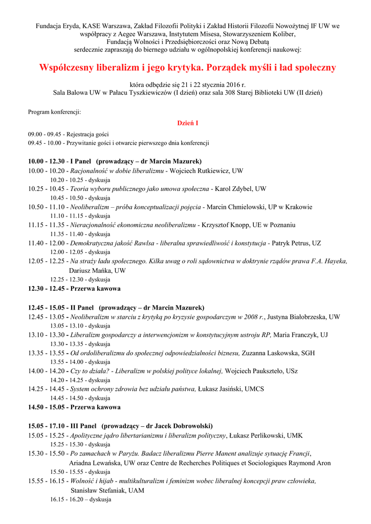 Fundacja Eryda, KASE Warszawa, Zakład Filozofii Polityki i Zakład Historii Filozofii Nowożytnej IF UW we współpracy z Aegee Warszawa, Instytutem Misesa, Stowarzyszeniem Koliber, Fundacją Wolności i Przedsiębiorczości oraz Nową Debatą serdecznie zapraszają do biernego udziału w ogólnopolskiej konferencji naukowej: Współczesny liberalizm i jego krytyka. Porządek myśli i ład społeczny która odbędzie się 21 i 22 stycznia 2016 r. Sala Balowa UW w Pałacu Tyszkiewiczów (I dzień) oraz sala 308 Starej Biblioteki UW (II dzień) Program konferencji: Dzień I 09.00 - 09.45 - Rejestracja gości 09.45 - 10.00 - Przywitanie gości i otwarcie pierwszego dnia konferencji 10.00 - 12.30 - I Panel (prowadzący – dr Marcin Mazurek) 10.00 - 10.20 - Racjonalność w dobie liberalizmu - Wojciech Rutkiewicz, UW 10.20 - 10.25 - dyskusja 10.25 - 10.45 - Teoria wyboru publicznego jako umowa społeczna - Karol Zdybel, UW 10.45 - 10.50 - dyskusja 10.50 - 11.10 - Neoliberalizm – próba konceptualizacji pojęcia - Marcin Chmielowski, UP w Krakowie 11.10 - 11.15 - dyskusja 11.15 - 11.35 - Nieracjonalność ekonomiczna neoliberalizmu - Krzysztof Knopp, UE w Poznaniu 11.35 - 11.40 - dyskusja 11.40 - 12.00 - Demokratyczna jakość Rawlsa - liberalna sprawiedliwość i konstytucja - Patryk Petrus, UZ 12.00 - 12.05 - dyskusja 12.05 - 12.25 - Na straży ładu społecznego. Kilka uwag o roli sądownictwa w doktrynie rządów prawa F.A. Hayeka, Dariusz Mańka, UW 12.25 - 12.30 - dyskusja 12.30 - 12.45 - Przerwa kawowa 12.45 - 15.05 - II Panel (prowadzący – dr Marcin Mazurek) 12.45 - 13.05 - Neoliberalizm w starciu z krytyką po kryzysie gospodarczym w 2008 r., Justyna Białobrzeska, UW 13.05 - 13.10 - dyskusja 13.10 - 13.30 - Liberalizm gospodarczy a interwencjonizm w konstytucyjnym ustroju RP, Maria Franczyk, UJ 13.30 - 13.35 - dyskusja 13.35 - 13.55 - Od ordoliberalizmu do społecznej odpowiedzialności biznesu, Zuzanna Laskowska, SGH 13.55 - 14.00 - dyskusja 14.00 - 14.20 - Czy to działa? - Liberalizm w polskiej polityce lokalnej, Wojciech Paukszteło, USz 14.20 - 14.25 - dyskusja 14.25 - 14.45 - System ochrony zdrowia bez udziału państwa, Łukasz Jasiński, UMCS 14.45 - 14.50 - dyskusja 14.50 - 15.05 - Przerwa kawowa 15.05 - 17.10 - III Panel (prowadzący – dr Jacek Dobrowolski) 15.05 - 15.25 - Apolityczne jądro libertarianizmu i liberalizm polityczny, Łukasz Perlikowski, UMK 15.25 - 15.30 - dyskusja 15.30 - 15.50 - Po zamachach w Paryżu. Badacz liberalizmu Pierre Manent analizuje sytuację Francji, Ariadna Lewańska, UW oraz Centre de Recherches Politiques et Sociologiques Raymond Aron 15.50 - 15.55 - dyskusja 15.55 - 16.15 - Wolność i hijab - multikulturalizm i feminizm wobec liberalnej koncepcji praw człowieka, Stanisław Stefaniak, UAM 16.15 - 16.20 – dyskusja 16.20 - 16.40 - Secesja i prawo do samostanowienia w ujęciu klasycznego liberalizmu, Przemysław Hankus, UWr 16.40 - 16.45 - dyskusja 16.45 - 17.05 - Kultura liberalna, Karolina Zakrzewska, UW 17.05 - 17.10 - dyskusja 17.10 - Zakończenie pierwszego dnia konferencji Dzień II 09.00 - 09.45 - Rejestracja gości 09.45 - 10.00 - Przywitanie gości i otwarcie drugiego dnia konferencji 10.00 - 11.00 - debata profesorska (prowadząca – dr hab. Agnieszka Nogal) Debata na temat kondycji współczesnego liberalizmu między prof. dr. hab. Adamem Wielomskim a dr. hab. Tomaszem Wiśniewskim 11.00 - 11.30 - Otwarta debata Profesorów z uczestnikami konferencji 11.30 - 11.45 - Przerwa kawowa 11.45 - 14.15 - I Panel (prowadzący – dr Marcin Mazurek) 11.45 - 12.05 - Pluralizm wartości Izajasza Berlina i jego krytyka współczesnego liberalizmu , Jakub Sawicki, UW 12.05 - 12.10 - dyskusja 12.10 - 12.30 - Aksjologie doktryn libertariańskich i ich krytyka, Michał Artur Sawczuk, UJ 12.30 - 12.35 - dyskusja 12.35 - 12.55 - Hansa-Hermanna Hoppego etyka argumentacyjna, Norbert Slenzok, UŚ 12.55 - 13.00 - dyskusja 13.00 - 13.20 - Niewidzialna ręka ewolucji? Teza o selekcji grupowej w teorii społecznej F. A. von Hayeka, Łukasz Necio, UJ 13.20 - 13.25 - dyskusja 13.25 - 13.45 - Czy nauki biologiczne mają do powiedzenia coś o liberalizmie?, Szymon Osmola, UJ 13.45 - 13.50 - dyskusja 13.50 - 14.10 - Liberalizm w świetle neurobiologii, Aleksandra Wójtowicz, UW 14.10 - 14.15 - dyskusja 14.15 - 14.30 - Przerwa kawowa 14.30 - 17.00 - II Panel (prowadząca – dr Maja Chmura) 14.30 - 14.50 - Autorytaryzm jako strategia ochrony społeczeństwa obywatelskiego w czasach kryzysu państwa liberalnego, Michał Siudziński, UŁ 14.50 - 14.55 - dyskusja 14.55 - 15.15 - Krytyka projektu demokracji liberalnej w myśli naukowej Hansa Hermanna-Hoppego, Tomasz Guzik, UJ 15.15 - 15.20 - dyskusja 15.20 - 15.40 - Czas społecznej demokracji - poszukiwanie dróg pojednania lewicy i prawicy, Marek Woch, UW 15.40 - 15.45 - dyskusja 15.45 - 16.05 - Percepcja neoliberalizmu przez współczesną myśl lewicową, Emil Kwidziński, UG 16.05 - 16.10 - dyskusja 16.10 - 16.30 - Od marksizmu do liberalizmu. Krytyka porównawcza postmarkistowskich koncepcji społeczeństwa w myśli Marka Siemka, Jürgena Habermasa oraz Ernesto Laclaua i Chantal Mouffe, Jakub Nikodem, UW 16.30 - 16.35 - dyskusja 16.35 - 16.55 - Liberalizm bezbronny. Konserwatywna krytyka liberalnej teorii państwa, Olgierd Sroczyński, UJ 16.55 - 17.00 – dyskusja 17.00 - Zamknięcie drugiego dnia konferencji