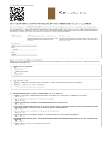 str 1/3 (a14de8d9-6741-4977-bb38-96c19db9926e) T EST ADEKWATNOŚCI I ODPOWIEDNIOŚCI KLIENTA DO ŚWIADCZONEJ USŁUGI MAKLERSKIEJ Celem testu jest uzyskanie przez EFIX DOM MAKLERSKI S.A. podstawowych informacji dotyczących poziomu wiedzy o inwestowaniu w zakresie instrumentów finansowych, doświadczenia inwestycyjnego, sytuacji finansowej oraz celów inwestycyjnych, zgodnie z wymogami określonymi w Rozporządzeniu Ministra Finansów z dnia 24 września 2012 r. w sprawie trybu i warunków postępowania firm inwestycyjnych, banków, o których mowa w art. 70 ust. 2 ustawy o obrocie instrumentami finansowymi, oraz banków powierniczych (Dz.U. 2012, poz. 1078). Wynik testu pozwoli dostosować odpowiednie produkty i usługi do indywidualnej sytuacji Klienta. Wypełnienie przez Klienta testu umożliwi Domowi Maklerskiemu działanie w najlepiej pojętym interesie Klienta. Osoba fizyczna Osoba fizyczna działająca przez pełnomocnika (W przypadku, gdy osoba fizyczna działa przez pełnomocnika, test adekwatności wypełnia osobno osoba fizyczna i osobno pełnomocnik) Osoba prawna (Test adekwatności wypełnia osoba umocowana do reprezentowania osoby prawnej oraz osobno każda osoba fizyczna umocowana do zawierania transakcji w imieniu i na rachunek osoby prawnej) Imię i Nazwisko Test PESEL 123456789 E-mail [email protected] I. OCENA ADEKWATNOŚCI – WIEDZA I DOŚWIADCZENIE (pozwala określić, biorąc pod uwagę wiedzę i doświadczenie, czy instrument finansowy lub usługa maklerska, która ma być świadczona na postawie zawieranej Umowy jest odpowiednia dla Klienta, z uwzględnieniem jego indywidualnej sytuacji) 1. Jakie jest Pana/Pani wykształcenie? wyższe ekonomiczne inne wyższe średnie ekonomiczne inne średnie podstawowe 2. Jaki jest Pana/Pani zawód? pracuję na stanowisku, które wymaga wiedzy o inwestowaniu w zakresie instrumentów finansowych lub usług maklerskich pracuję w przedsiębiorstwie z sektora finansowego inny 3. Proszę zaznaczyć stwierdzenia, z którymi się Pan/Pani zgadza "Tak" lub nie zgadza "Nie". a. Osiągnięte przez fundusze inwestycyjne wyniki są wynikami historycznymi i nie stanowią gwarancji osiągnięcia ich w przyszłości Tak Nie b. Fundusz akcyjny w przeważającej części inwestuje środki w obligacje Tak Nie c. Większych zysków możemy spodziewać się przy funduszach obarczonych wyższym ryzykiem Tak Nie d. Jeżeli indeksy giełdowe danego dnia zamknęły się na minusie, to wycena jednostek uczestnictwa funduszu akcyjnego nie odnotuje spadku, ponieważ ceny jednostek funduszy akcyjnych nie zależą od spadków ani wzrostów indeksów giełdowych. Tak Nie e. Posiadacz obligacji ma prawo do udziału w walnym zgromadzeniu akcjonariuszy Tak Nie f. Transakcje Spread Bet, CFD i Spot Forex obciążone są wysokim stopniem ryzyka i nie są odpowiednie dla każdego. Tak Nie g. Żadna kaucja ani inna wpłacona na rzecz brokera kwota (np. Depozyt Zabezpieczający lub Depozyt Uzupełniający) nie ogranicza ponoszonych przez Klienta strat. Tak Nie h. Wystawca opcji ma obowiązek jej wykonania, a nabywca prawo. Tak Nie str 2/3 (a14de8d9-6741-4977-bb38-96c19db9926e) 4. Proszę wskazać źródło wiedzy w zakresie inwestowania w instrumenty finansowe. własne doświadczenie w inwestowaniu wiedza zdobyta podczas nauki (szkoła, ukończone szkolenia) książki, czasopisma, Internet nie posiadam wiedzy 5. Jakie jest Pana/Pani doświadczenie w inwestowaniu w instrumenty finansowe? (proszę zaznaczyć odpowiednie pola) Instrumenty finansowe Nigdy nie inwestowałe/am Inwestowałem/am korzystając z wyspecjalizowanych podmiotów Inwestowałem/am samodzielnie Obligacje, bony skarbowe Fundusze dłużne i gotówkowe (obligacji, rynku pieniężnego) Fundusze mieszane (zrównoważone, stabilnego wzrostu) Fundusze akcji Akcje Kontrakty terminowe, warranty Opcje, Forex, CFD, SpreadBet 6. Od jak dawna Pan/Pani inwestuje w powyższe instrumenty finansowe? nigdy nie inwestowałem/am krócej niż rok 1 - 5 lat ponad 5 lat 7. Jaką kwotę Pan/Pani zainwestował/a w zaznaczone instrumenty we wskazanym powyżej okresie? 0 zł mniej niż 10 000 zł 10 000 - 100 000 zł powyżej 100 000 zł 8. Jak często dokonywał/a Pan/Pani wskazanych powyżej transakcji w ciągu ostatniego roku? żadnej transakcji 1 - 10 transakcji 11 - 100 transakcji powyżej 100 transakcji 9. Proszę wskazać, na jakich instrumentach finansowych, na jakich rynkach i u jakich brokerów dokonywał Pan / dokonywała Pani transakcji w ciągu ostatnich 2 lat? Broker Rynek Instrumenty finansowe fs sdf II. OCENA ODPOWIEDNIOŚCI - SYTUACJA FINANSOWA I CELE INWESTYCYJNE fds (wypełniają Klienci usługi zarządzania i doradztwa inwestycyjnego) (pozwala określić, biorąc pod uwagę sytuację finansową oraz cele inwestycyjne, odpowiednie instrumenty finansowe lub usługi maklerskie, które mają być świadczone na postawie zawieranej Umowy, z uwzględnieniem indywidualnej sytuacji Klienta) 10. Proszę wskazać główne źródło Pana/Pani dochodów. umowa o pracę samodzielna działalność gospodarcza, wolny zawód, udziały w przedsiębiorstwach spadek, darowizna, wygrana losowa renta lub emerytura 11. Proszę określić stałe zobowiązania finansowe. wyłącznie bieżące koszty finansowe pożyczki, kredyty, alimenty str 3/3 (a14de8d9-6741-4977-bb38-96c19db9926e) 12. Jakie są Pana/Pani stałe miesięczne: dochody netto zobowiązania finansowe 1000 13. 100 Jakie są Pana/Pani aktywa? nie posiadam żadnych aktywów posiadam udziały w spółkach, jestem właścicielem przedsiębiorstwa jestem właścicielem nieruchomości, posiadam udziały w nieruchomości posiadam aktywa płynne (lokaty bankowe, obligacje, jednostki TFI, akcje i inne instrumenty finansowe dopuszczone do obrotu na GPW) 14. Jaka jest wartość posiadanych aktywów netto (nadwyżka wartości aktywów nad zobowiązaniami obciążającymi je), wymienionych powyżej? udziały w spółkach 15. nieruchomości aktywa płynne Jaki poziom straty z zai