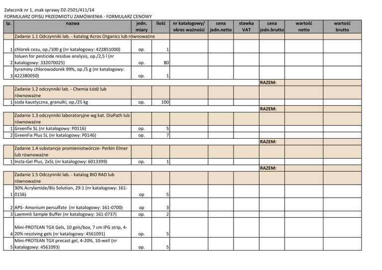 Załacznik nr 1, znak sprawy DZ-2501/411/14 FORMULARZ OPISU PRZEDMIOTU ZAMÓWIENIA - FORMULARZ CENOWY lp. nazwa jedn. ilość miary Zadanie 1.1 Odczynniki lab. - katalog Acros Organics lub równoważne 1 chlorek cezu, op./100 g (nr katalogowy: 422851000) toluen for pesticide residue analysis, op./2,5 l (nr 2 katalogowy: 332070025) tyraminy chlorowodorek 99%, op./5 g (nr katalogowy: 3 422380050) nr katalogowy/ okres ważności op. 1 op. 80 op. 1 cena jedn.netto stawka VAT cena jedn.brutto RAZEM: Zadanie 1.2 odczynniki lab. - Chemia Łódź lub równoważne 1 soda kaustyczna, granulki, op./25 kg op. 100 RAZEM: Zadanie 1.3 odczynniki laboratoryjne wg kat. DiaPath lub równoważne 1 Greenfix 5L (nr katalogowy: P0116) 2 GreenFix Plus 5L (nr katalogowy: P0146) op. op. 5 7 RAZEM: Zadanie 1.4 substancje promieniotwórcze- Perkin Elmer lub równoważne 1 Insta-Gel Plus, 2x5L (nr katalogowy: 6013399) op. 1 RAZEM: Zadanie 1.5 Odczynniki lab. - katalog BIO RAD lub równoważne 30% Acrylamide/Bis Solution, 29:1 (nr katalogowy: 1611 0156) op 5 2 APS- Amonium persulfate (nr katalogowy: 161-0700) 3 Laemmli Sample Buffer (nr katalogowy: 161-0737) op op. 3 2 op. 5 op. 5 Mini-PROTEAN TGX Gels, 10 gels/box, 7 cm IPG strip, 44 20% resolving gels (nr katalogowy: 4561091) Mini-PROTEAN TGX precast gel, 4-20%, 10-well (nr 5 katalogowy: 4561093) wartość netto wartość brutto 6 7 8 9 precision plus protein kaleidoscope standards (nr katalogowy: 1610375) Silver stain plus kit (nr katalogowy: 161-0449) silver stain sds-page standards, low range (nr katalogowy: 1610314) TEMED, op. 5 ml (nr katalogowy: 161-0800) op. op. 5 2 op. op. 1 1 RAZEM: Zadanie 1.6 Odczynniki lab.-katalog PAA lub równoważne Gentamicin solution (10mg/ml), liquid, 100 ml (nr 1 katalogowy: P11-004) szt. 3 RAZEM: 1 2 3 4 5 6 7 8 9 10 11 Zadanie 1.7 Odczynniki lab. - katalog MERCK lub równoważne 102786 Siarczan manganu(II), tetrahydrat, op./1 kg (nr katalogowy: 1027861000) Fiolet krystaliczny, roztwór do barwienia metodą Grama 500ml (nr katalogowy: 1092180500) Hemacolor&#174; do szybkiego barwienia rozmazów, op./3 x 500ml (nr katalogowy: 111661 ) Acetonitryl czystość gradientowa do HPLC, (2,5l) (nr katalogowy: 100030.2500) Bacillus stearothermophilus Sporensuspension, (nr katalogowy: 1.11499.0001) Beta-Glukuronidaza /Arylosulfataza HP, 2ml (nr katalogowy: 104114.0002 ) Celite 545, op./1 kg (nr katalogowy: 1.02693.1000) Charcoal activated for determination of AOX (10g) (nr katalogowy: 1.02005.0010) Chloramfenikol (1.02366)- antybiotyk, dla biologii (100g) (nr katalogowy: CN220551-100GM) Glicerol, op. 1 L, (nr katalogowy: 104092.1000 ) Glicyna,op/1 kg (nr katalogowy: 1042011000) 12 glikol polietylenowy, 1 kg, (nr katalogowy: 818897.1000) 13 Gram-color (nr katalogowy: 1118850001 ) Izooktan do chromatografii gazowej, (2,5l) (nr 14 katalogowy: 115440.2500 ) op. 1 op. 3 op. 3 op. 3 op. 1 op. op. 10 3 op. 3 op op. op 1 3 1 op. op. 10 4 op. 2 kwas azotowy 60% Suprapur - 1 l (nr katalogowy: 1004411000 ) Kwas borowy GR do analizy ACS,ISO,Reag. (500g) (nr katalogowy: 1.00165.500) kwas HCL 5M , 1L (nr katalogowy: 1.09911.0001) Kwas mrówkowy 98-100% (2,5l) (nr katalogowy: 100264.2500) kwas siarkowy 95-97% GR do analizy (1l) (nr katalogowy: 1.00731.1000) Kwas solny 30% - 1l Suprapur (nr katalogowy: 1003181000 ) kwas solny dymiący 37% GR do analizy (1l) (nr katalogowy: 100317.1000) Modyfikator fosforanowy do pieca grafitowego (50 ml) (nr katalogowy: 1.07290.0050) octan etylu, SupraSolv for GC (2,5l) (nr katalogowy: 1.10972.2500) odczynnik schiffa do elektroforezy i mikroskopii (nr katalogowy: 1.09033.0500) Olejek immersyjny do mikroskopii (nr katalogowy: 1.04699.0100) op. 2 op. op. 1 2 op. 2 op. 10 op. 1 op. 15 op. 2 op. 13 op 2 op. 2 26 Płyn Lugola op. 1 litr (nr katalogowy: 10056711000) Safranina, roztwór do metody Grama 500 ml (nr 27 katalogowy: 1092170500 ) sodu siarczan bezwodny, GR do analizy (1kg) (nr 28 katalogowy: 106649.1000) sulfanilamide for analisis,op/100g (nr katalogowy: 29 1.11799.0100) op. 5 op. 4 op. 8 op. 1 30 Titriplex III, op. 100g (nr katalogowy: 108418.0100) wodorotlenek sodu 5M (1L) (nr katalogowy: 31 1.09913.0001) szt. 1 op. 3 15 16 17 18 19 20 21 22 23 24 25 RAZEM: Zadanie 1.8 odczynniki lab. - katalog BioMerieux lub równoważne 1 AirLife 0.45% Sodium Chloride (nr katalogowy: V1204) op. 12 2 Evans Blue (nr katalogowy: 75491) op. 4 Fiolet krystaliczny, op./500 ml (nr katalogowy: 29524) Fluoprep, op. 1 x 15 ml (nr katalogowy: 75521) Fuksyna, op./500 ml (nr katalogowy: 29522) NaCl 0,85% Medium (nr katalogowy: 20070) op. op. op. op. 4 3 5 8 7 NOZZLE CLEANING SOLUTION 5l (nr katalogowy: 29525) op. 1 8 NUCLISENS LYSIS BUFFER (4x1l.) (nr katalogowy: 280134) 9 Płyn Lugola, op. 500 ml (nr katalogowy: 29523) 10 Rapid ID32 STREP (nr katalogowy: 32600) op. op. op. 1 4 16 3 4 5 6 RAZEM: Zadanie 1.9 odczynniki lab. - Perkin Elmer lub równoważne Protran Nitrocellulose Hybridization Transfer Membrane, 0.45 ul , 15 cm x 3 m Roll (nr katalogowy: 1 NBA085A001EA) THYMIDINE, [METHYL-3H] 250 microCi (nr katalogowy: 2 NET027X250UC) op. 1 3 RAZEM: 1 2 3 4 5 Zadanie 1.10 Odczynniki lab.-katalog NOACK lub równoważne Bufor do ekstrakcji sera (nr katalogowy: FLA 005) fast Immunostick Cow, 25 testów w op. (nr katalogowy: 502135 B) fast Immunostick Horse, 25 testów w op. (nr katalogowy: 502136Y) fast Immunostick Pig, 25 testów w op. (nr katalogowy: 502137 W) fast Immunostick Poultry, 25 testów w op. (nr katalogowy: 502139 S) 6 Płyn do dziennej kontroli (nr katalogowy: FLA 280) 7 Płyny kalibracyjne (nr katalogowy: FLA 250) 8 Próbki kontrolne FLA 260 (nr katalogowy: FLA 260) Reagent Fluorophos w zestawie z kuwetami (nr 9 katalogowy: FLA 225) op. 4 op 6 op. 3 op 6 op 6 op. op. op. 4 5 5 op. 4 RAZEM: 1 2 3 4 5 6 7 8 Zadanie 1.11 Odczynniki lab. - katalog LGC Standards lub równoważne Acetone Picograde for residue analysis (nr katalogowy: SO-1142-B025) Ammonium acetate ULC-MS Optigrade (100 g) (nr katalogowy: SO-9685-B001) dichlorometan Picogra