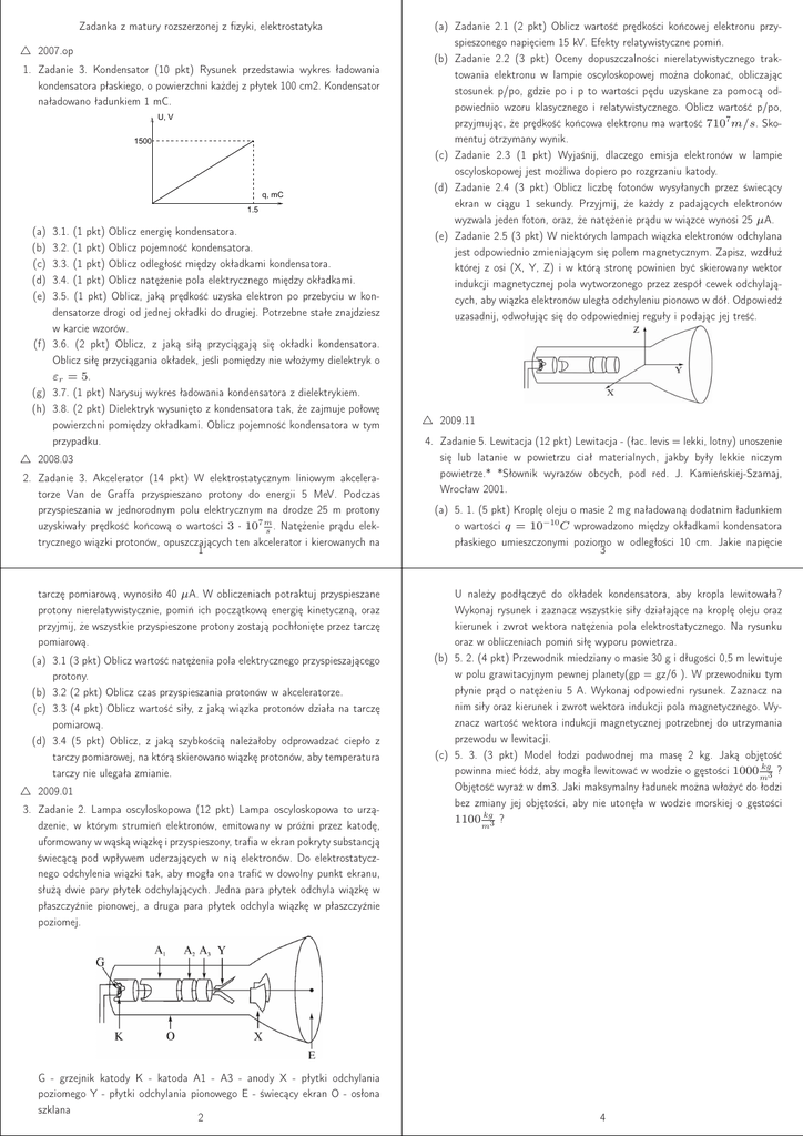 Zadanka z matury rozszerzonej z fizyki, elektrostatyka △ 2007.op 1. Zadanie 3. Kondensator (10 pkt) Rysunek przedstawia wykres ładowania kondensatora płaskiego, o powierzchni każdej z płytek 100 cm2. Kondensator naładowano ładunkiem 1 mC. U, V 1500 q, mC 1.5 (a) (b) (c) (d) (e) 3.1. (1 pkt) Oblicz energię kondensatora. 3.2. (1 pkt) Oblicz pojemność kondensatora. 3.3. (1 pkt) Oblicz odległość między okładkami kondensatora. 3.4. (1 pkt) Oblicz natężenie pola elektrycznego między okładkami. 3.5. (1 pkt) Oblicz, jaką prędkość uzyska elektron po przebyciu w kondensatorze drogi od jednej okładki do drugiej. Potrzebne stałe znajdziesz w karcie wzorów. (f) 3.6. (2 pkt) Oblicz, z jaką siłą przyciągają się okładki kondensatora. Oblicz siłę przyciągania okładek, jeśli pomiędzy nie włożymy dielektryk o εr = 5. (g) 3.7. (1 pkt) Narysuj wykres ładowania kondensatora z dielektrykiem. (h) 3.8. (2 pkt) Dielektryk wysunięto z kondensatora tak, że zajmuje połowę powierzchni pomiędzy okładkami. Oblicz pojemność kondensatora w tym przypadku. △ 2008.03 2. Zadanie 3. Akcelerator (14 pkt) W elektrostatycznym liniowym akceleratorze Van de Graffa przyspieszano protony do energii 5 MeV. Podczas przyspieszania w jednorodnym polu elektrycznym na drodze 25 m protony uzyskiwały prędkość końcową o wartości 3 · 107 m s . Natężenie prądu elektrycznego wiązki protonów, opuszczających ten akcelerator i kierowanych na 1 tarczę pomiarową, wynosiło 40 µA. W obliczeniach potraktuj przyspieszane protony nierelatywistycznie, pomiń ich początkową energię kinetyczną, oraz przyjmij, że wszystkie przyspieszone protony zostają pochłonięte przez tarczę pomiarową. (a) 3.1 (3 pkt) Oblicz wartość natężenia pola elektrycznego przyspieszającego protony. (b) 3.2 (2 pkt) Oblicz czas przyspieszania protonów w akceleratorze. (c) 3.3 (4 pkt) Oblicz wartość siły, z jaką wiązka protonów działa na tarczę pomiarową. (d) 3.4 (5 pkt) Oblicz, z jaką szybkością należałoby odprowadzać ciepło z tarczy pomiarowej, na którą skierowano wiązkę protonów, aby temperatura tarczy nie ulegała zmianie. △ 2009.01 3. Zadanie 2. Lampa oscyloskopowa (12 pkt) Lampa oscyloskopowa to urządzenie, w którym strumień elektronów, emitowany w próżni przez katodę, uformowany w wąską wiązkę i przyspieszony, trafia w ekran pokryty substancją świecącą pod wpływem uderzających w nią elektronów. Do elektrostatycznego odchylenia wiązki tak, aby mogła ona trafić w dowolny punkt ekranu, służą dwie pary płytek odchylających. Jedna para płytek odchyla wiązkę w płaszczyźnie pionowej, a druga para płytek odchyla wiązkę w płaszczyźnie poziomej. G - grzejnik katody K - katoda A1 - A3 - anody X - płytki odchylania poziomego Y - płytki odchylania pionowego E - świecący ekran O - osłona szklana 2 (a) Zadanie 2.1 (2 pkt) Oblicz wartość prędkości końcowej elektronu przyspieszonego napięciem 15 kV. Efekty relatywistyczne pomiń. (b) Zadanie 2.2 (3 pkt) Oceny dopuszczalności nierelatywistycznego traktowania elektronu w lampie oscyloskopowej można dokonać, obliczając stosunek p/po, gdzie po i p to wartości pędu uzyskane za pomocą odpowiednio wzoru klasycznego i relatywistycznego. Oblicz wartość p/po, przyjmując, że prędkość końcowa elektronu ma wartość 7107 m/s. Skomentuj otrzymany wynik. (c) Zadanie 2.3 (1 pkt) Wyjaśnij, dlaczego emisja elektronów w lampie oscyloskopowej jest możliwa dopiero po rozgrzaniu katody. (d) Zadanie 2.4 (3 pkt) Oblicz liczbę fotonów wysyłanych przez świecący ekran w ciągu 1 sekundy. Przyjmij, że każdy z padających elektronów wyzwala jeden foton, oraz, że natężenie prądu w wiązce wynosi 25 µA. (e) Zadanie 2.5 (3 pkt) W niektórych lampach wiązka elektronów odchylana jest odpowiednio zmieniającym się polem magnetycznym. Zapisz, wzdłuż której z osi (X, Y, Z) i w którą stronę powinien być skierowany wektor indukcji magnetycznej pola wytworzonego przez zespół cewek odchylających, aby wiązka elektronów uległa odchyleniu pionowo w dół. Odpowiedź uzasadnij, odwołując się do odpowiedniej reguły i podając jej treść. △ 2009.11 4. Zadanie 5. Lewitacja (12 pkt) Lewitacja - (łac. levis = lekki, lotny) unoszenie się lub latanie w powietrzu ciał materialnych, jakby były lekkie niczym powietrze.* *Słownik wyrazów obcych, pod red. J. Kamieńskiej-Szamaj, Wrocław 2001. (a) 5. 1. (5 pkt) Kroplę oleju o masie 2 mg naładowaną dodatnim ładunkiem o wartości q = 10−10 C wprowadzono między okładkami kondensatora płaskiego umieszczonymi poziomo w odległości 10 cm. Jakie napięcie 3 U należy podłączyć do okładek kondensatora, aby kropla lewitowała? Wykonaj rysunek i zaznacz wszystkie siły działające na kroplę oleju oraz kierunek i zwrot wektora natężenia pola elektrostatycznego. Na rysunku oraz w obliczeniach pomiń siłę wyporu powietrza. (b) 5. 2. (4 pkt) Przewodnik miedziany o masie 30 g i długości 0,5 m lewituje w polu grawitacyjnym pewnej planety(gp = gz/6 ). W przewodniku tym płynie prąd o natężeniu 5 A. Wykonaj odpowiedni rysunek. Zaznacz na nim siły oraz kierunek i zwrot wektora indukcji pola magnetycznego. Wyznacz wartość wektora indukcji magnetycznej potrzebnej do utrzymania przewodu w lewitacji. (c) 5. 3. (3 pkt) Model łodzi podwodnej ma masę 2 kg. Jaką objętość kg powinna mieć łódź, aby mogła lewitować w wodzie o gęstości 1000 m 3 ? Objętość wyraź w dm3. Jaki maksymalny ładunek można włożyć do łodzi bez zmiany jej objętości, aby nie utonęła w wodzie morskiej o gęstości kg 1100 m 3 ? 4