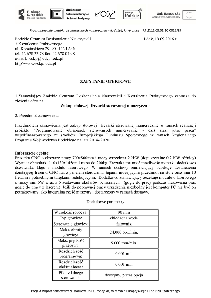 Programowanie obrabiarek sterowanych numerycznie – dziś staż, jutro praca RPLD.11.03.01-10-0019/15 Łódzkie Centrum Doskonalenia Nauczycieli i Kształcenia Praktycznego ul. Kopcińskiego 29, 90 -142 Łódź tel. 42 678 33 78 fax. 42 678 07 98 e-mail: [email protected] http//www.wckp.lodz.pl Łódź, 19.09.2016 r ZAPYTANIE OFERTOWE 1.Zamawiający Łódzkie Centrum Doskonalenia Nauczycieli i Kształcenia Praktycznego zaprasza do złożenia ofert na: Zakup stołowej frezarki sterowanej numerycznie 2. Przedmiot zamówienia. Przedmiotem zamówienia jest zakup stołowej frezarki sterowanej numerycznie w ramach realizacji projektu "Programowanie obrabiarek sterowanych numerycznie - dziś staż, jutro praca” współfinansowanego ze środków Europejskiego Funduszu Społecznego w ramach Regionalnego Programu Województwa Łódzkiego na lata 2014- 2020. Informacje ogólne: Frezarka CNC o obszarze pracy 700x800mm i mocy wrzeciona 2.2kW (dopuszczalne 0.2 KW różnicy) Wymiar obrabiarki 110x130x145cm i masa do 200kg. Frezarka ma mieć możliwość montażu dodatkowo dozownika kleju i modułu laserowego. W ramach dostawy zamawiający oczekuje dostarczenia działającej frezarki CNC raz z panelem sterowania, łapami mocującymi przedmiot na stole oraz min 10 frezami i potrzebnymi tulejkami redukującymi. Dodatkowo zamawiający oczekuje modułów laserowego o mocy min 5W wraz z 5 zestawami okularów ochronnych. (gogle do pracy podczas frezowania oraz gogle do pracy z laserem). Jeśli do poprawnej pracy urządzenia niezbędny jest komputer PC ma być on potraktowany jako integralna cześć maszyny i dostarczony w ramach dostawy. Dodatkowe parametry Wysokość robocza: Typ głowicy: Sterowanie głowicy: Maks. obroty głowicy: Maks. prędkość przesuwu: Rozdzielczość programowa: Rozdzielczość elektroniczna: Pilot zdalnego sterowania: 90 mm chłodzona wodą falownik 24.000 obr./min. 5.000 mm/min. 0.001 mm 0.001 mm dostępny, płatna opcja Projekt współfinansowany ze środków Unii Europejskiej w ramach Europejskiego Funduszu Społecznego Programowanie obrabiarek sterowanych numerycznie – dziś staż, jutro praca RPLD.11.03.01-10-0019/15 System chłodzenia: dostępny, płatna opcja Konstrukcja odlew stalowy maszyny: Dostęp: pełny dostęp ze wszystkich stron Zasilanie: 230V, 50Hz Warunki pracy: temperatura: 0-40*C, wilgotność: 90% Maks. zużycie do 4 kW energii: Wymagania dot. PC: Windows XP, lub nowszy Potrzebne do starowania maszyną Oprogramowanie: zgodnie z zalecaniami producenta oraz z postprocesorem systemu MTS Obsługiwane typy plt, dxf, G-Codes, RAW 3D, bmp plików: Gwarancja: 12 miesięcy w siedzibie klienta 3. Termin realizacji zamówienia: wrzesień/październik 2016 r. 4. Warunki gwarancji: 12 miesięcy od daty zamontowania w ŁCDNiKP 5. Miejsce i termin złożenia oferty: Łódzkie Centrum Doskonalenia Praktycznego, Łódź, Kopcińskiego 29, piętro II, pokój 209 Oferty należy złożyć do 26 września 2016 r. do godz. 10.00. Nauczycieli i Kształcenia 6. Termin otwarcia ofert: 26 września 2016 r, godz. 12.00 7. Warunki płatności Płatność dokonana będzie po wystawieniu rachunku przez wykonawcę pod warunkiem posiadania przez Zamawiającego na rachunku bankowym projektu środków pochodzących z Europejskiego Funduszu Społecznego na realizację projektu. 8. Osoba upoważniona do kontaktu z wykonawcami Grażyna Mrówczyńska tel. 509-102-740 [email protected] 9. Sposób przygotowania oferty: Ofertę należy przygotować w języku polskim na formularzu zapytania ofertowego. Wypełnioną i własnoręcznie podpisaną ofertę należy dostarczyć osobiście lub listownie w odpowiednim terminie. Wiążąca jest data wpływu do Zamawiającego. 10. Warunki udziału w postępowaniu oraz opis sposobu dokonywania oceny spełniania tych warunków. cena 100 % 11. Wykaz oświadczeń lub dokumentów, jakie mają dostarczyć wykonawcy w celu potwierdzenia spełniania warunków udziału w postępowaniu: Nie dotyczy 12. Informacje o sposobie porozumiewania się zamawiającego z oferentami oraz przekazywania oświadczeń lub dokumentów, a także wskazanie osób uprawnionych do porozumiewania się z wykonawcami; Projekt współfinansowany ze środków Unii Europejskiej w ramach Europejskiego Funduszu Społecznego Programowanie obrabiarek sterowanych numerycznie – dziś staż, jutro praca RPLD.11.03.01-10-0019/15 Wykonawcy mogą się porozumiewać mailowo lub telefonicznie z osobą wskazaną do kontaktu. O złożenie wymaganych dokumentów poświadczających doświadczenie zostanie poproszony mailowo tylko wykonawca, który przedstawi ofertę najkorzystniejszą. 13. Termin związania ofertą; 30 dni od otwarcia ofert 14. Opis sposobu obliczenia ceny; Ceną oferty jest wartość brutto za jedną sztukę. 15. Opis kryteriów, którymi zamawiający będzie się kierował przy wyborze oferty, wraz z podaniem znaczenia tych kryteriów i sposobu oceny ofert 16. Informacje o formalnościach, jakie powinny zostać dopełnione po wyborze oferty w celu zawarcia umowy. Wykonawca zostanie mailowo poinformowany, iż jego oferta jest najkorzystniejsza i zostanie poproszony o dostarczenie kserokopii lub skanów wymaganych dokumentów. Następnie po ich weryfikacji zostanie z nim podpisana umowa. 17. Wymagania dotyczące zabezpieczenia należytego wykonania umowy, jeżeli Zamawiający żąda wniesienia zabezpieczenia, Nie dotyczy 18. Istotne dla stron postanowienia, które zostaną wprowadzone do treści zawieranej umowy, ogólne warunki umowy albo wzór umowy, jeżeli zamawiający wymaga od wykonawcy, aby zawarł z nim umowę na takich warunkach; Wynagrodzenie wykonawcy będzie współfinansowane przez Unię Europejską z Europejskiego Funduszu Społecznego. Przewiduje się unieważnienie postępowania o udzielenie zamówienia, w przypadku nieprzyznania środków pochodzących z budżetu Unii Europejskiej, które miały być przeznaczone na sfinansowanie całości lub części zamówienia. Umowa z wy