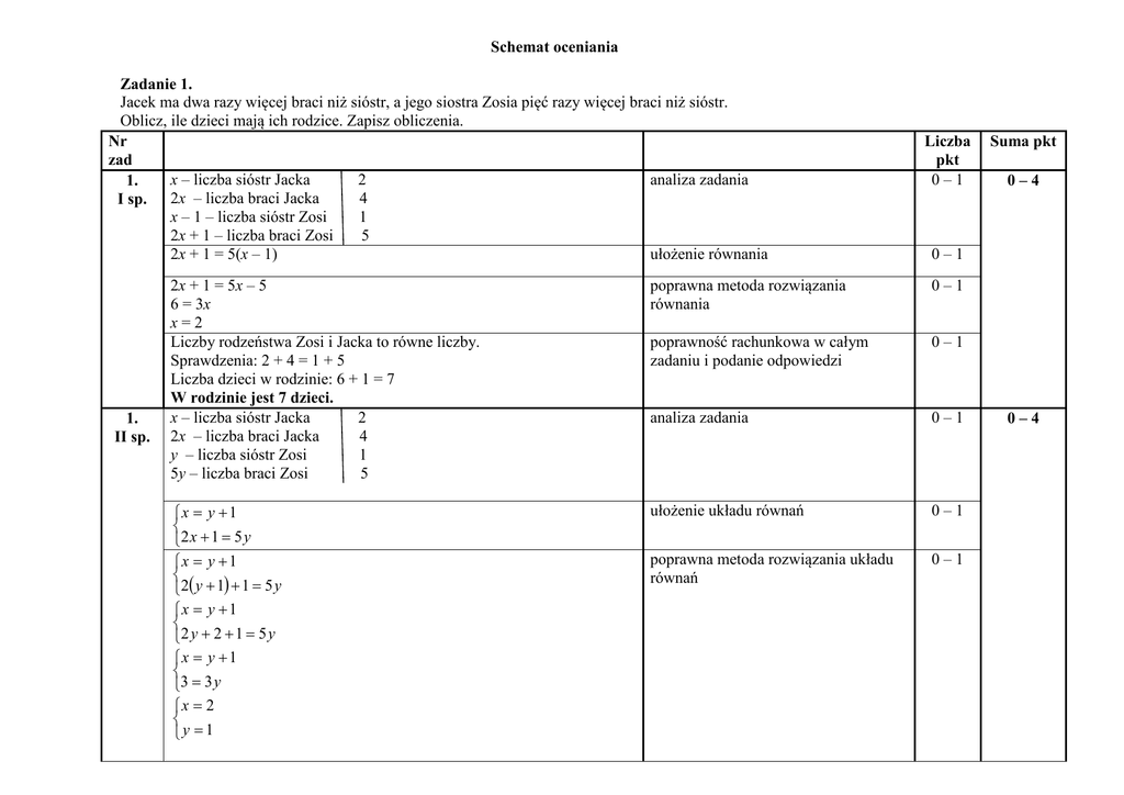 Schemat oceniania Zadanie 1. Jacek ma dwa razy więcej braci niż sióstr, a jego siostra Zosia pięć razy więcej braci niż sióstr. Oblicz, ile dzieci mają ich rodzice. Zapisz obliczenia. Nr zad x – liczba sióstr Jacka 2 analiza zadania 1. 4 I sp. 2x – liczba braci Jacka x – 1 – liczba sióstr Zosi 1 2x + 1 – liczba braci Zosi 5 2x + 1 = 5(x – 1) ułożenie równania 1. II sp. 2x + 1 = 5x – 5 6 = 3x x=2 Liczby rodzeństwa Zosi i Jacka to równe liczby. Sprawdzenia: 2 + 4 = 1 + 5 Liczba dzieci w rodzinie: 6 + 1 = 7 W rodzinie jest 7 dzieci. x – liczba sióstr Jacka 2 2x – liczba braci Jacka 4 y – liczba sióstr Zosi 1 5y – liczba braci Zosi 5 x = y + 1 2 x + 1 = 5 y x = y + 1 2( y + 1) + 1 = 5 y x = y + 1 2 y + 2 + 1 = 5 y x = y + 1 3 = 3 y x = 2 y = 1 Liczba pkt 0–1 Suma pkt 0–4 0–1 poprawna metoda rozwiązania równania 0–1 poprawność rachunkowa w całym zadaniu i podanie odpowiedzi 0–1 analiza zadania 0–1 ułożenie układu równań 0–1 poprawna metoda rozwiązania układu równań 0–1 0–4 Liczby rodzeństwa Zosi i Jacka to równe liczby. Sprawdzenia: 2 + 4 = 1 + 5 Liczba dzieci w rodzinie: 6 + 1 = 7 W rodzinie jest 7 dzieci. 1. poprawność rachunkowa w całym zadaniu i podanie odpowiedzi 0–1 Rozwiązanie graficzne połączone z metodą prób i błędów 0-4 III sp. Każdy z odcinków przedstawia liczbę rodzeństwa Jacka i Zosi (te liczby są równe, czyli odcinki muszą być tej samej długości) Jacek ma 2 razy więcej braci, niż sióstr, czyli odcinek dzielimy na trzy równe części – jeden z nich oznacza liczbę sióstr, dwa kolejne liczbę braci Jacka. Zosia ma 5 razy więcej braci niż sióstr, czyli dzielimy odcinek na 6 równych części. Jeden z odcinków oznacza liczbę sióstr, a kolejne pięć liczbę braci Zosi. Jacek Zosia Liczba rodzeństwa Jacka musi być liczbą podzielną przez 3, liczba rodzeństwa Zosi podzielną przez 6, czyli liczba rodzeństwa jest liczbą podzielną przez 6. Sprawdzenie: Z treści zadania wynika, że liczba braci Jacka musi być liczbą podzielną przez 4, ponieważ stanowi ona Liczba podzielna przez 6, to 6n, gdzie n jest liczbą naturalną dodatnią, stąd 2 liczby podzielnej przez 6. 3 2 ⋅ 6n = 4n . Liczba chłopców musi być również liczbą 3 podzielną przez 5 (liczba braci Zosi jest 5 razy większa od liczby jej sióstr). Chłopców w rodzinie jest o 1 więcej niż liczba braci Jacka. Jedyną liczbą podzielną przez 5 większą o 1 od liczby braci Jacka (czyli liczby podzielnej przez 4) jest 5. Stąd, jedynym rozwiązaniem zadania jest 6 + 1 = 7 dzieci. W rodzinie jest 7 dzieci. • • • • Schemat oceniania rozwiązania zadań otwartych zaprezentowanie pełnego toku rozumowania dla wybranej metody i podanie odpowiedzi – 4 pkt. zasadnicze trudności zadania zostały pokonane, ale rozwiązanie zadania nie zostało dokończone, błędy rachunkowe- 3 pkt. dokonano istotnego postępu, ale zasadnicze trudności zadania nie zostały pokonane - 1 pkt. rozwiązanie błędne lub brak rozwiązania – 0 pkt. Zadanie 2. . Nr zad 2. Rozwiązanie Przyjmijmy oznaczenia: ∠BAC = α ∠ABC = β ∠AFD = γ Mamy wykazać równość: α = β − 2γ Kąt przy wierzchołku C w trójkącie ABC ma miarę 180°– α – β. α β + 2 2 α 180°– α – β α β + 2 2 β γ Trójkąt DEC jest równoramienny ( CD = CE ) . Z sumy miar kątów wewnętrznych trójkąta wynika, że kąty przy wierzchołkach D i C trójkąta DEC mają miary: 180° − (180° − α − β) α β = + . 2 2 2 wykorzystanie twierdzenia o sumie miar kątów wewnętrznych trójkąta do wyznaczenia kąta przy wierzchołku C oraz własności trójkątów równoramiennych do wyznaczenia miar kątów przy wierzchołkach D i E w trójkącie DEC Liczba pkt. Suma pkt. 0–1 0–4 α β + 2 2 180°– α – β α β + 2 2 ** 180° − α − β 2 wykorzystanie własności kątów wierzchołkowych i kątów przyległych 0–1 α β + 2 2 2 α β γ *180°– β Kąty DEC i BEF to kąty wierzchołkowe, czyli mają równe miary: *Kąty ABC i EBF to kąty przyległe, stąd ∠EBF = 180° − β . lub α β **Kąty ADF i EDC to kąty przyległe, stąd ∠ADF = 180° − − 2 2 *Z sumy miar kątów wewnętrznych trójkąta BFE wynika: α β + + 180° − β + γ = 180° 2 2 lub ** Z sumy miar kątów wewnętrznych trójkąta AFD wynika: α β α + γ + 180° − − = 180° 2 2 α β − + γ = 0° 2 2 α β = −γ 2 2 α = β − 2γ α β + 2 2 ułożenie równania opisującego sumę miar kątów wewnętrznych trójkąta BFE (*) lub trójkąta AFD (**) poprawne przekształcenie równania 0– 1 0–1 Zadanie 3. Oblicz stosunek objętości ostrosłupa ABDE do pozostałej części sześcianu. Zapisz obliczenia. Nr zad 3. Rozwiązanie Podstawą ostrosłupa ABDE jest trójkąt prostokątny o przyprostokątnych długości a. Wysokość ostrosłupa jest równa a. 1 1 1 V1 = ⋅ ⋅ a ⋅ a ⋅ a = a 3 3 2 6 metoda obliczenia objętości ostrosłupa ABDE Liczba pkt. 0–1 a a a Vsz = a 3 1 5 V2 = a 3 − a 3 = a 3 6 6 1 3 a V1 6 1 = = V2 5 3 5 a 6 1 Stosunek objętości ostrosłupa ABDE do pozostałej części sześcianu jest równy . 5 metoda obliczenia objętości pozostałej części sześcianu 0–1 obliczenie stosunku objętości odpowiednich brył 0–1 poprawność rachunkowa w całym zadaniu i podanie odpowiedzi 0–1 Suma pkt. 0–4
