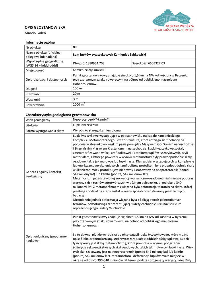OPIS GEOSTANOWISKA Marcin Goleń Informacje ogólne Nr obiektu Nazwa obiektu (oficjalna, obiegowa lub nadana) Współrzędne geograficzne [WGS 84 – hddd.dddd] Miejscowość 80 Łom łupków Łyszczykowych Kamieniec Ząbkowicki Długość: 1880954.703 Szerokość: 6505327.03 Kamieniec Ząbkowicki Długość Punkt geostanowiskowy znajduje się około 1,5 km na NW od kościoła w Byczeniu przy czerwonym szlaku rowerowym na północ od pobliskiego mauzoleum Hohenzollernów. 100 m Szerokość 20 m Wysokość 3m Powierzchnia 2000 m Opis lokalizacji i dostępności: 2 Charakterystyka geologiczna geostanowiska Wiek geologiczny Neoproterozoik?-kambr? Litologia Łupki łyszczykowe Forma występowania skały Wyrobisko starego kamieniołomu Geneza i ogólny kontekst geologiczny Łupki łyszczykowe występujące w geostanowisku należą do Kamienieckiego Kompleksu Metamorficznego. Jest to struktura, która rozciąga się z północy na południe w stosunkowo wąskim pasie pomiędzy Masywem Gór Sowich na wschodzie i Strzelińskim Masywem Krystalicznym na zachodzie. Łupki łyszczykowe zostały zmetamorfizowane w facji amfibolitowej. Protolitem łupków łyszczykowych, czyli materiałem, z którego powstały w wyniku metamorfozy były prawdopodobnie skały osadowe, takie jak mułowce lub łupki ilaste. Dla rzadziej występujących w kompleksie łupków kwarcowo-skaleniowych i amfibolitów protolitem były prawdopodobnie skały wulkaniczne. Wiek protolitu jest niepewny i szacowany na neoproterozoik (ponad 542 miliony lat) lub kambr (poniżej 542 milionów lat). Metamorfizm przedstawionej sekwencji wulkaniczno-osadowej miał miejsce podczas waryscyjskich ruchów górotwórczych w późnym paleozoiku, przed około 340 milionami lat. Z metamorfizmem związana była deformacja tektoniczna skały, której przebieg i podział na etapy został w różny sposób przedstawiony przez licznych badaczy. Niezmiennie jednak deformacja wiązana była z kolizją dwóch paleozoicznych terranów- Saksoturyngii reprezentującej Sudety Zachodnie i Brunovistulicum reprezentującego Sudety Wschodnie. Punkt geostanowiskowy znajduje się około 1,5 km na NW od kościoła w Byczeniu, przy czerwonym szlaku rowerowym, na północ od pobliskiego mauzoleum Hohenzollernów. Opis geologiczny (popularnonaukowy) Są to dawne, płytkie wyrobiska po eksploatacji łupka łyszczykowego, który można opisać jako drobnoziarnistą, srebrzystoszarą skałę z oddzielnością łupkową. Łupek łyszczykowy jest skałą metamorficzną, która powstała w wyniku podgrzania i ściśnięcia sekwencji starszych skał osadowych, takich jak mułowce i łupki ilaste. Wiek tych skał szacowany jest na neoproterozoik (ponad 542 miliony lat) lub kambr (poniżej 542 milionów lat). Metamorfoza i deformacja łupków miała miejsce w okresie od około 390-340 milionów lat temu, podczas orogenezy waryscyjskiej. Były 1 to ruchy górotwórcze, które doprowadziły do powstania na terenie środkowej i zachodniej Europy potężnego pasma górskiego Waryscydów. Warunki metamorfizmu, jakie zarejestrowane zostały przez drobnoziarniste łupki łyszczykowe to górna facja amfibolitowa- temperatura około 510-540 ⁰C, przy ciśnieniu 7-8,5 kbar. Występujące tutaj łupki łyszczykowe zbudowane są w przeważającej mierze z kwarcu oraz dwóch odmian łyszczyków- jasnego muskowitu i ciemnego biotytu. Łyszczyki rozpoznajemy po silnym połysku, niewielkiej twardości (możliwość zarysowania paznokciem) oraz łatwej oddzielności poszczególnych blaszek. Kwarc jest niełupliwym minerałem o bardzo dużej twardości (rysuje szkło), szklistym połysku i zwykle szarej barwie. Ponadto w łupkach występuje szereg rzadszych minerałów, z których wymienić należy granat, ciemnoczerwony, izometryczny minerał o rozmiarach do około 0,5 cm, oraz plagioklaz- biały nieprzezroczysty minerał o tabliczkowym pokroju, osiągający rozmiary do około 2 mm. Pozostałe minerały są trudne lub niemożliwe do identyfikacji gołym okiem ze względu na ich niewielkie rozmiary. Łupek łyszczykowy wykazuje charakterystyczną oddzielność łupkową, która jest zdolnością skały do dzielenia się na "płaty". Tę cechę łupek zawdzięcza równoległemu ułożeniu minerałów o pokroju blaszkowym, głównie łyszczyków, w naprzemianlegle występujących w łupku warstewkach łyszczykowych i łyszczykowo-kwarcowych. W trakcie deformacji tektonicznej w wyniku działania na skałę ukierunkowanej siły minerały blaszkowe i słupkowe przyjmują jednolite, optymalne do kierunku działania siły ułożenie. Takie planarne uporządkowanie budowy wewnętrznej skały powstałe w wyniku jej deformacji nazywamy foliacją (z łac. folium ‘liść’). W skale może występować więcej niż jedna foliacja, jeżeli przeszła ona przez więcej niż jeden etap deformacji tektonicznej. Foliację oznacza się symbolem S i nadaje jej numer w zależności od etapu deformacji, w którym powstała. Na przykład foliacja S1 związana jest z pierwszym etapem deformacji. Oddzielność łupkowa jest dobrze zachowaną w skale generacją foliacji. Skały w Kamienieckim Kompleksie Metamorficznym zarejestrowały trzyetapową deformację tektoniczną. Pierwszy etap deformacji polegał na nasuwaniu się ku wschodowi w formie płaszczowin trzech jednostek skalnych budujących Kamieniecki Kompleks Metamorficzny- idąc od najniżej położonej- jednostki Byczenia, Kamieńca i Chałupek. Doprowadziło to do utworzenia stosu płaszczowin, w którego środku, w jednostce Kamieńca, znajdujemy się obecnie. Pamiątką po tym etapie deformacji jest pierwotnie połoga foliacja S1, która w tym stanowisku została zatarta przez kolejne etapy deformacji i możliwe jest jej rozpoznanie jedynie na podstawie mikrostruktur widocznych pod mikroskopem. W drugim etapie deformacji dalsze działanie siły w kierunku wschodnim i skracanie całego kompleksu na kierunku wschód- zachód, doprowadziło do zafałdowania sto