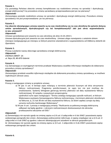 Pytanie 1. Czy posiadają Państwo obecnie umowy kompleksowe czy rozdzielone umowy na sprzedaż i dystrybucją energii elektrycznej? Czy procedura zmiany sprzedawcy przeprowadzana jest po raz pierwszy? Odpowiedź: Zamawiający posiada rozdzielone umowy na sprzedaż i dystrybucję energii elektrycznej. Procedura zmiany sprzedawcy nie jest przeprowadzana po raz pierwszy. Pytanie 2. Czy obecnie obowiązujące umowy zawarte są na czas nieokreślony czy na czas określony (to pytanie dotyczy umów sprzedażowych, dystrybucyjnych czy też kompleksowych)? Jaki jest okres wypowiedzenia w ww. umowach? Odpowiedź: Umowa sprzedażowa jest zawarta na czas określony do dnia 31.01.2014 r. Umowa dystrybucyjna jest zawarta na czas nieokreślony. Umowa ulega rozwiązaniu z ostatnim dniem miesiąca następującego po miesiącu w którym pisemne oświadczenie o wypowiedzeniu od Odbiorcy dotarło do Operatora. Pytanie 3. Proszą o podanie nazwy obecnego sprzedawcy energii elektrycznej. Odpowiedź: ENERGA-OBRÓT SA ul. Reja 29, 80-870 Gdańsk Pytanie 4. Czy Zamawiający w wymaganym terminie przekaże Wykonawcy wszelkie informacje niezbędne do dokonania procedury zmiany sprzedawcy? Odpowiedź: Zamawiający przekaże wszelkie informacje niezbędne do dokonania procedury zmiany sprzedawcy, w możliwie najkrótszym okresie czasu. Pytanie 5. Proszą o następujące zmiany w projekcie umowy a) W par. 6 ust. 6 Istnieje zapis mówiący o terminie płatności liczonym od dnia otrzymania faktury rozliczeniowej. Pragniemy poinformować, że zapis ten nie jest możliwy do zrealizowania. Systemy bilingowe generują terminy płatności od daty wystawienia faktury rozliczeniowej. W związku z powyższym proponujemy ujednolicić w/w zapis następująco: "Strony ustalają następujący sposób rozliczeń, w którym Wykonawca wystawia Zamawiającemu fakturę rozliczeniową, z terminem płatności określonym na fakturze, tj. 21 lub 30 dni od daty wystawienia faktury. Za dzień zapłaty uznaje się datą uznania rachunku bankowego Wykonawcy" b) W par. 6 ust. 1 proszę o następującą zmianę: "Rozliczenia za pobraną energię elektryczną odbywać się będą zgodnie z okresem rozliczeniowym dostosowanym do okresów przekazywania odczytów od OSD." Odpowiedź: a) Zamawiający nie wyraża zgody na zmianę zapisu w § 6 ust. 6 załącznika nr 6 do SIWZ i pozostawia zapisy wskazanego paragrafu bez zmian. Zamawiający jednocześnie informuje, iż zapisy znajdujące się w § 6 ust. 6 załącznika nr 6 do SIWZ są zgodne z obecnie obowiązującymi zasadami w obrocie gospodarczym. b) Zamawiający nie wyraża zgody na zmianę zapisu w § 6 ust. 1 załącznika nr 6 do SIWZ i pozostawia zapisy wskazanego paragrafu bez zmian. Pytanie 6. Czy dla obiektów objętych postępowaniem procedura zmiany sprzedawcy energii elektrycznej przeprowadzana będzie po raz pierwszy?, czy jest to kolejna zmiana. Odpowiedź: Dla obiektów objętych postępowaniem procedura zmiany sprzedawcy energii elektrycznej nie jest przeprowadzana po raz pierwszy, jest to kolejna zmiana. Pytanie 7. Jaki jest okres rozliczeniowy dla poszczególnych punktów poboru energii? Odpowiedź: Z wyjątkiem oczyszczalni ścieków w Czemiernikach (1 miesiąc) okres rozliczeniowy dla punktów poboru energii wynosi 2 miesiące.