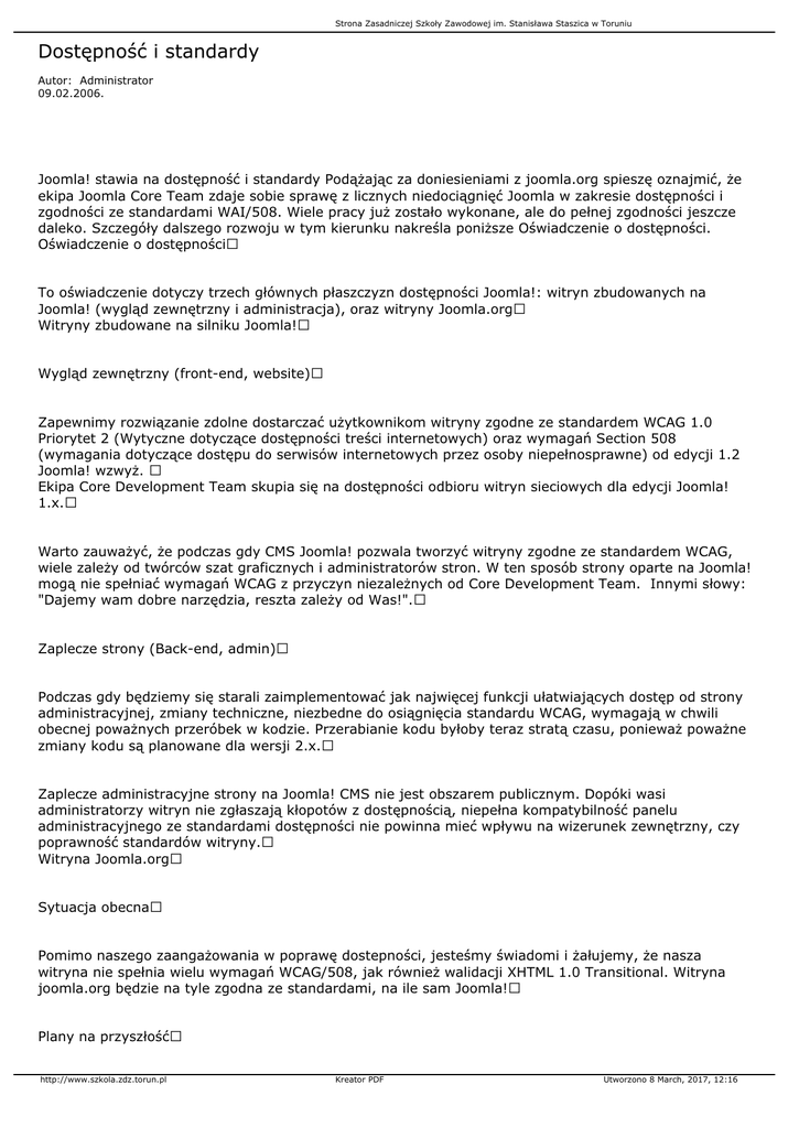 Strona Zasadniczej Szkoły Zawodowej im. Stanisława Staszica w Toruniu Dostępność i standardy Autor: Administrator 09.02.2006. Joomla! stawia na dostępność i standardy Podążając za doniesieniami z joomla.org spieszę oznajmić, że ekipa Joomla Core Team zdaje sobie sprawę z licznych niedociągnięć Joomla w zakresie dostępności i zgodności ze standardami WAI/508. Wiele pracy już zostało wykonane, ale do pełnej zgodności jeszcze daleko. Szczegóły dalszego rozwoju w tym kierunku nakreśla poniższe Oświadczenie o dostępności. Oświadczenie o dostępności To oświadczenie dotyczy trzech głównych płaszczyzn dostępności Joomla!: witryn zbudowanych na Joomla! (wygląd zewnętrzny i administracja), oraz witryny Joomla.org Witryny zbudowane na silniku Joomla! Wygląd zewnętrzny (front-end, website) Zapewnimy rozwiązanie zdolne dostarczać użytkownikom witryny zgodne ze standardem WCAG 1.0 Priorytet 2 (Wytyczne dotyczące dostępności treści internetowych) oraz wymagań Section 508 (wymagania dotyczące dostępu do serwisów internetowych przez osoby niepełnosprawne) od edycji 1.2 Joomla! wzwyż. Ekipa Core Development Team skupia się na dostępności odbioru witryn sieciowych dla edycji Joomla! 1.x. Warto zauważyć, że podczas gdy CMS Joomla! pozwala tworzyć witryny zgodne ze standardem WCAG, wiele zależy od twórców szat graficznych i administratorów stron. W ten sposób strony oparte na Joomla! mogą nie spełniać wymagań WCAG z przyczyn niezależnych od Core Development Team. Innymi słowy: "Dajemy wam dobre narzędzia, reszta zależy od Was!". Zaplecze strony (Back-end, admin) Podczas gdy będziemy się starali zaimplementować jak najwięcej funkcji ułatwiających dostęp od strony administracyjnej, zmiany techniczne, niezbedne do osiągnięcia standardu WCAG, wymagają w chwili obecnej poważnych przeróbek w kodzie. Przerabianie kodu byłoby teraz stratą czasu, ponieważ poważne zmiany kodu są planowane dla wersji 2.x. Zaplecze administracyjne strony na Joomla! CMS nie jest obszarem publicznym. Dopóki wasi administratorzy witryn nie zgłaszają kłopotów z dostępnością, niepełna kompatybilność panelu administracyjnego ze standardami dostępności nie powinna mieć wpływu na wizerunek zewnętrzny, czy poprawność standardów witryny. Witryna Joomla.org Sytuacja obecna Pomimo naszego zaangażowania w poprawę dostepności, jesteśmy świadomi i żałujemy, że nasza witryna nie spełnia wielu wymagań WCAG/508, jak również walidacji XHTML 1.0 Transitional. Witryna joomla.org będzie na tyle zgodna ze standardami, na ile sam Joomla! Plany na przyszłość http://www.szkola.zdz.torun.pl Kreator PDF Utworzono 8 March, 2017, 12:16 Strona Zasadniczej Szkoły Zawodowej im. Stanisława Staszica w Toruniu Jesteśmy ukierunkowani na osiąganie bieżących standardów internetowych (XHTML, CSS, WCAG/508) i trzymanie sie reguł dobrego rzemiosła. Nasze cele osiągniemy w momencie, gdy silnik Joomla! spełni wymienione już wymagania. Istniejąca zawartość, stworzona przed implementacją Joomla! 1.2 może nie być poprawnie oznaczona. W miarę wolnego czasu zawartość będzie przeglądana i poprawiana. Nowo dodawane treści będą już poprawnie oznaczane. Aplikacje zewnętrzne W wielu sytuacjach Joomla! wymaga wykorzystania aplikacji zewnętrznych do poprawnego funkcjownowania witryny. Udogodnienia takie jak: Forum, czy Warsztat (mowa tu o serwisach forum.joomla.org i developer.joomla.org) nie zostały stworzone przez Joomla! Development Team. Będziemy starali się poprawić dostepność tych serwisów, jednak zgodność ze standardami w tym wypadku nie leży w naszych rękach. Uwagi i sugestie? Jeżeli macie jakieś sugestie, zażalenia lub pomysły, nie krępujcie się podzielić nimi z naszym działem Użyteczności i Dostępności na Joomla! Forum Oświadczenie to jest fragmentem Podręcznika Programisty Joomla, należącego do oficjalnej dokumentacji Joomla, dostępnej na stronie joomla.org i podlega wszystkim obwarowaniom prawnym dotyczącym całej dokumentacji. Tłumaczenie: Łukasz Rylik akarybik http://www.szkola.zdz.torun.pl Kreator PDF Utworzono 8 March, 2017, 12:16