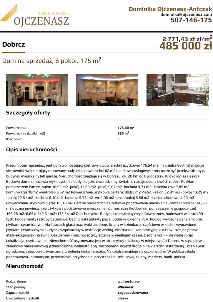 Dominika Ojczenasz-Antczak [email protected] 507-146-175 2 771,43 zł zł/m2 485 000 zł Dobrcz Dom na sprzedaż, 6 pokoi, 175 m2 Szczegóły oferty Powierzchnia 175,00 m2 Powierzchnia działki [m2] 680 m2 Ilość pokoi 6 Opis nieruchomości Przedmiotem sprzedaży jest dom wolnostojący piętrowy o powierzchni użytkowej 175,54 m2, na działce 680 m2 znajduje się również wolnostojący murowany budynek o powierzchni 62 m2 handlowo-usługowy, który może być przekształcony na budynek mieszkalny lub garaże. Nieruchomość znajduje się w Dobrczu, ok. 20 km od Bydgoszczy. W okolicy las i jeziora. Budowa domu umożliwia wykorzystanie budynku jako dwurodzinny, świetnie nadaje się dla dwóch rodzin. Rozkład pomieszczeń: Parter: -salon 18,95 m2 -pokój 13,69 m2 -pokój 9,07 m2 -kuchnia 9,71 m2 -łazienka z wc 7,89 m2 komunikacja 18m2 -wiatrołap 3,52 m2 Powierzchnia użytkowa parteru: 80,83 m2 Piętro: -salon 32,91 m2 -pokój 13,25 m2 -pokój 12,81 m2 -kuchnia 8,10 m2 -łazienka 5,75 m2 -wc 1,06 m2 -przedpokój 6,58 m2 -klatka schodowa 4,99 m2 Powierzchnia użytkowa piętra: 85,45 m2 Łączna powierzchnia użytkowa podstawowa mieszkalna (parter i piętro) 166,28 m2 Łączna powierzchnia użytkowa podstawowa mieszkalna i pomocnicza (kotłownia i pomieszczenie gospodarcze) 166,28 m2+6,65 m2+2,61 m2=175,54 m2 Opis budynku: Budynek mieszkalny niepodpiwniczony, budowany w latach 90tych. Fundamenty i stropy betonowe. Dach płaski pokryty papą. Stolarka okienna PCV. Podłogi wyłożone panelami oraz płytkami ceramicznymi. Na ścianach gładź oraz tynki ozdobne. Ściany w łazienkach i częściowo w kuchni wyprawione płytkami ceramicznymi. Budynek wyposażony w instalację wodną, elektryczną, kanalizacyjną, c.o.i c.w.-piec na paliwo stałe-ekogroszek i drewno. Gaz ziemny –możliwość przyłączenia w niedługim czasie. Osobne liczniki na wodę i prąd. Lokalizacja, usytuowanie: Nieruchomość usytuowana jest w atrakcyjnej lokalizacji w miejscowości Dobrcz, w sąsiedztwie zabudowy mieszkaniowej jednorodzinnej wolnostojącej. Bezpośredni dojazd drogą o nawierzchni asfaltowej. Działka jest ogrodzona, częściowa utwardzona, z zielenią niską i wysoką. Na działce znajduje się oczko wodne. W pobliżu szkoła podstawowa i gimnazjum, przedszkole, przychodnia, przystanek autobusowy, sklepy, markety, bank, poczta. Nieruchomość Rodzaj domu wolnostojący Stan prawny Własność Zagosp. działki zagospodarowana Ukształtowanie działki płaska Kształt działki prostokąt Stan budynku do odświeżenia Ogrodzenie działki tak Woda tak Dojazd asfalt Otoczenie działki zabudowane Ogrzewanie własne - piec na ekogroszek Prąd tak Kanalizacja tak