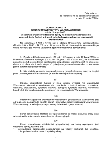 Załącznik nr 1 do Protokołu nr 35 posiedzenia Senatu w dniu 21 maja 2008 r. UCHWAŁA NR 373 SENATU UNIWERSYTETU WARSZAWSKIEGO z dnia 21 maja 2008 r. w sprawie kryteriów udzielania zgody na dodatkowe zatrudnienie oraz pełnienie funkcji w innych szkołach wyższych przez nauczycieli akademickich Na podstawie § 102 i § 106 ust. 2 Statutu Uniwersytetu Warszawskiego (Monitor UW z 2006 r. Nr 7A, poz. 94 ze zm.), Senat Uniwersytetu Warszawskiego ustala następujące kryteria udzielania zgody na dodatkowe zatrudnienie: §1 1. Zgoda, o której mowa w art. 129 ust. 1 i 2 ustawy z dnia 27 lipca 2005 r. – Prawo o szkolnictwie wyższym (Dz. U. Nr 164, poz. 1365 z późn. zm.), na dodatkowe zatrudnienie lub prowadzenie działalności gospodarczej udzielana jest na okres nie dłuższy niż dwa lata i może dotyczyć tylko jednego zatrudnienia albo prowadzenia jednej działalności gospodarczej. 2. Nie udziela się zgody na zatrudnienie w ramach stosunku pracy w drugiej poza Uniwersytetem Warszawskim (w sumie trzeciej) szkole wyższej. §2 Objęcie jakiejkolwiek funkcji w innej szkole wyższej niż Uniwersytet Warszawski stanowi uzasadnienie dla odwołania z funkcji rektora, prorektora, dziekana, prodziekana, dyrektora instytutu, zastępcy dyrektora instytutu, kierownika katedry lub kierownika zakładu, pełnionych na Uniwersytecie Warszawskim. §3 Udzielenie zgody na prowadzenie działalności gospodarczej uzależnione jest od tego, czy nie zachodzi konflikt zadań i interesów między zadaniami Uniwersytetu Warszawskiego a rodzajem podejmowanej działalności gospodarczej. §4 Senat zobowiązuje Rektora do wprowadzenia do treści stosunku pracy oraz w treści aktów mianowania klauzul antykonkurencyjnych. §5 Przez prowadzenie działalności gospodarczej, na którą wymagane jest uzyskanie zgody, rozumie się: 1) prowadzenie działalności gospodarczej na własny rachunek lub wspólnie z innymi osobami w ramach spółki cywilnej; 1 2) posiadanie statusu wspólnika spółki handlowej osobowej, o ile wspólnik taki ma prawo i obowiązek prowadzenia spraw spółki (z pominięciem partnerów spółki partnerskiej, w której ustanowiono zarząd, komandytariuszy w spółce komandytowej, akcjonariuszy w spółce komandytowo-akcyjnej, oraz innych wspólników pozbawionych prawa prowadzenia spraw spółki). §6 1) 2) Uchwała wchodzi w życie: w zakresie § 1 i 2 z dniem 1 października 2008 r.; w zakresie § 3 i 5 z dniem podjęcia. Załącznik nr 2 do Protokołu nr 35 posiedzenia Senatu w dniu 21 maja 2008 r. UCHWAŁA NR 374 SENATU UNIWERSYTETU WARSZAWSKIEGO z dnia 21 maja 2008 r. w sprawie konfliktu interesów lub konfliktu zobowiązań Na podstawie § 106 ust. 2 Statutu Uniwersytetu Warszawskiego (Monitor UW z 2006 r. Nr 7A, poz. 94 ze zm.), Senat Uniwersytetu Warszawskiego postanawia, co następuje: §1 Uznaje, że: 1) konflikt zobowiązań polega na niemożliwości poświęcenia dostatecznej ilości czasu na zajęcia uniwersyteckie, spowodowanej podejmowaniem zobowiązań zewnętrznych w zakresie pracy zawodowej, dydaktycznej, badawczej, konsultacyjnej lub społeczno-organizacyjnej; 2) konflikt interesów ma miejsce, jeśli istnieje rozbieżność między indywidualnym interesem pracownika a jego zobowiązaniami w stosunku do Uniwersytetu. W pewnych sytuacjach konflikt zobowiązań i konflikt interesów mogą występować jednocześnie. §2 Zobowiązuje Rady Wydziałów do określenia – w terminie sześciu miesięcy od rozpoczęcia kadencji 2008-2012 władz Uczelni – potencjalnych sytuacji, w których może wystąpić konflikt zobowiązań lub konflikt interesów, biorąc w szczególności pod uwagę: 1) czy podejmowanie zobowiązań zewnętrznych w zakresie pracy zawodowej, dydaktycznej, badawczej, konsultacyjnej lub społeczno-organizacyjnej, niezależnie od ich charakteru, nie prowadzi do ograniczenia aktywności niezbędnej do wypełniania określonych ustawą z dnia 27 lipca 2005 r. – Prawo o szkolnictwie wyższym (Dz. U. Nr 164, poz. 1365 ze zm.) zadań badawczych, dydaktycznych i organizacyjnych w zakresie gwarantującym wysoki poziom nauki i dydaktyki oraz funkcjonowania wydziału; 2 2) czy pracownik nie uczestniczy w działalności jednostek, których interesy są sprzeczne z interesami Uniwersytetu Warszawskiego; 3) jakiej instytucji przypisywane są wyniki pracy (problem własności intelektualnej). §3 Uznaje, że przestrzeganie zachowań bezkonfliktowych pracowników: 1) afiliacji publikacji naukowych przy Uniwersytecie Warszawskim; 2) afiliacji wystąpień publicznych przy Uniwersytecie Warszawskim. wymaga od §4 Uznaje, że naruszenie przez pracownika zobowiązań wynikających z § 106 ust. 1 Statutu UW może prowadzić, w zależności od charakteru naruszenia, do: 1) ograniczenia awansu; 2) wprowadzenia do arkusza oceny pracownika adnotacji o podjęciu pracy naruszającej interes lub zobowiązania wobec Uniwersytetu Warszawskiego; 3) nie przedłużania zatrudnienia pracownikom zatrudnionym na czas określony; 4) w drastycznych sytuacjach, do skierowania sprawy do komisji dyscyplinarnej. §5 Zobowiązuje Rektora do: 1) powołania rektorskiej komisji do oceny konfliktu interesów, która działałaby ad hoc na zlecenie Rektora lub zainteresowanego pracownika i wydawała decyzje o tym, czy zachodzi czy też nie zachodzi w konkretnej sytuacji konflikt zobowiązań lub konflikt interesów; 2) wprowadzenia do arkusza ocen pracowników Uniwersytetu Warszawskiego kryterium pracy dodatkowej. §6 Uchwała wchodzi w życie z dniem podjęcia. 3 Załącznik nr 3 do Protokołu nr 35 posiedzenia Senatu w dniu 21 maja 2008 r. UCHWAŁA NR 375 SENATU UNIWERSYTETU WARSZAWSKIEGO z dnia 21 maja 2008 r. w sprawie zmiany Uchwały nr 218 Senatu UW z dnia 23 maja 2007 r. w sprawie zasad rekrutacji na studia doktoranckie na Uniwersytecie Warszawskim w roku akademickim 2007/2008 oraz 2008/2009 Na podstawie art. 196 ust. 2, w związku z art. 169 ust. 2 ustawy z dnia 27 lipca 2005 r. – Prawo o szkol