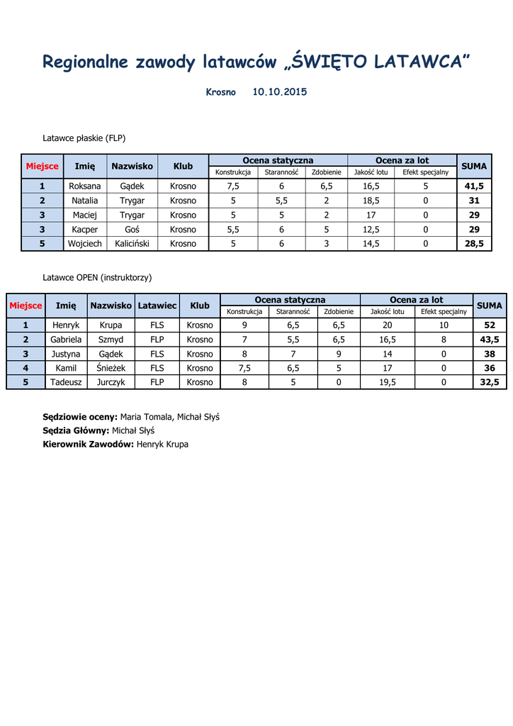Regionalne zawody latawców „ŚWIĘTO LATAWCA” Krosno 10.10.2015 Latawce płaskie (FLP) Miejsce Imię Nazwisko Klub 1 Roksana Gądek 2 Natalia 3 Ocena statyczna Ocena za lot SUMA Konstrukcja Staranność Zdobienie Jakość lotu Efekt specjalny Krosno 7,5 6 6,5 16,5 5 41,5 Trygar Krosno 5 5,5 2 18,5 0 31 Maciej Trygar Krosno 5 5 2 17 0 29 3 Kacper Goś Krosno 5,5 6 5 12,5 0 29 5 Wojciech Kaliciński Krosno 5 6 3 14,5 0 28,5 Latawce OPEN (instruktorzy) Miejsce Imię Nazwisko Latawiec 1 Henryk Krupa FLS 2 Gabriela Szmyd 3 Justyna 4 5 Klub Ocena statyczna Ocena za lot SUMA Konstrukcja Staranność Zdobienie Jakość lotu Efekt specjalny Krosno 9 6,5 6,5 20 10 52 FLP Krosno 7 5,5 6,5 16,5 8 43,5 Gądek FLS Krosno 8 7 9 14 0 38 Kamil Śnieżek FLS Krosno 7,5 6,5 5 17 0 36 Tadeusz Jurczyk FLP Krosno 8 5 0 19,5 0 32,5 Sędziowie oceny: Maria Tomala, Michał Słyś Sędzia Główny: Michał Słyś Kierownik Zawodów: Henryk Krupa