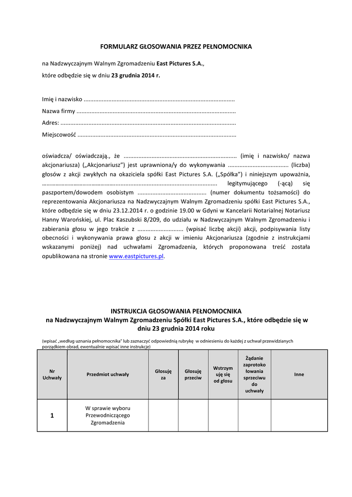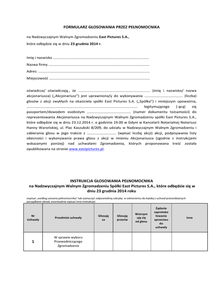 FORMULARZ)GŁOSOWANIA)PRZEZ)PEŁNOMOCNIKA) na'Nadzwyczajnym'Walnym'Zgromadzeniu'East)Pictures)S.A.,'' które'odbędzie'się'w'dniu'23)grudnia)2014)r.) ) Imię'i'nazwisko'............................................................................................) Nazwa'firmy'.................................................................................................' Adres:'...........................................................................................................' Miejscowość'.................................................................................................' ' oświadcza/' oświadczają.,' że' .....................................................................' (imię' i' nazwisko/' nazwa' akcjonariusza)' („Akcjonariusz”)' jest' uprawniona/y' do' wykonywania' .....................................' (liczba)' głosów' z' akcji' zwykłych' na' okaziciela' spółki' East' Pictures' S.A.' („Spółka”)' i' niniejszym' upoważnia,' …………………………………………...............................................................' legitymującego' (fącą)' się' paszportem/dowodem' osobistym' ..........................................' (numer' dokumentu' tożsamości)' do' reprezentowania' Akcjonariusza' na' Nadzwyczajnym' Walnym' Zgromadzeniu' spółki' East' Pictures' S.A.,' które'odbędzie'się'w'dniu'23.12.2014'r.'o'godzinie'19.00'w'Gdyni'w'Kancelarii'Notarialnej'Notariusz' Hanny' Warońskiej,' ul.' Plac' Kaszubski' 8/209,' do' udziału' w' Nadzwyczajnym' Walnym' Zgromadzeniu' i' zabierania' głosu' w' jego' trakcie' z' ............................' (wpisać' liczbę' akcji)' akcji,' podpisywania' listy' obecności' i' wykonywania' prawa' głosu' z' akcji' w' imieniu' Akcjonariusza' (zgodnie' z' instrukcjami' wskazanymi' poniżej)' nad' uchwałami' Zgromadzenia,' których' proponowana' treść' została' opublikowana'na'stronie'www.eastpictures.pl.' ' ' ' ' ' INSTRUKCJA)GŁOSOWANIA)PEŁNOMOCNIKA) )na)Nadzwyczajnym)Walnym)Zgromadzeniu)Spółki)East)Pictures)S.A.,)które)odbędzie)się)w) dniu)23)grudnia)2014)roku) (wpisać „według uznania pełnomocnika” lub zaznaczyć odpowiednią rubrykę w odniesieniu do każdej z uchwał przewidzianych porządkiem obrad, ewentualnie wpisać inne instrukcje) Nr) Uchwały) Przedmiot)uchwały) Głosuję) za) Głosuję) przeciw) Wstrzym uję)się) od)głosu) Żądanie) zaprotoko łowania) sprzeciwu) do) uchwały) 1' W'sprawie'wyboru' Przewodniczącego' Zgromadzenia' ' ' ' ' Inne) ' 2) W'sprawie'odstąpienia'od' wyboru'komisji'skrutacyjnej.' ' ' ' ' ' 3' W'sprawie'przyjęcia' porządku'obrad' ' ' ' ' ' 4) W'sprawie'zatwierdzenia' sprawozdania'Zarządu'Spółki' z'działalności'za'rok'2013' ' ' ' ' ' 5' W'sprawie'zatwierdzenia' sprawozdania'finansowego' Spółki'za'rok'2013' ' ' ' ' ' 6) W'sprawie'pokrycia'straty'za' rok'2013' ' ' ' ' ' 7) W'sprawie'udzielenia' absolutorium'Prezesowi' Zarządu'za'rok'2013' ' ' ' ' ' 8) W'sprawie'udzielenia' absolutorium'za'rok'2013' Członkom'Rady'Nadzorczej' ' ' ' ' ' 9) W'sprawie'zmian'w'składzie' Rady'Nadzorczej' ' ' ' ' ' 10) W'sprawie'kontynuacji' działalności'Spółki' ' ' ' ' ' 11) W'sprawie'podwyższenia' kapitału'zakładowego' poprzez'emisję'akcji'serii'F'i' udzielenia'upoważnienia' Zarządowi'Spółki' ' ' ' ' ' 12) W'sprawie'wyłączenia'prawa' poboru'dla'dotychczasowych' akcjonariuszy' ' ' ' ' ' 13) W'sprawie'zmiany'statutu' Spółki' ' ' ' ' ' 14) W'sprawie'upoważnienia' Rady'Nadzorczej'do' sporządzenia'tekstu' jednolitego'statutu'Spółki' ' ' ' ' ' 15) W'sprawie'wyrażenia'zgody' na'dematerializację'praw'do' akcji'(PDA)' oraz'akcji'serii'F' oraz'ubieganie'się'o' wprowadzenie'do'obrotu' w'Alternatywnym'Systemie' Obrotu'NEWCONNECT' prowadzonym'przez'Giełdę' Papierów'Wartościowych'w' Warszawie'S.A.' ' ' ' ' ' ' 16) W'sprawie'udzielenia' Zarządowi'Spółki' upoważnienia'do'podjęcia' wszelkich'czynności' prawnych'i'organizacyjnych' zmierzających'do' dematerializacji'praw'do' akcji'(PDA)'oraz'akcji'serii'F,' oraz' ubiegania'się'o' wprowadzenie'praw'do'akcji' (PDA)'oraz'akcji'serii'F'do' obrotu'w'Alternatywnym' Systemie'Obrotu' NEWCONNECT' prowadzonym'przez'Giełdę' Papierów'Wartościowych'w' Warszawie'S.A.' ' ' ' ' ' ' ' Załącznik:'oryginał'imiennego'zaświadczenia'o'prawie'uczestnictwa'w'walnym'zgromadzeniu.'' Imię'i'nazwisko'Mocodawcy:'....................................................'' ' Stanowisko:'................................................................................' ' Data:'...........................................................................................' ' ' Podpis:'........................................................................................' UWAGA:'NINIEJSZE'PEŁNOMOCNICTWO'JEST'NIESKUTECZNE,'GDY'NAZWISKO/'NAZWA'AKCJONARIUSZA'WSKAZANE'W'PEŁNOMOCNICTWIE'NIE'JEST'TAKIE' SAMO'JAK'NAZWISKO/'NAZWA'AKCJONARIUSZA'ZNAJDUJĄCE'SIĘ'NA'WYKAZIE'AKCJONARIUSZY'SPORZĄDZONYM'I'PRZEKAZANYM'SPÓŁCE'PRZEZ'KRAJOWY' DEPOZYT'PAPIERÓW'WARTOŚCIOWYCH'S.A.,'O'KTÓRYM'MOWA'W'ART.'406³'§'6'KODEKSU'SPÓŁEK'HANDLOWYCH.' '