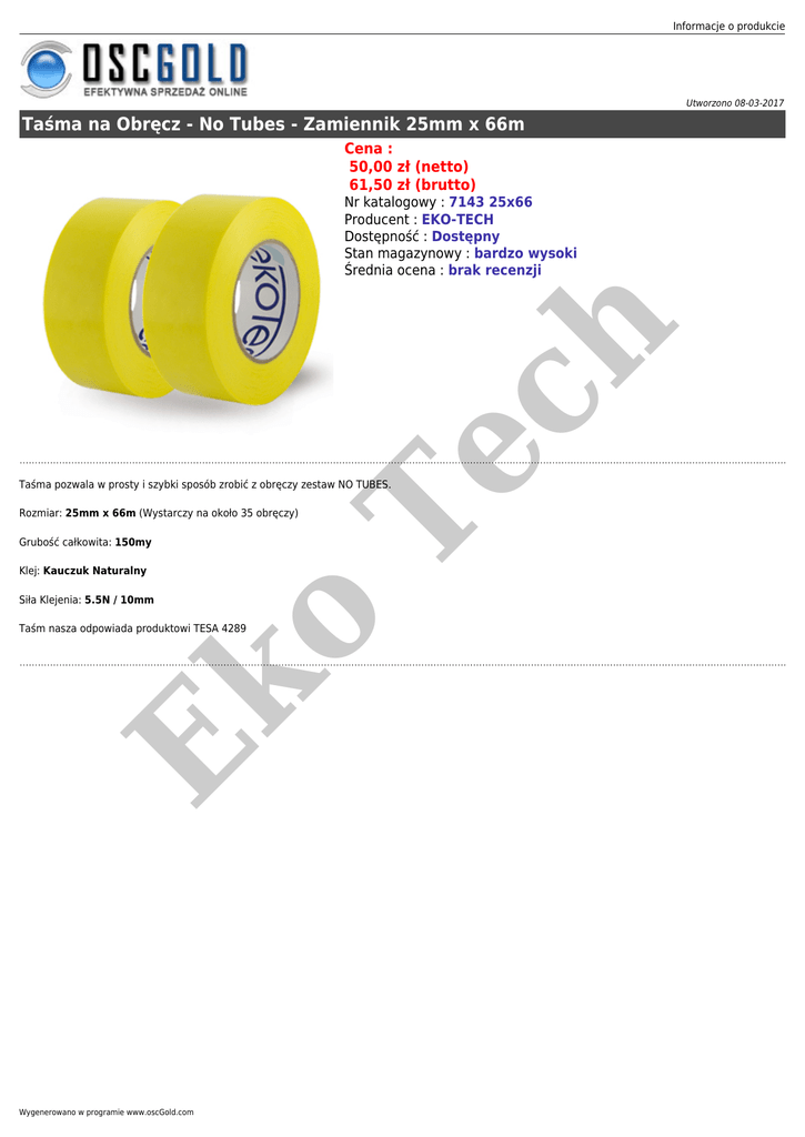 Informacje o produkcie Utworzono 08-03-2017 Taśma na Obręcz - No Tubes - Zamiennik 25mm x 66m Cena : 50,00 zł (netto) 61,50 zł (brutto) Te ch Nr katalogowy : 7143 25x66 Producent : EKO-TECH Dostępność : Dostępny Stan magazynowy : bardzo wysoki Średnia ocena : brak recenzji Taśma pozwala w prosty i szybki sposób zrobić z obręczy zestaw NO TUBES. Rozmiar: 25mm x 66m (Wystarczy na około 35 obręczy) Grubość całkowita: 150my Klej: Kauczuk Naturalny o Siła Klejenia: 5.5N / 10mm Ek Taśm nasza odpowiada produktowi TESA 4289 Wygenerowano w programie www.oscGold.com