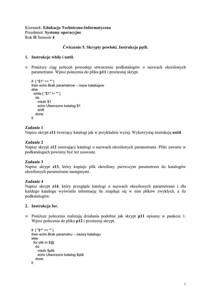 Kierunek: Edukacja Techniczno-Informatyczna Przedmiot: Systemy operacyjne Rok II Semestr 4 Ćwiczenie 5. Skrypty powłoki. Instrukcja pętli. 1. Instrukcje while i until. • PoniŜszy ciąg poleceń powoduje utworzenie podkatalogów o nazwach określonych parametrami. Wpisz polecenia do pliku p11 i przetestuj skrypt. if [ "$1" == "" ] then echo Brak parametrow – nazw katalogow else while [ "$1" != "" ] do mkdir $1 echo Utworzono katalog $1 shift done fi Zadanie 1 Napisz skrypt z11 tworzący katalogi jak w przykładzie wyŜej. Wykorzystaj instrukcję until. Zadanie 2 Napisz skrypt z12 usuwający katalogi o nazwach określonych parametrami. Pliki zawarte w podkatalogach powinny być teŜ usuwane. Zadanie 3 Napisz skrypt z13, który kopiuje plik określony pierwszym parametrem do katalogów określonych parametrami następnymi. Zadanie 4 Napisz skrypt z14, który przegląda katalogi o nazwach określonych parametrami i dla kaŜdego katalogu wyświetla informację ile znajduje się w nim plików zwykłych, a ile podkatalogów. 2. Instrukcja for. • PoniŜsze polecenia realizują działania podobne jak skrypt p11 opisany w punkcie 1. Wpisz polecenia do pliku p12 i przetestuj skrypt. if [ "$*" == "" ] then echo Brak parametru – nazwy katalogu else for plik in $@ do mkdir $plik echo Utworzono katalog $plik done fi 1 Zadanie 5 Przetestuj działanie skryptu p12 przy zapisie nagłówka instrukcji for bez frazy in ( tj. for plik ): Zadanie 6 Napisz skrypty realizujące zadania 2, 3 i 4 z uŜyciem instrukcji for. Zadanie 7 Napisz skrypt z wieloma parametrami: - pierwszy parametr – dowolne słowo - następne parametry (dowolna ilość) – nazwy katalogów Skrypt powinien przeglądać katalogi określone parametrami (drugim i następnymi) oraz dla kaŜdego katalogu wyświetlać informację ile znajduje się w nim plików zawierających słowo określone parametrem pierwszym. Wykorzystaj polecenie grep z opcją –l. • PoniŜszy ciąg poleceń powoduje przeglądanie plików zwykłych w katalogu bieŜącymi i wyświetlanie informacji o wielkości kaŜdego z nich. Zapisz ciąg poleceń do pliku o nazwie p13, a następnie przetestuj skrypt: for plik in `ls` do if [ -f $plik ] then wc -c $plik fi done Zadanie 8 Napisz skrypt z19, który przegląda podkatalogi w katalogu bieŜącym i wyznacza ile kaŜdy z nich zawiera plików zwykłych. 2