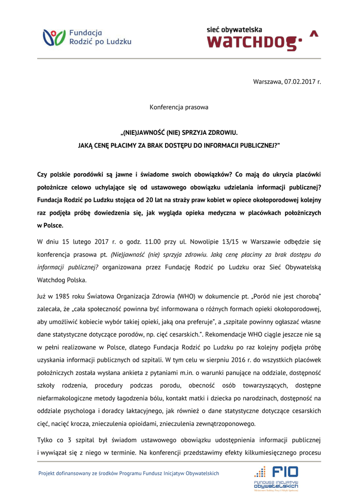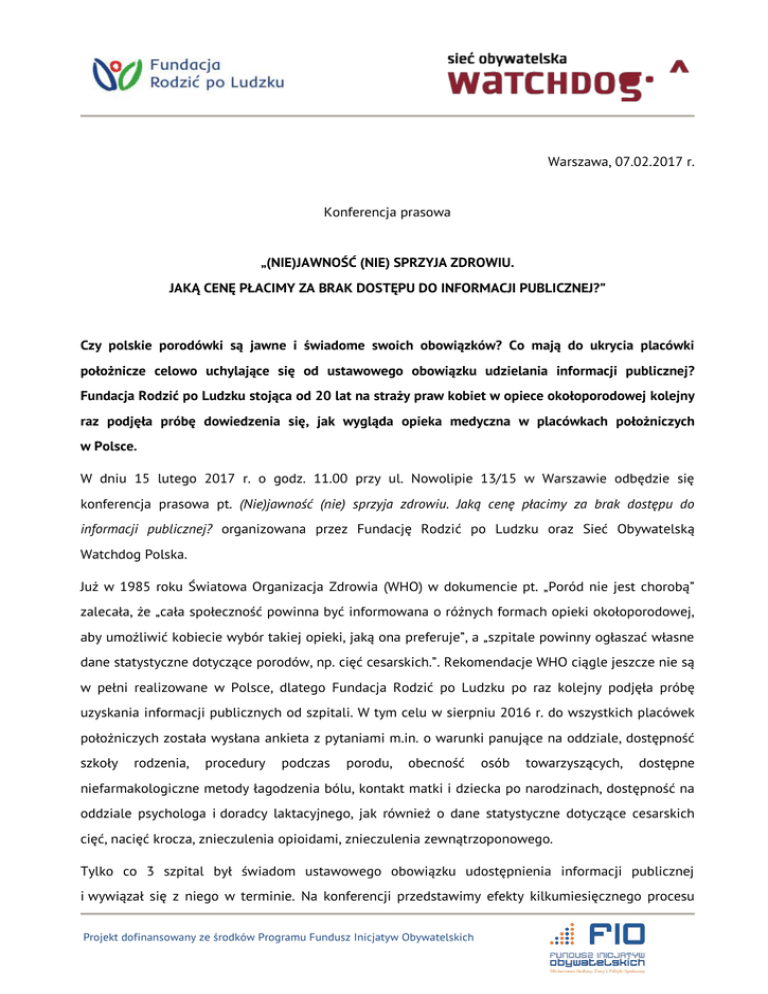 Warszawa, 07.02.2017 r. Konferencja prasowa „(NIE)JAWNOŚĆ (NIE) SPRZYJA ZDROWIU. JAKĄ CENĘ PŁACIMY ZA BRAK DOSTĘPU DO INFORMACJI PUBLICZNEJ?” Czy polskie porodówki są jawne i świadome swoich obowiązków? Co mają do ukrycia placówki położnicze celowo uchylające się od ustawowego obowiązku udzielania informacji publicznej? Fundacja Rodzić po Ludzku stojąca od 20 lat na straży praw kobiet w opiece okołoporodowej kolejny raz podjęła próbę dowiedzenia się, jak wygląda opieka medyczna w placówkach położniczych w Polsce. W dniu 15 lutego 2017 r. o godz. 11.00 przy ul. Nowolipie 13/15 w Warszawie odbędzie się konferencja prasowa pt. (Nie)jawność (nie) sprzyja zdrowiu. Jaką cenę płacimy za brak dostępu do informacji publicznej? organizowana przez Fundację Rodzić po Ludzku oraz Sieć Obywatelską Watchdog Polska. Już w 1985 roku Światowa Organizacja Zdrowia (WHO) w dokumencie pt. „Poród nie jest chorobą” zalecała, że „cała społeczność powinna być informowana o różnych formach opieki okołoporodowej, aby umożliwić kobiecie wybór takiej opieki, jaką ona preferuje”, a „szpitale powinny ogłaszać własne dane statystyczne dotyczące porodów, np. cięć cesarskich.”. Rekomendacje WHO ciągle jeszcze nie są w pełni realizowane w Polsce, dlatego Fundacja Rodzić po Ludzku po raz kolejny podjęła próbę uzyskania informacji publicznych od szpitali. W tym celu w sierpniu 2016 r. do wszystkich placówek położniczych została wysłana ankieta z pytaniami m.in. o warunki panujące na oddziale, dostępność szkoły rodzenia, procedury podczas porodu, obecność osób towarzyszących, dostępne niefarmakologiczne metody łagodzenia bólu, kontakt matki i dziecka po narodzinach, dostępność na oddziale psychologa i doradcy laktacyjnego, jak również o dane statystyczne dotyczące cesarskich cięć, nacięć krocza, znieczulenia opioidami, znieczulenia zewnątrzoponowego. Tylko co 3 szpital był świadom ustawowego obowiązku udostępnienia informacji publicznej i wywiązał się z niego w terminie. Na konferencji przedstawimy efekty kilkumiesięcznego procesu Projekt dofinansowany ze środków Programu Fundusz Inicjatyw Obywatelskich zbierania informacji publicznych przez Fundację Rodzić po Ludzku od 400 placówek położniczych w Polsce. Sieć Obywatelska Watchdog Polska zaprezentuje wyniki badania dostępności informacji o działaniu szpitali klinicznych i szpitali z oddziałami położniczymi o III stopniu referencyjności. Jak wyglądał proces pozyskiwania danych i jakie trudności pojawiły się po drodze, które szpitale i dlaczego uchylają się od wypełnienia ustawowego obowiązku udostępnienia informacji publicznej? Ile kosztuje pozyskiwanie danych publicznych nas jako społeczeństwo? Jaką cenę płacą szpitale uchylające się od obowiązku udostępnienia obywatelom informacji? Dlaczego instytucje publiczne nie chcą współpracować z obywatelami i ujawniać informacji? Porozmawiamy także o tym, jakie znaczenie ma zbieranie danych dla jakości opieki okołoporodowej i w oparciu o co są tworzone w Polsce polityki zdrowotne w zakresie opieki nad matką i dzieckiem. Serdecznie zapraszamy! Osoba do kontaktu : Iwona Adamska-Sala [email protected] Tel. 600-251-210 Projekt dofinansowany ze środków Programu Fundusz Inicjatyw Obywatelskich Program konferencji prasowej „(NIE) JAWNOŚĆ (NIE) SPRZYJA ZDROWIU. JAKĄ CENĘ PŁACIMY ZA BRAK DOSTĘPU DO INFORMACJI PUBLICZNEJ?” 15 lutego 2017 r., godz. 11.00 Biuro Fundacji Rodzić po Ludzku: ul. Nowolipie 13/15, 00-150 Warszawa 11.00-11.15 Wprowadzenie i przywitanie gości Znaczenie zbierania danych dla jakości opieki okołoporodowej Joanna Pietrusiewicz Fundacja Rodzić po Ludzku Realizacja prawa do informacji publicznej przez placówki położnicze 11.15-11.30 11.30-11.50 Iwona Adamska-Sala Fundacja Rodzić po Ludzku Najczęstsze problemy w procesie pozyskiwania informacji publicznych w obszarze zdrowia na podstawie doświadczeń Fundacji Rodzić po Ludzku i Sieci Obywatelskiej Watchdog Polska Szymon Osowski Sieć Obywatelska Watchdog Polska Tworzenie polityk zdrowotnych w oparciu o wskaźniki opieki okołoporodowej 11.50-12.10 Katarzyna Szamotulska Instytut Matki i Dziecka Projekt dofinansowany ze środków Programu Fundusz Inicjatyw Obywatelskich